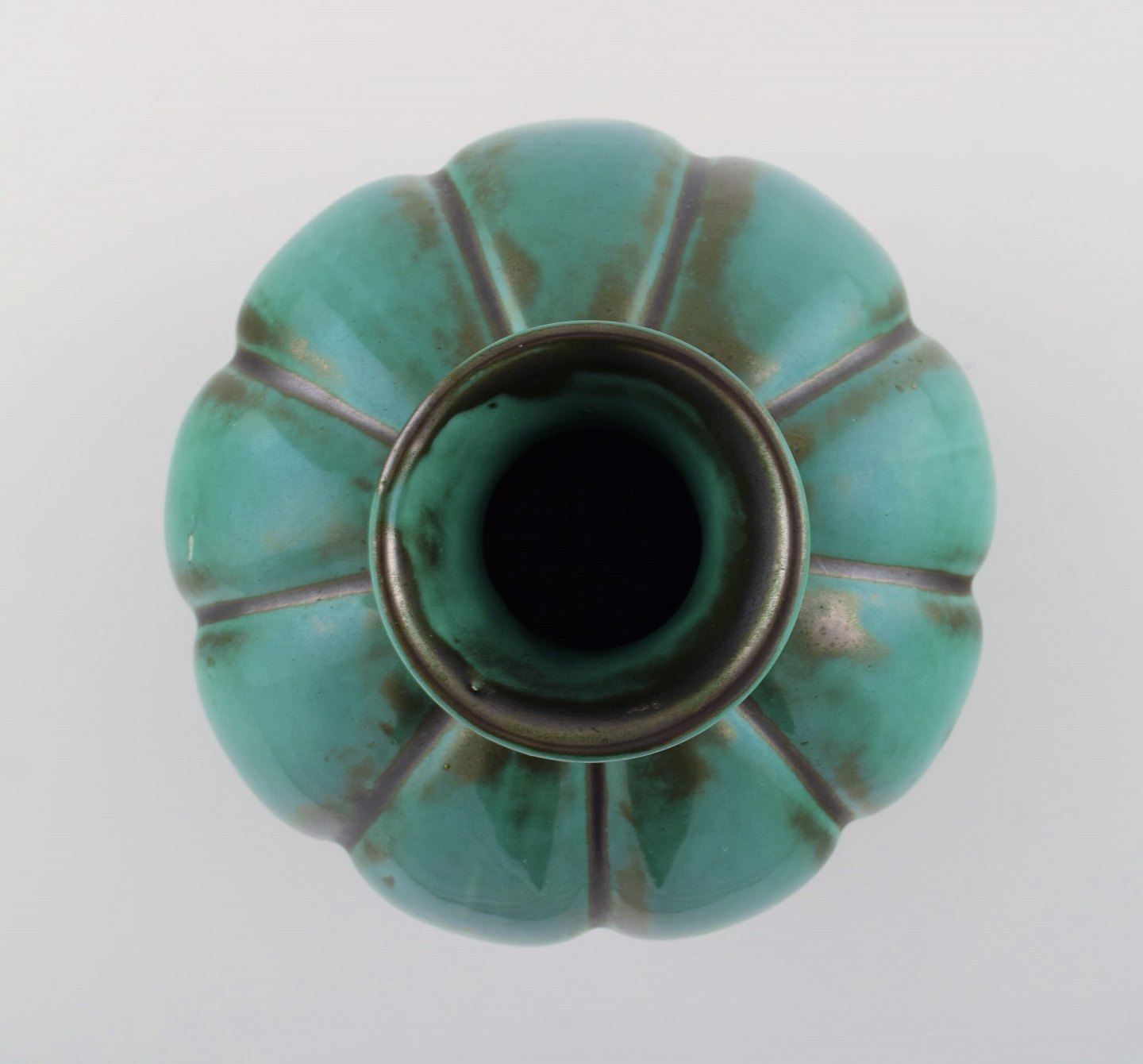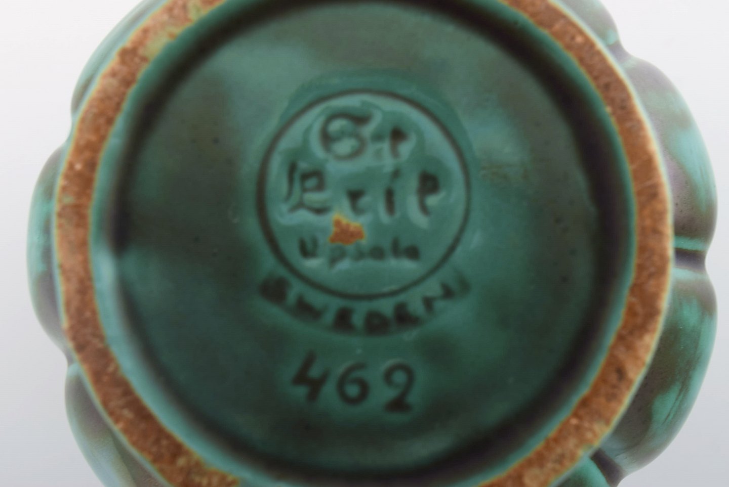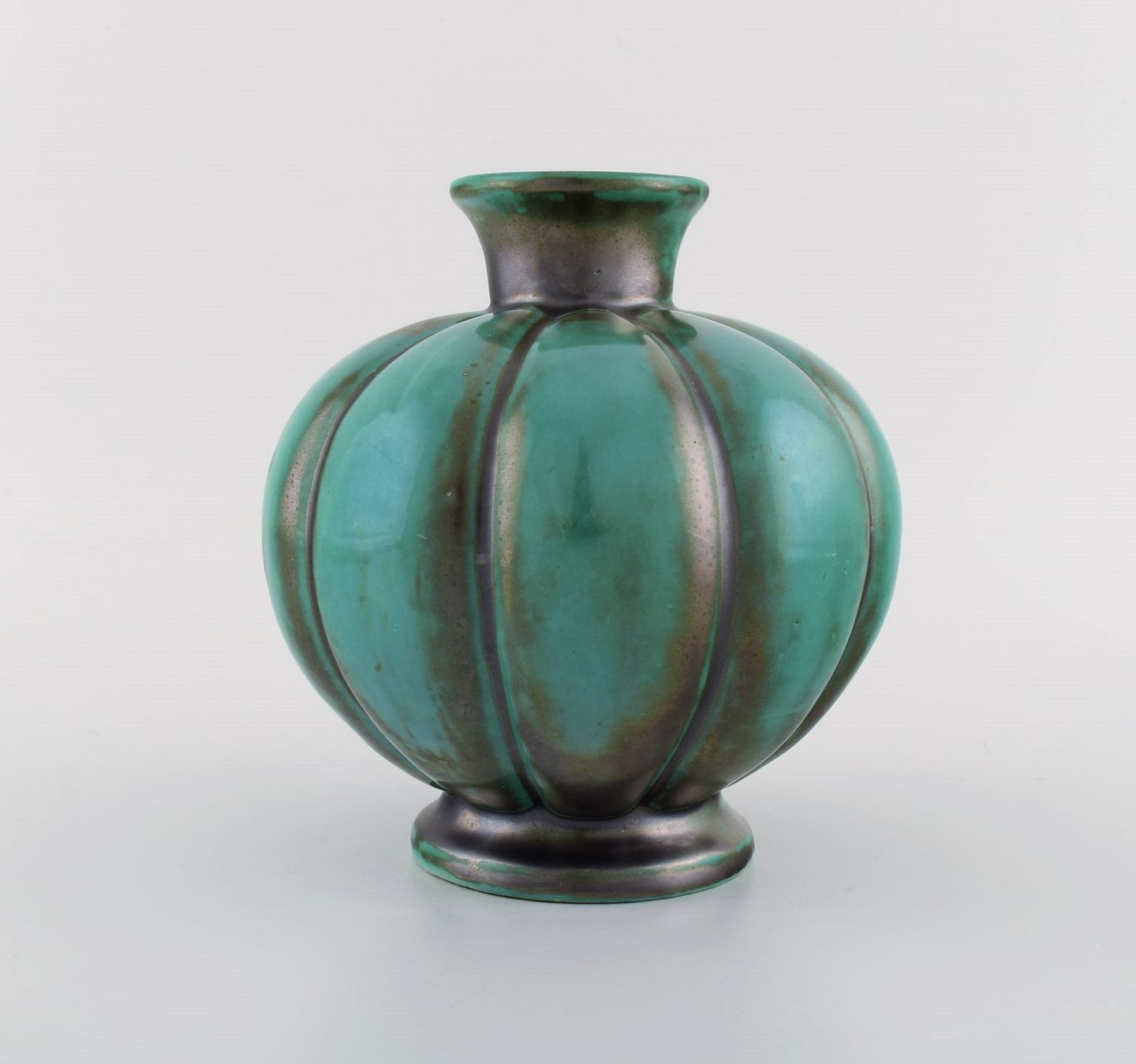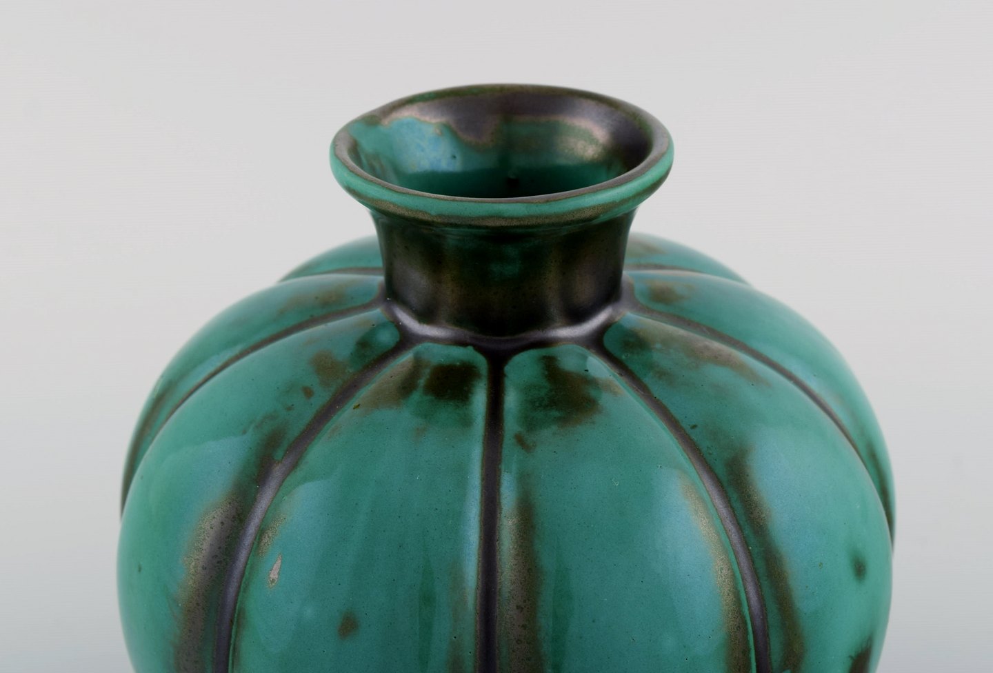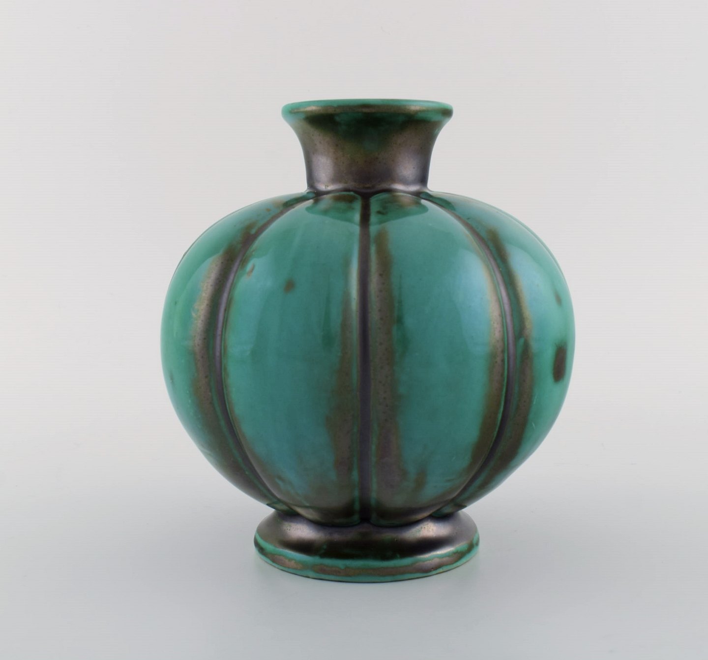 St. Erik, Upsala. Art deco vase i glaseret keramik. Sjælden form og smuk glasur i grønne nuancer. 1920'erne.