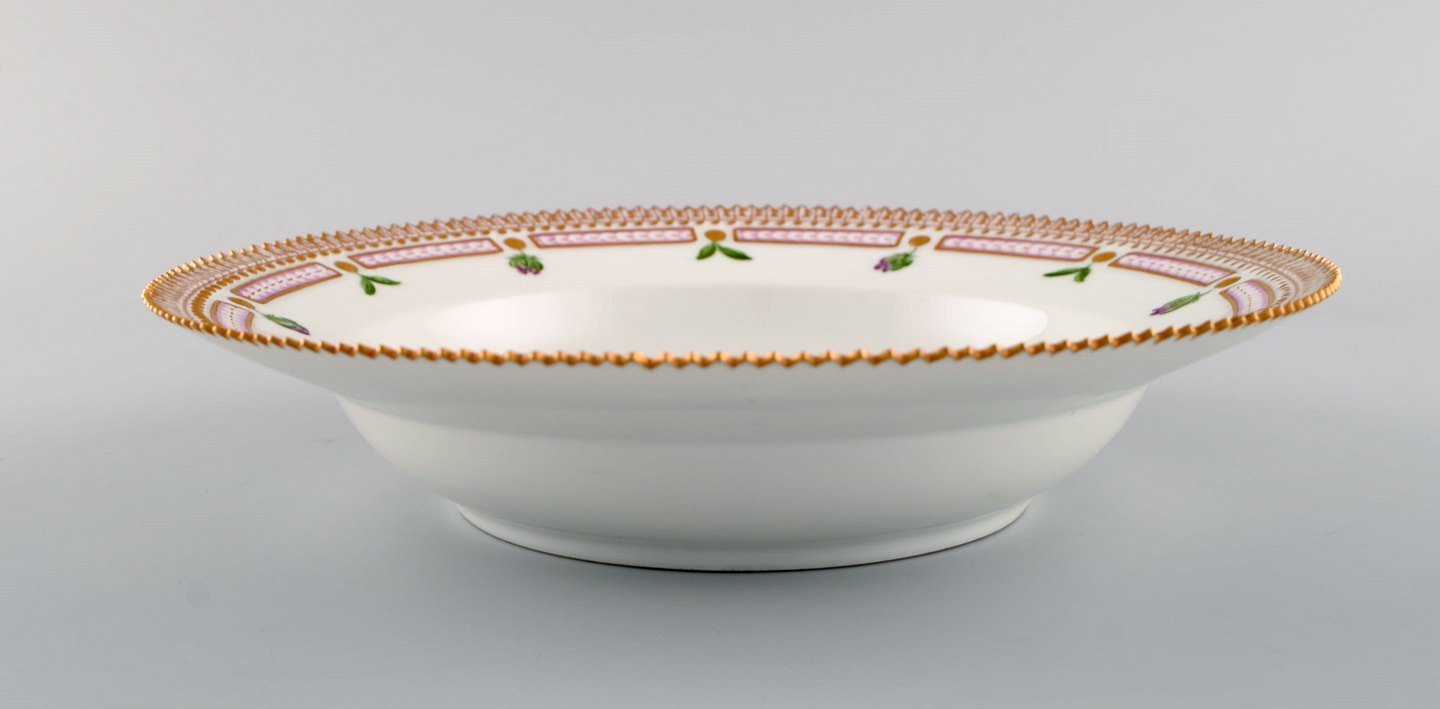 Royal Copenhagen flora danica dyb tallerken i porcelæn med håndmalede blomster og gulddekoration. Måler: 24,5 x 5,2 cm. I flot stand. 1. sortering. Stemplet.