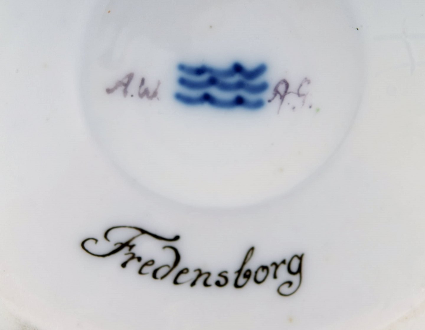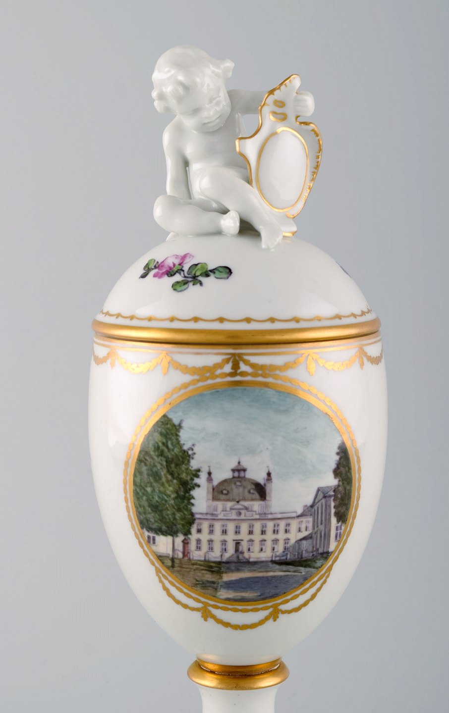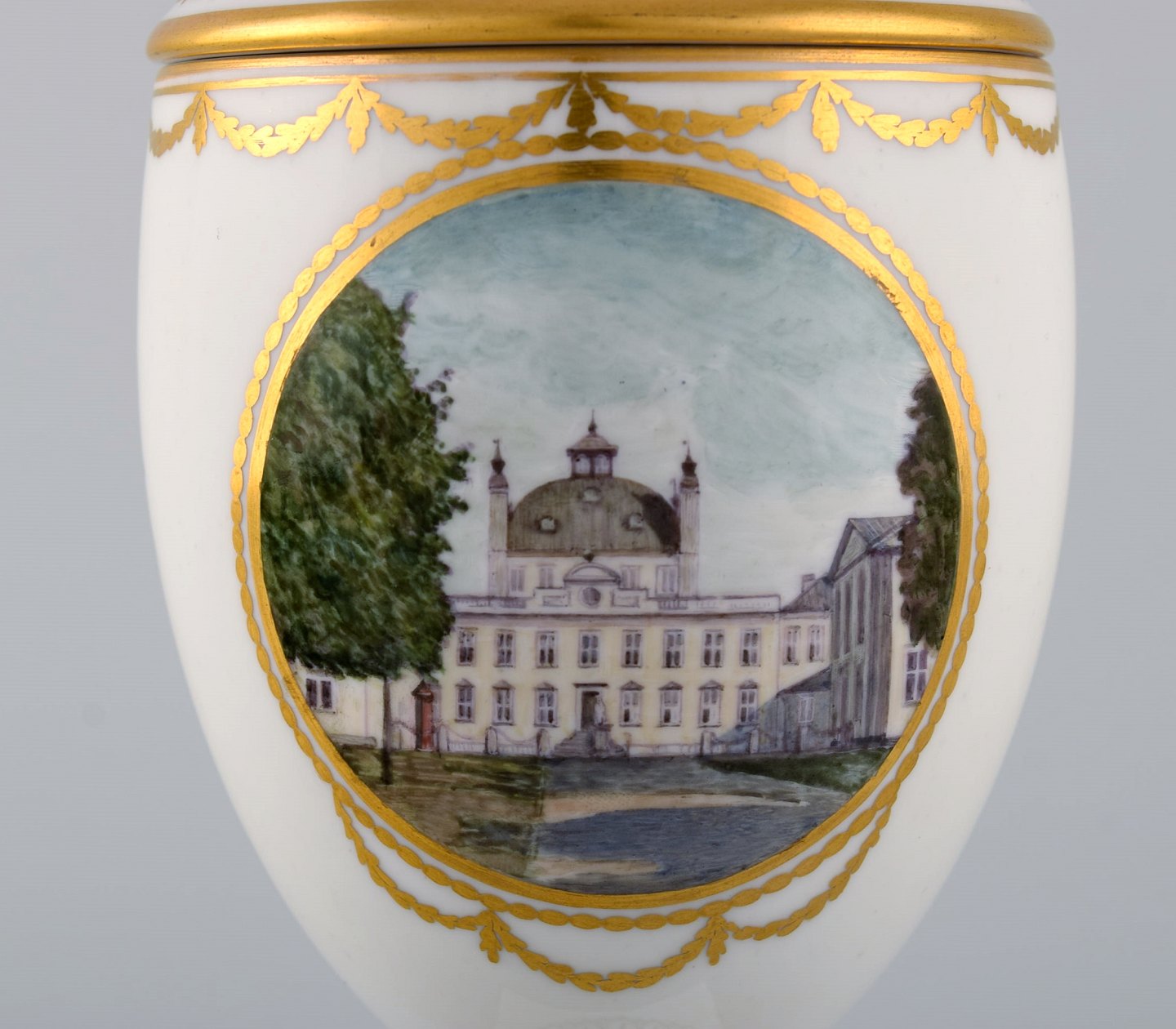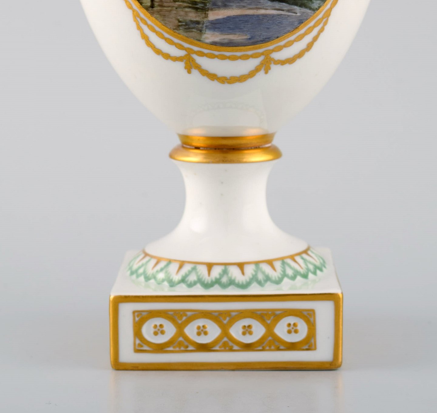 Antik Royal Copenhagen lågpokal i håndmalet porcelæn med motiv af Fredensborg slot. Sent 1800-tallet. Måler: 28,5 x 11 cm. I flot stand. Stemplet.