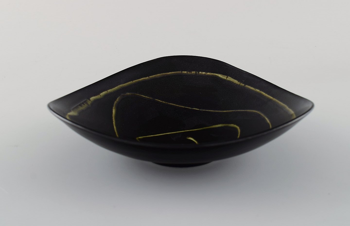Svensk keramiker. Skål i sortglaseret keramik med abstrakt motiv. 1950/60'erne.