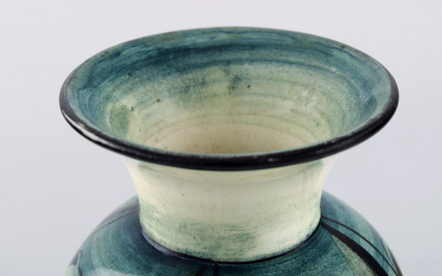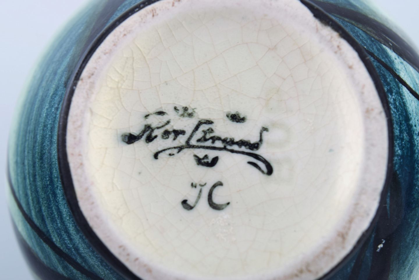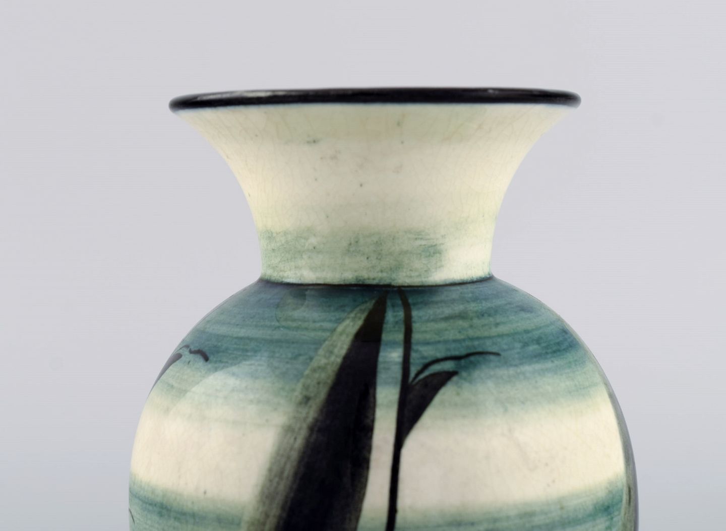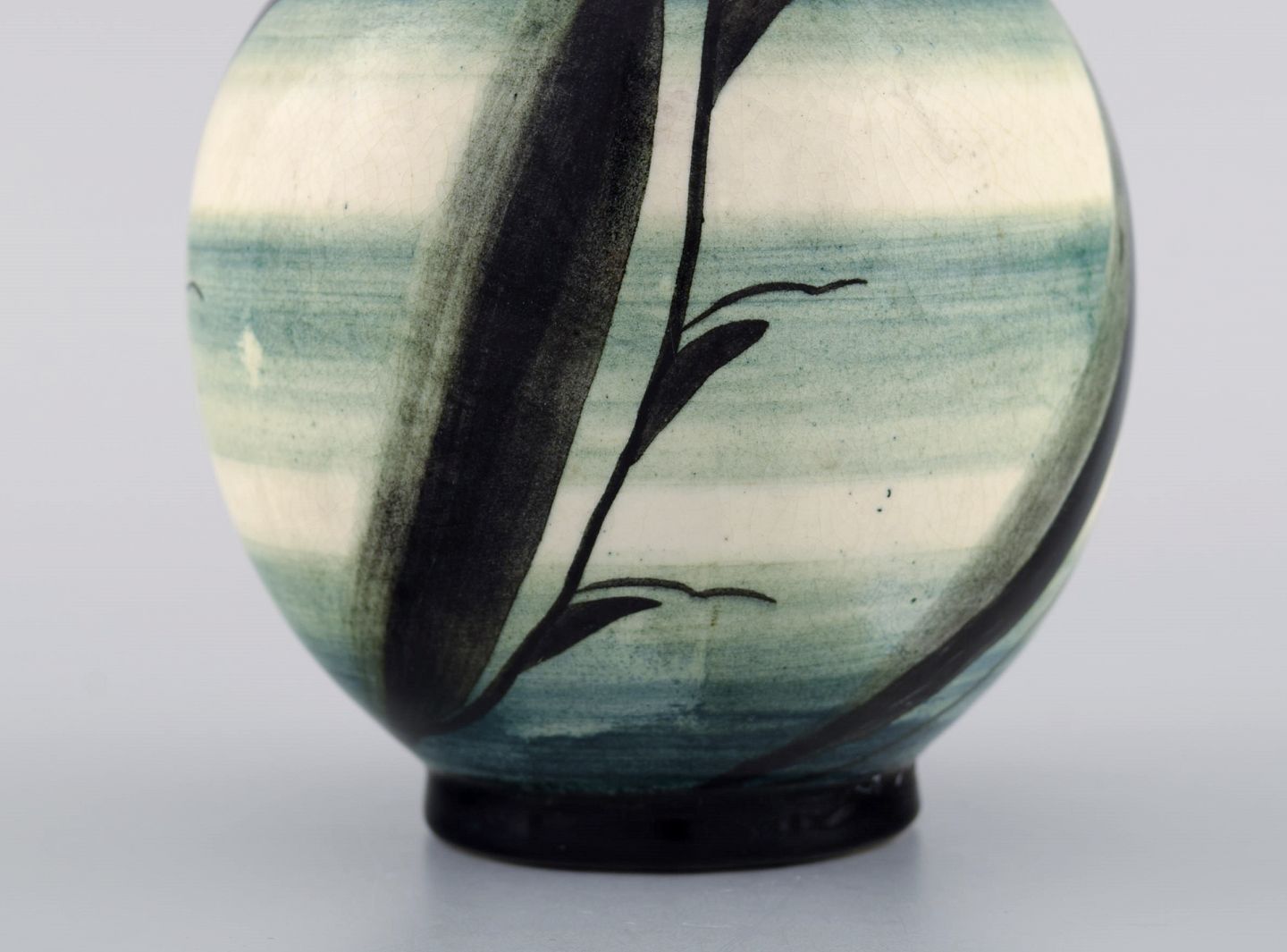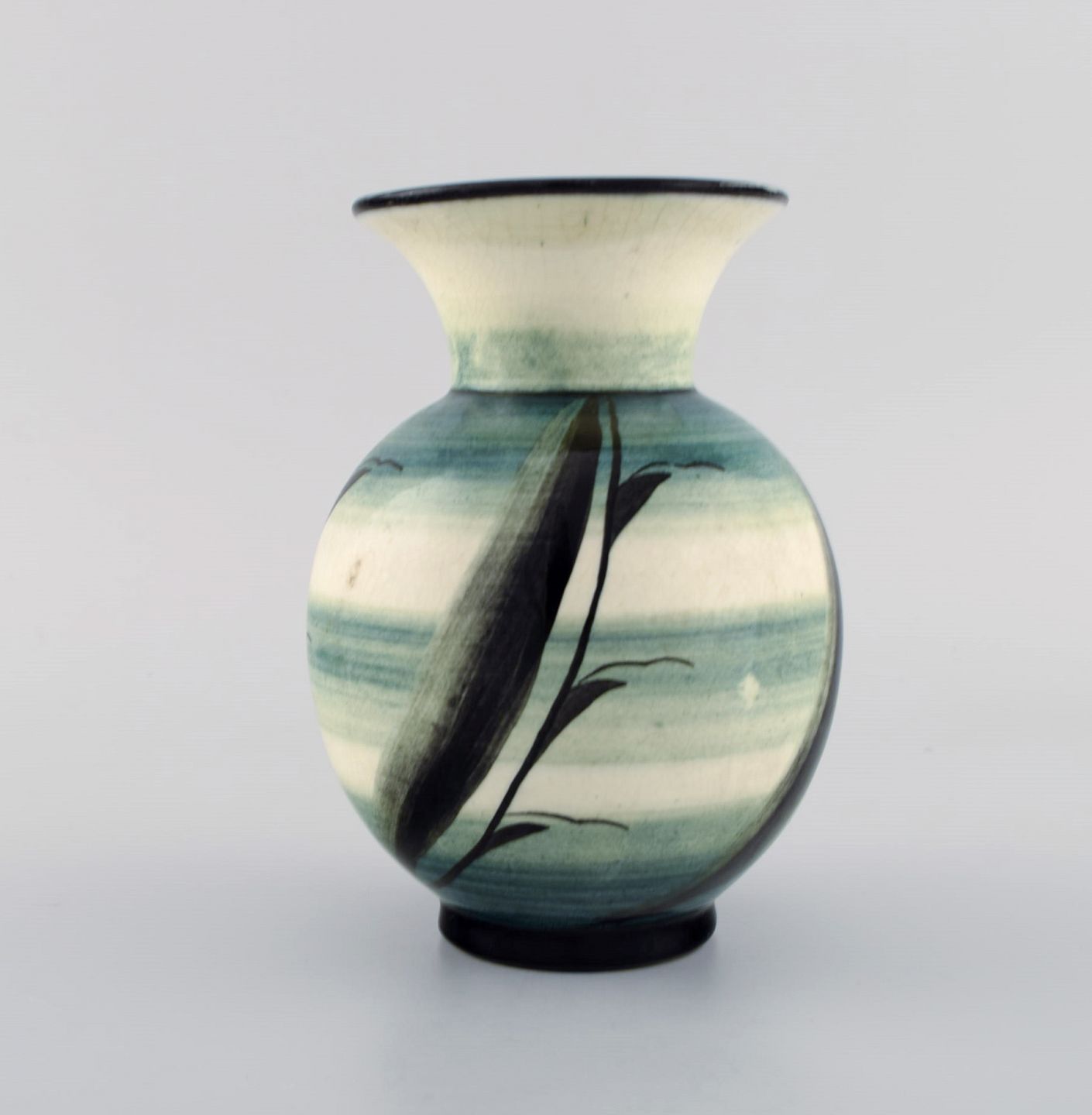 Ilse Claesson for Rörstrand. Sjælden vase i glaseret keramik. Blade på grøn og cremefarvet baggrund. 1920/30'erne. Måler: 15 x 10,5 cm. I flot stand. 1. sortering. Stemplet.