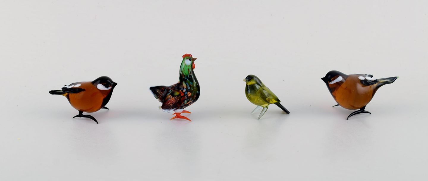 Svensk glaskunst. 11 miniature figurer i form af fugle i mundblæst kunstglas. 1970/80'erne. Største måler: 9,5 x 5 cm. I flot stand.