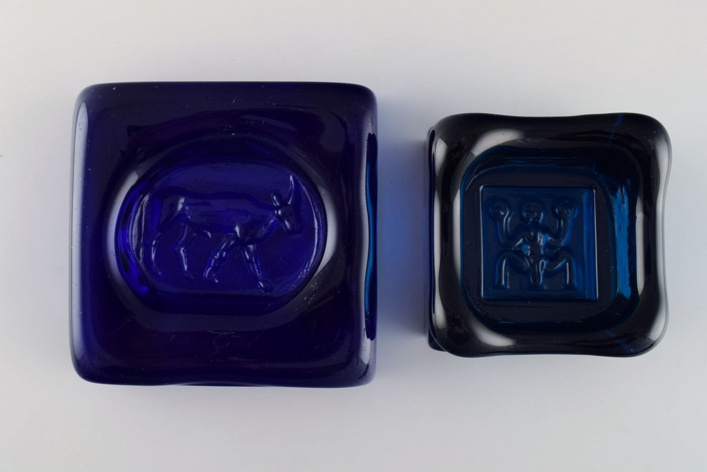 Erik Höglund (1932-1998) for Kosta Boda. Fire lave skåle i blåt mundblæst kunstglas. Svensk design 1960/70'erne. Største måler: 10 x 10 x 3 cm. I flot stand.