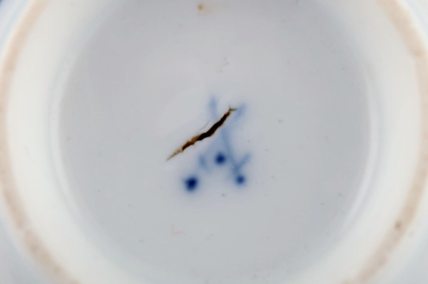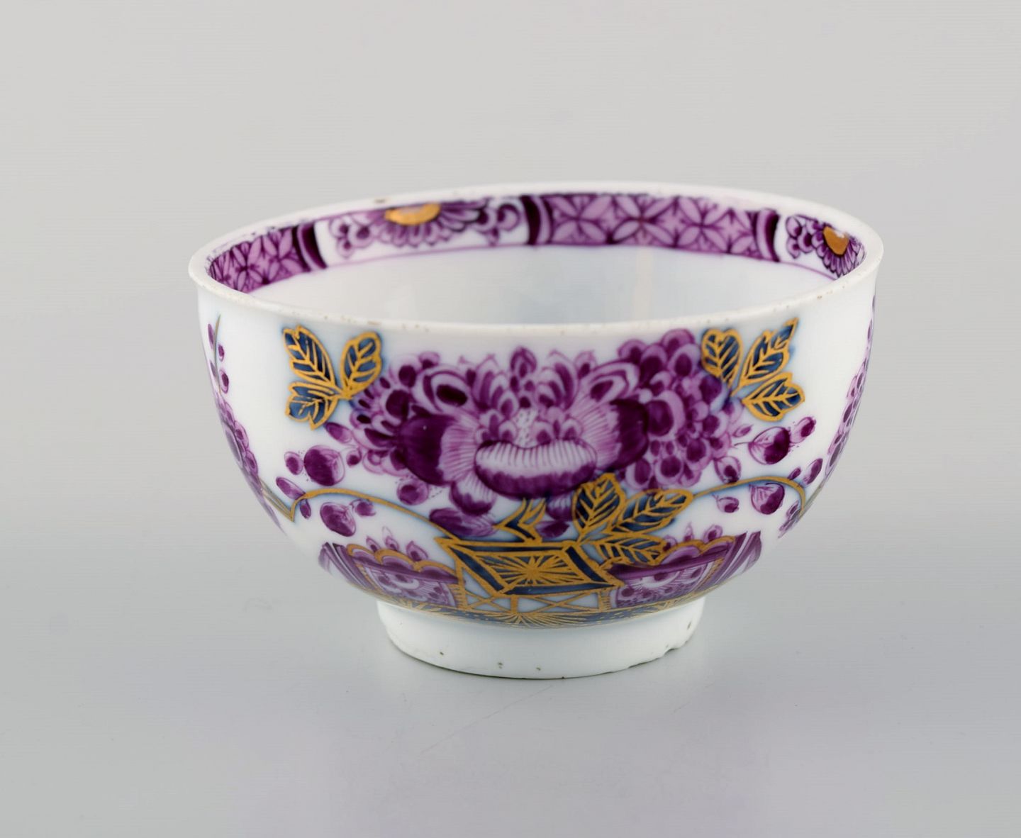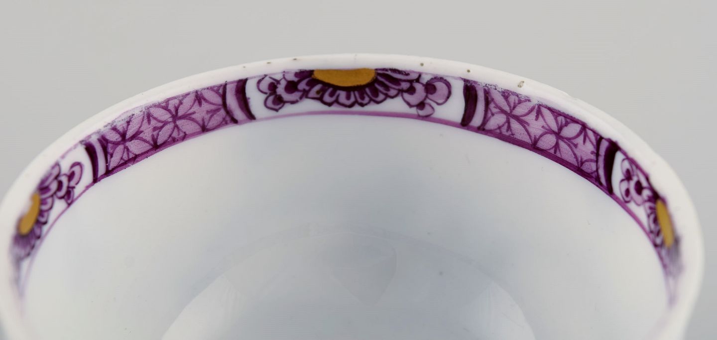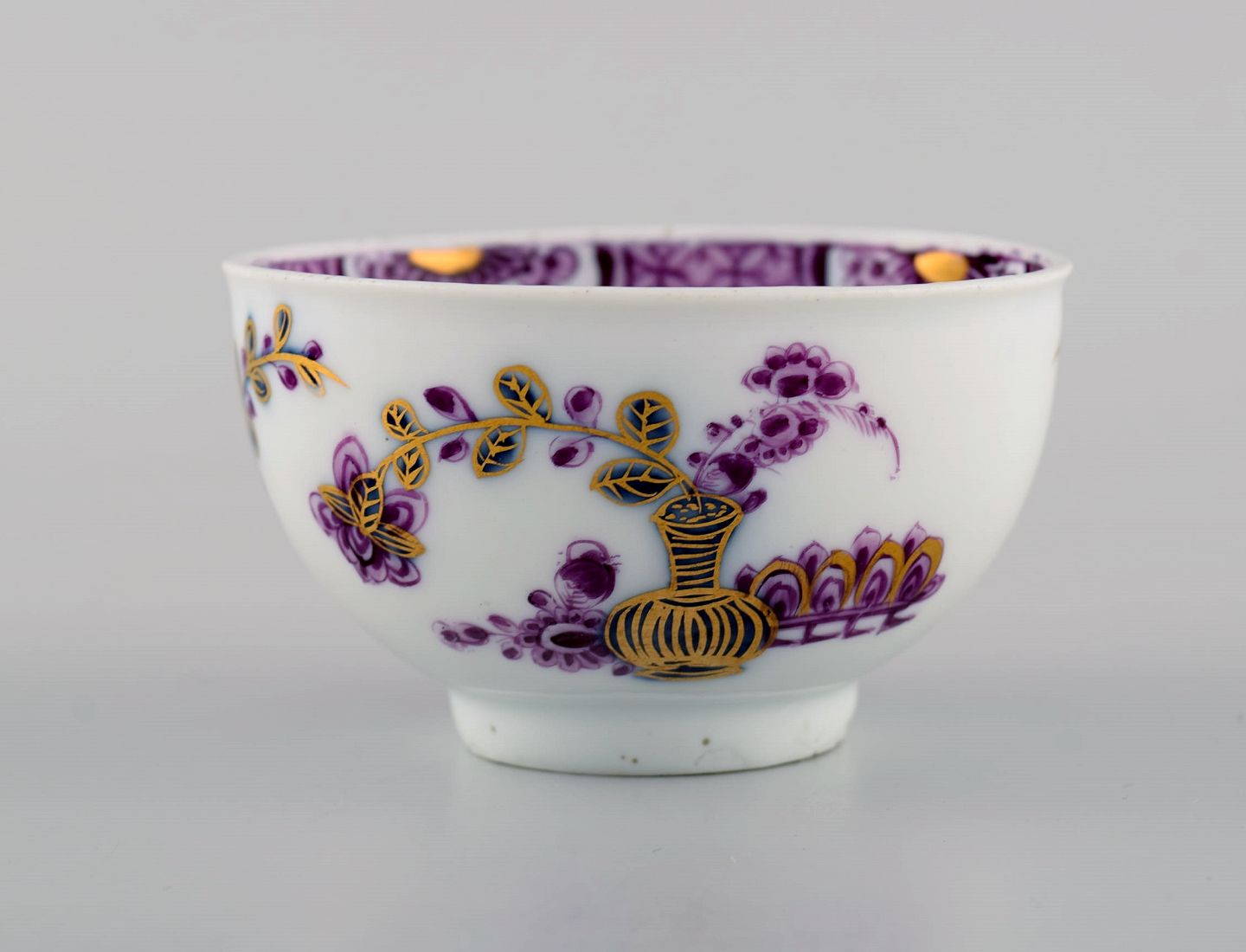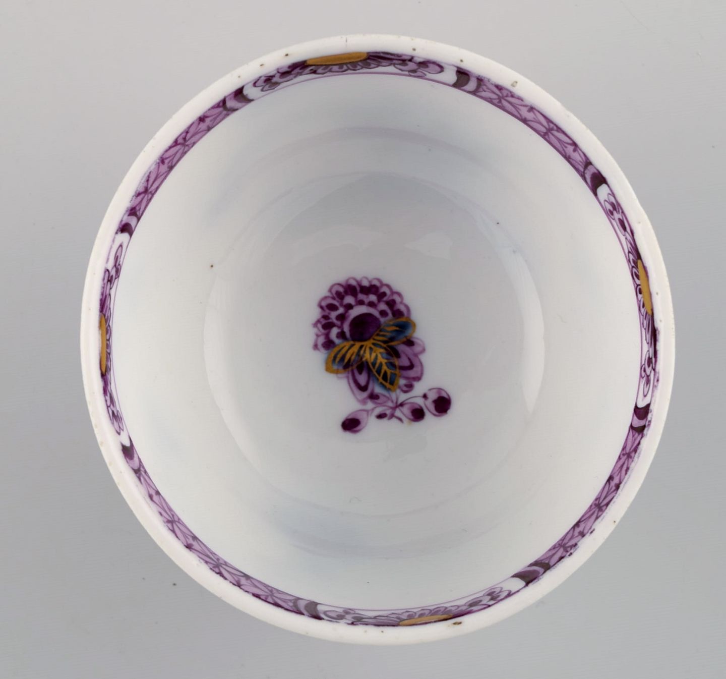 Sjælden antik Meissen tekop i håndmalet porcelæn med lilla blomster og guldekoration. 17/1800-tallet. Måler: 8 x 4,6 cm. I flot stand. Brændingsrevne i bunden. Signeret.