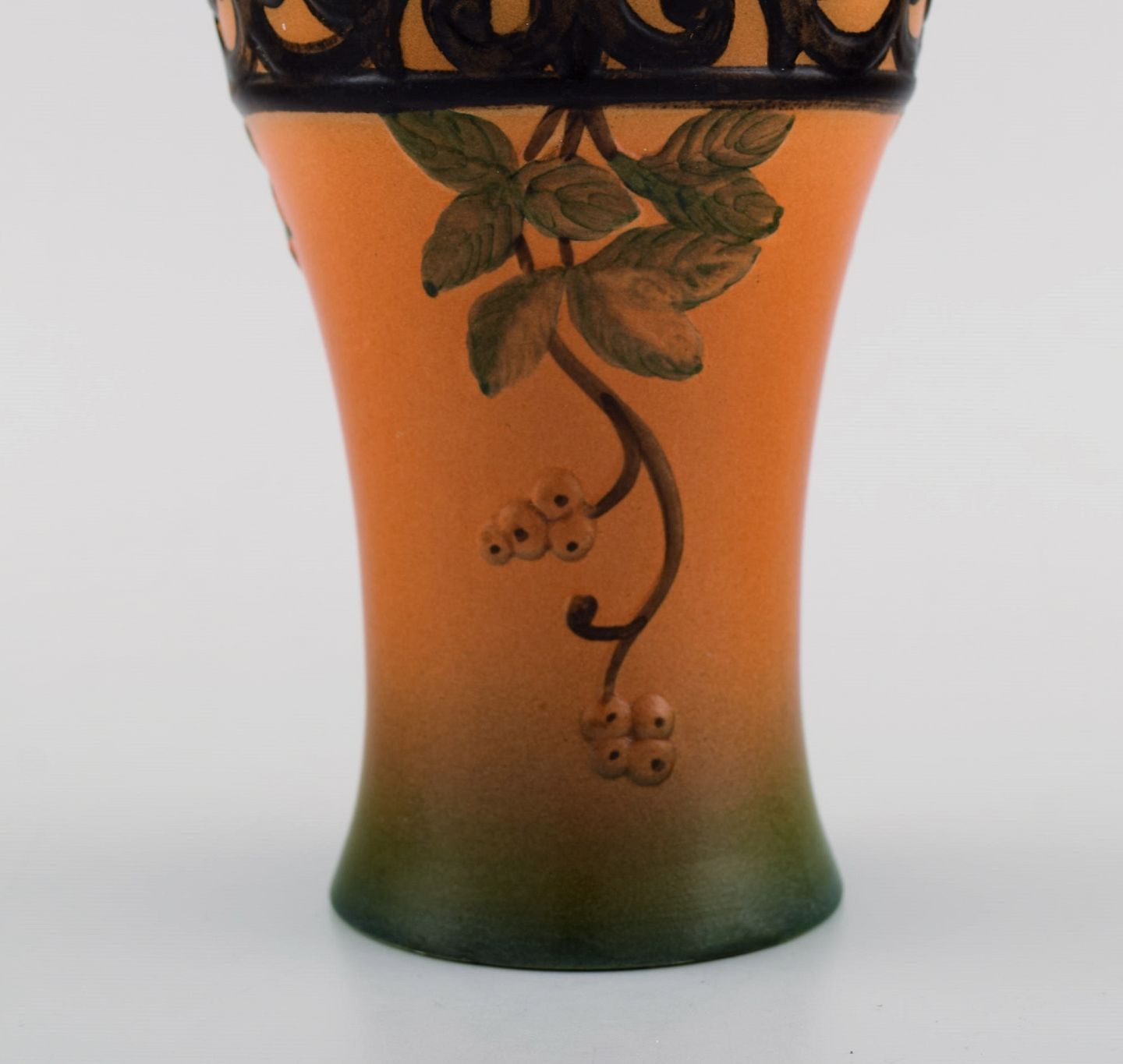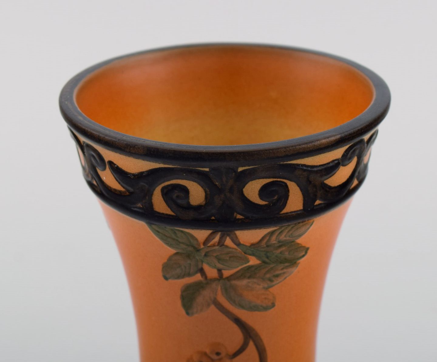 Ipsens enke, Danmark. Vase med bladværk i håndmalet glaseret keramik. Modelnummer 454. Ca. 1920.