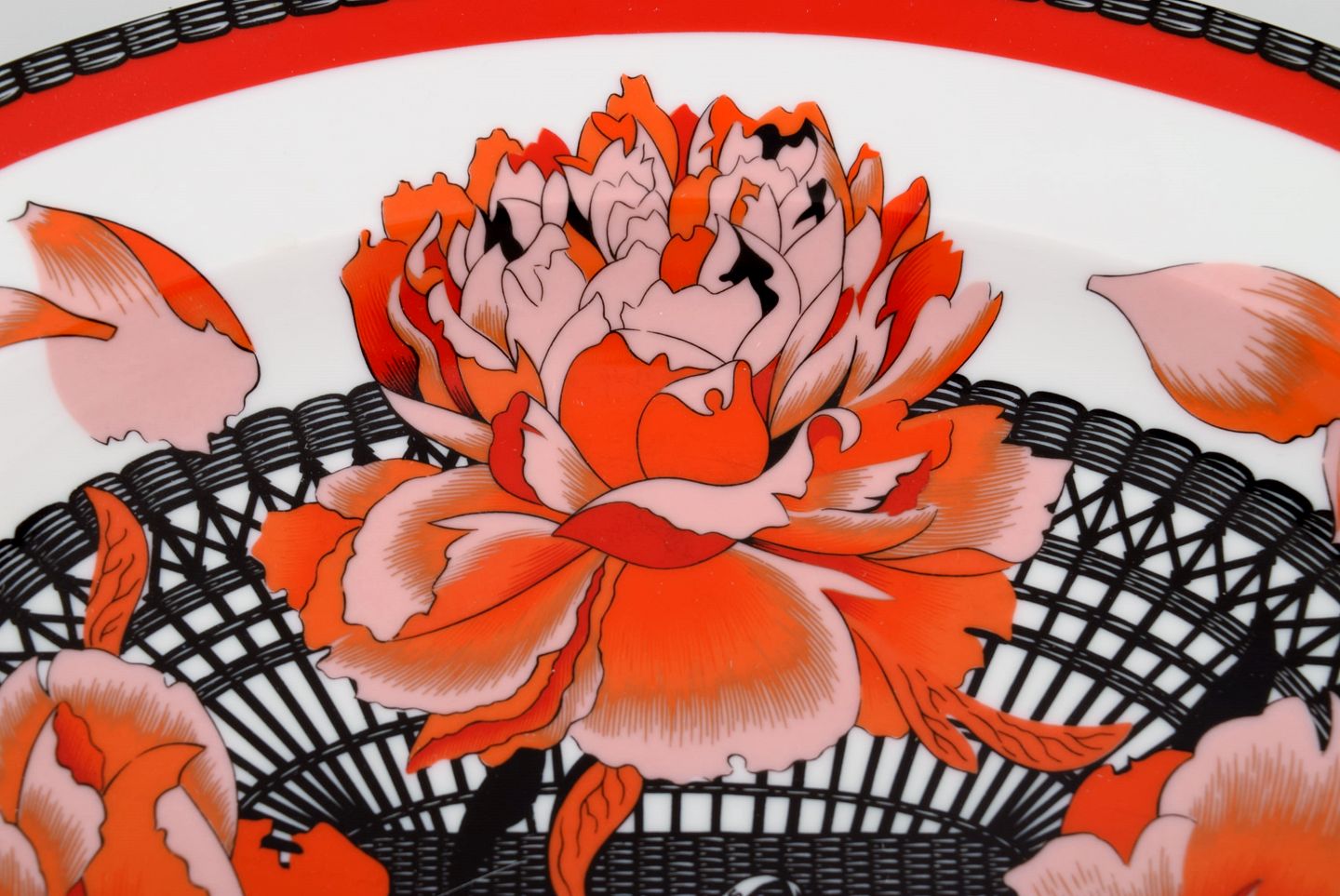 Stort Hermès serveringsfad i porcelæn dekoreret med røde blomster og sort/hvid mønstret dekoration. 1980erne.