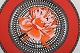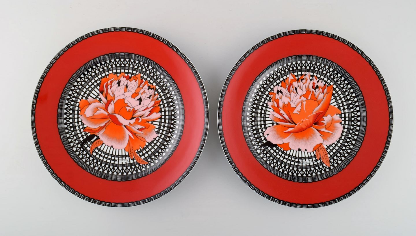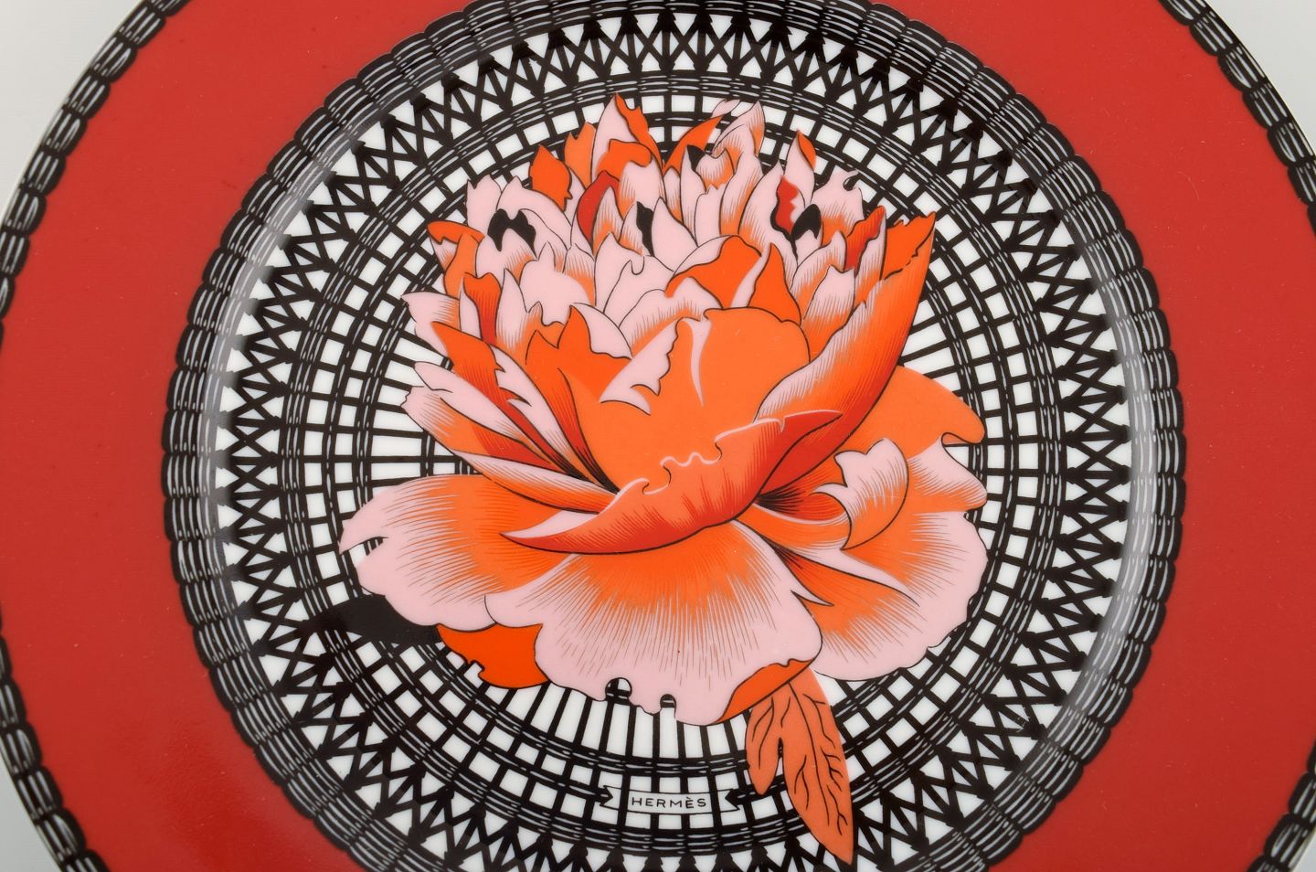Seks Hermès middagstallerkener i porcelæn dekoreret med røde blomster på sort/hvid ternet baggrund. 1980erne. Diameter: 25,5 cm. I flot stand. Stemplet.