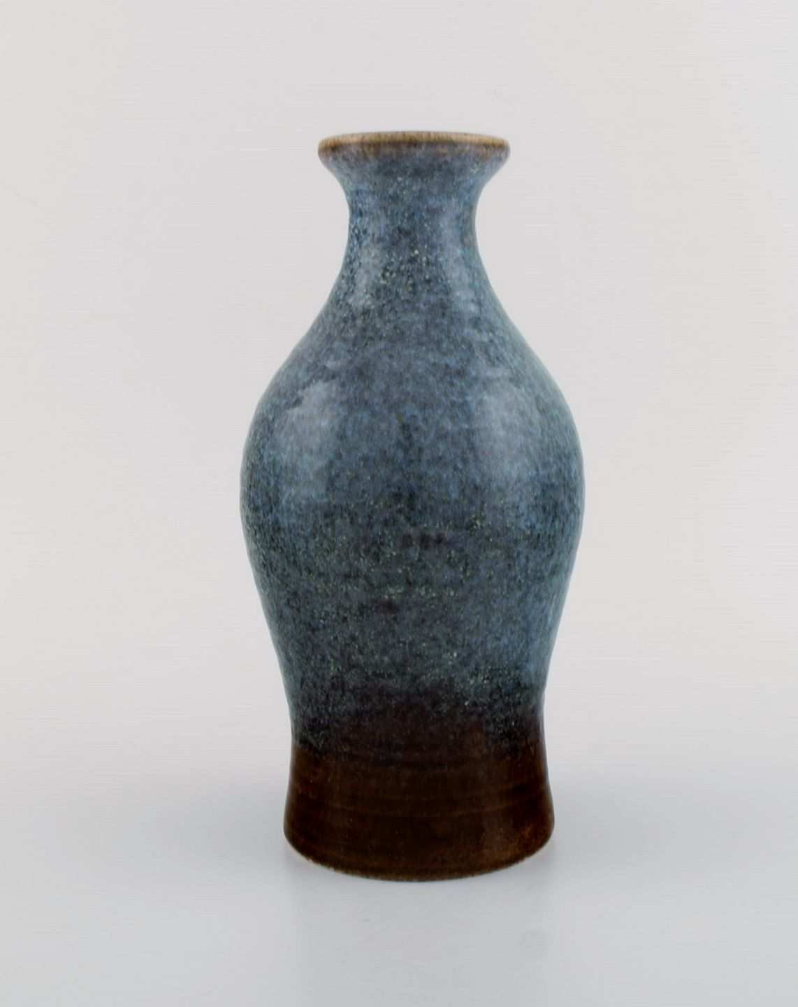Carl Harry Stålhane for Rörstrand. Vase i glaseret keramik. Smuk spættet glasur i blågrå og brune nuancer. Midt 1900-tallet. Måler: 23 x 12 cm. I flot stand. Signeret. 1. Sortering.