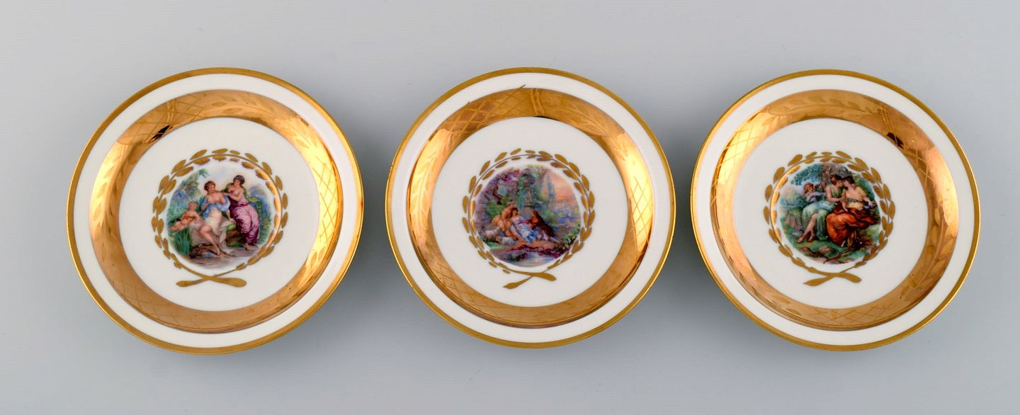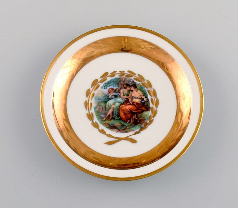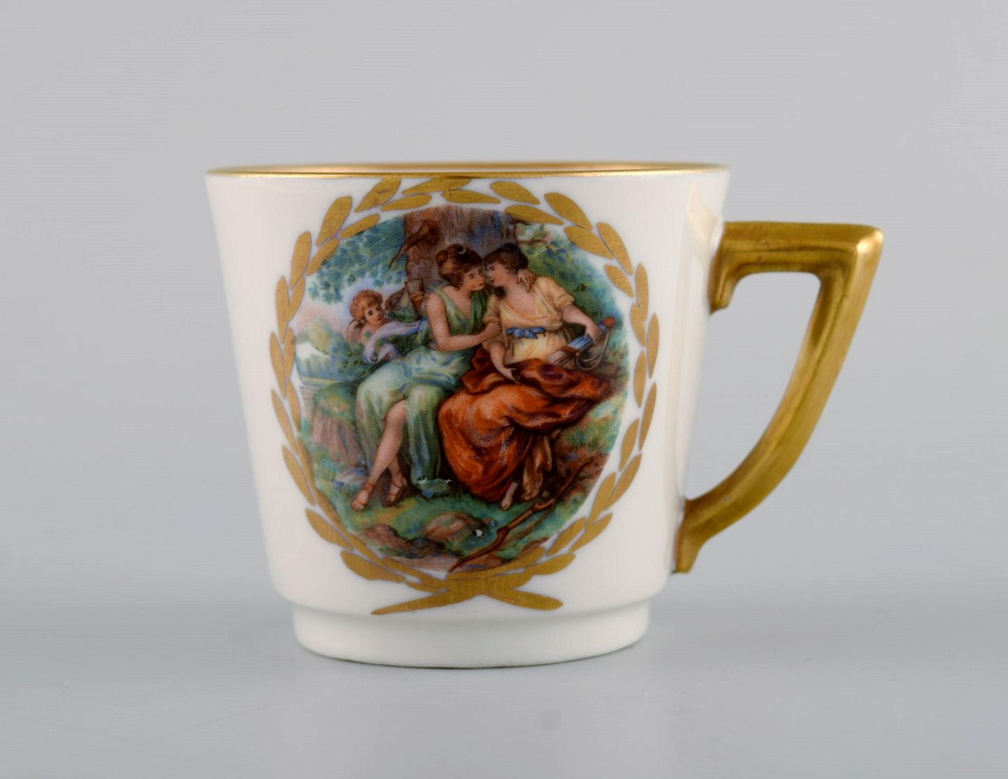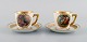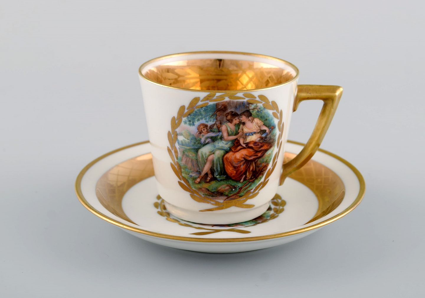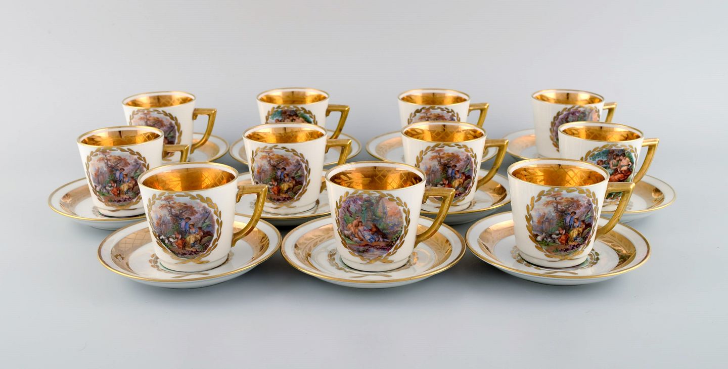11 Royal Copenhagen kaffekopper med underkopper i porcelæn med romantiske scener og gulddekoration. 1900-tallet. Koppen måler: 6 x 5,7 cm. Underkop diameter: 11,5 cm. Stemplet. I flot stand. 1. sortering.