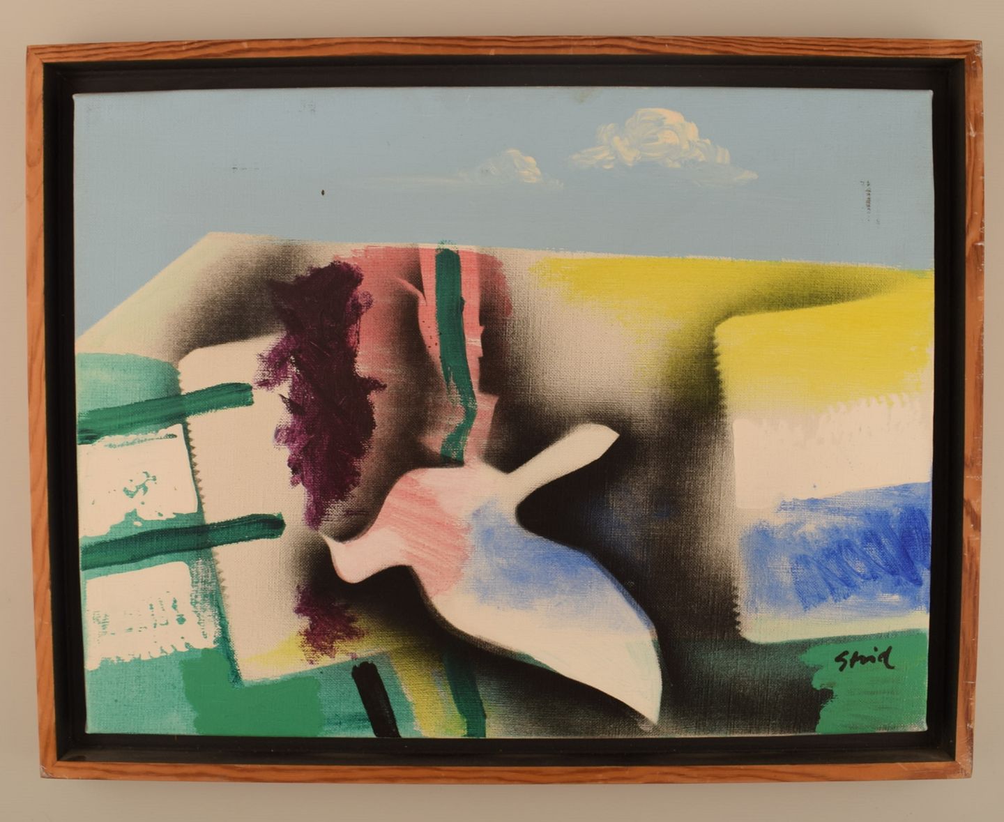 Hardy Strid (1921-2012), svensk kunstner. Akryl på lærred. Modernistisk abstrakt komposition. Dateret 1977. Lærredet måler: 41 x 31 cm. Rammen måler: 2,5 cm. Signeret. I flot stand.