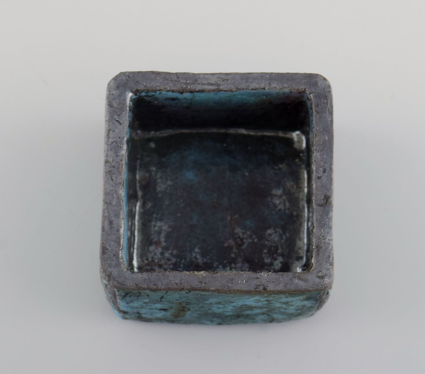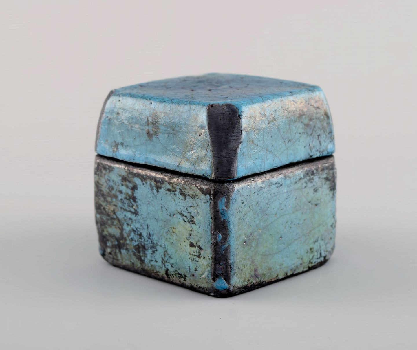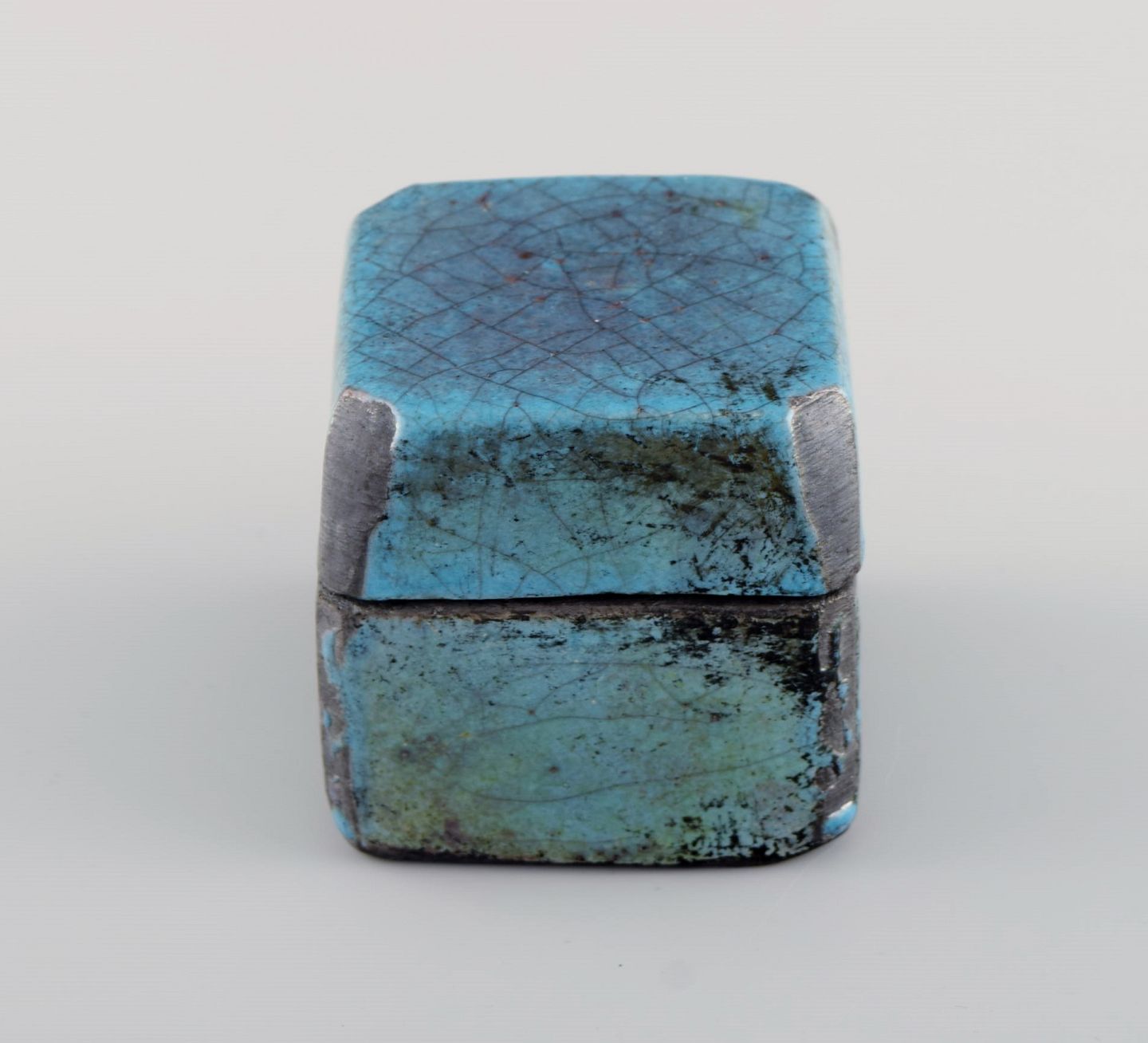 Europæisk studio keramiker. Lågkrukke i glaseret keramik. Smuk metallisk glasur i turkis nuancer. Dateret 1998. Måler: 6,5 x 6,5 cm. I flot stand. Signeret og dateret.