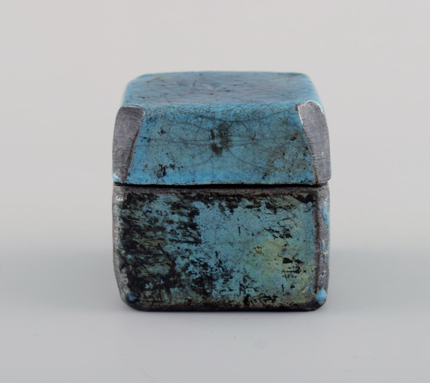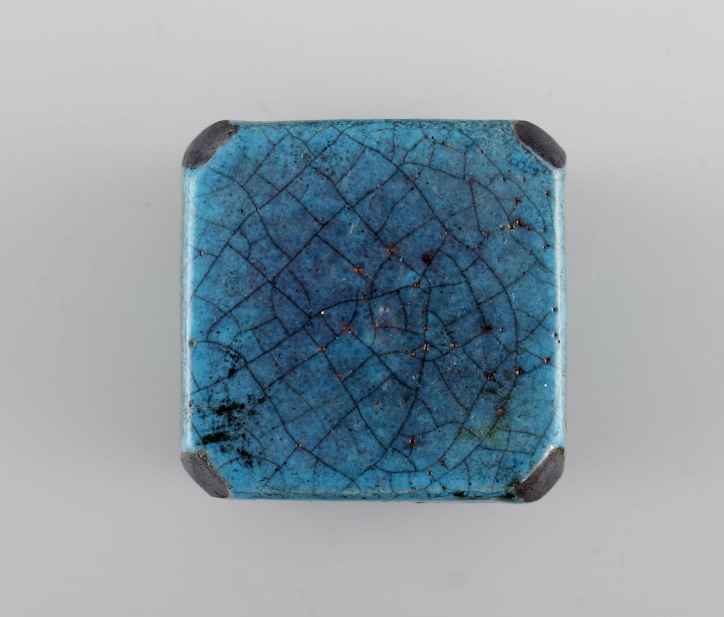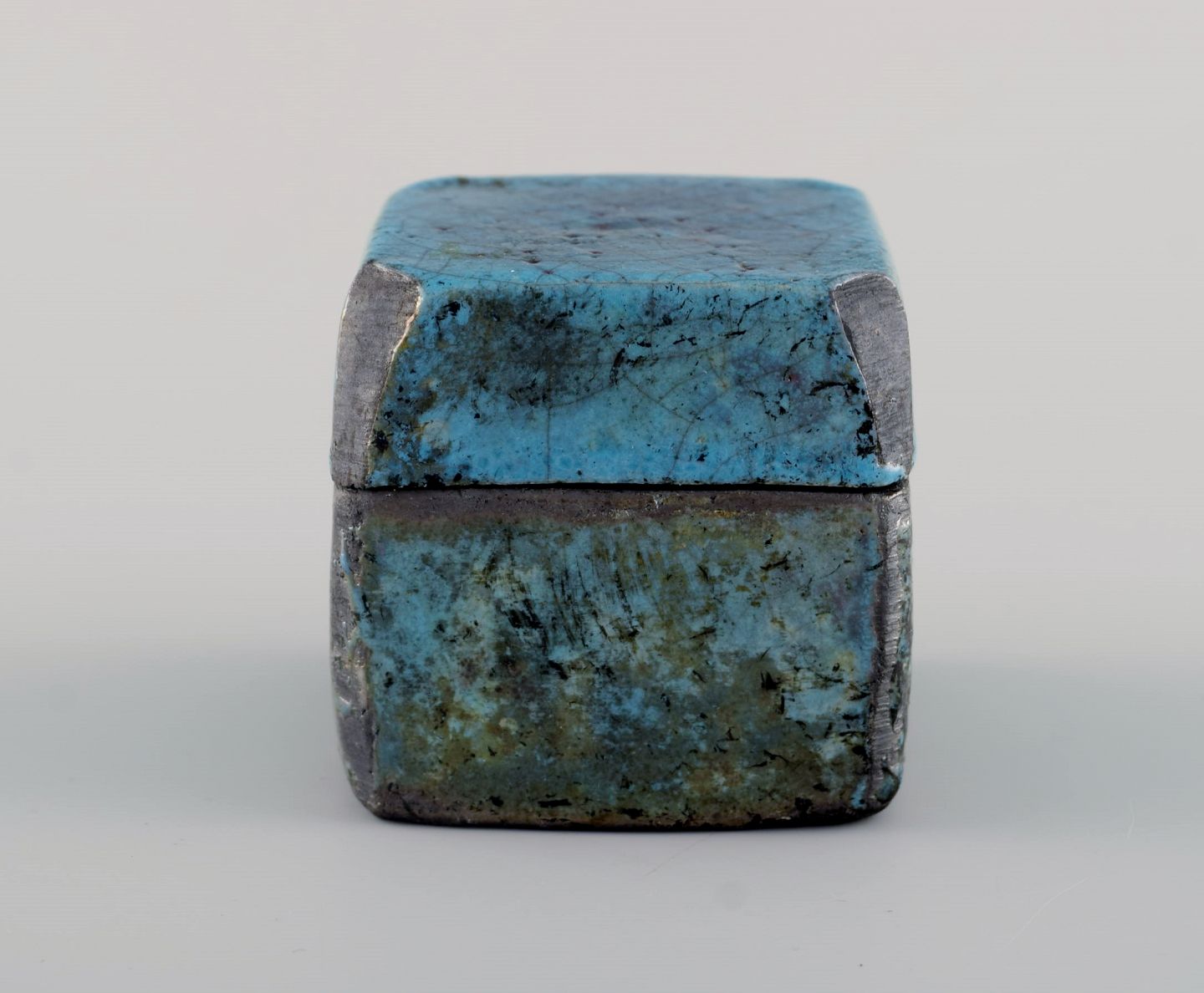 Europæisk studio keramiker. Lågkrukke i glaseret keramik. Smuk metallisk glasur i turkis nuancer. Dateret 1998. Måler: 6,5 x 6,5 cm. I flot stand. Signeret og dateret.