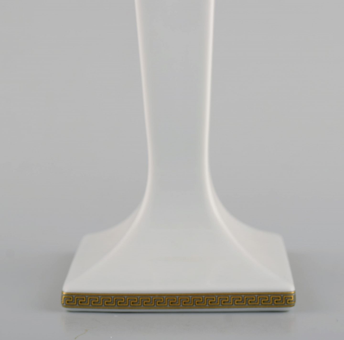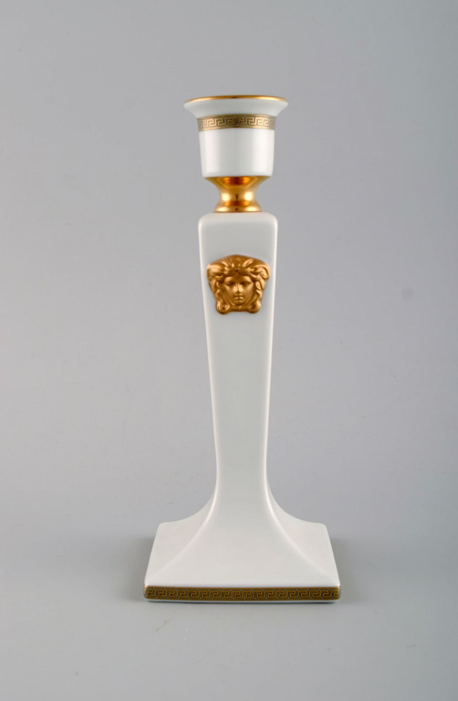 Gianni Versace for Rosenthal. Gorgona candlestick in white porcelain with gold decoration and ornamentation. Late 20th century. Measures: 20.5 x 8.5 cm. In perfect condition. Stamped.