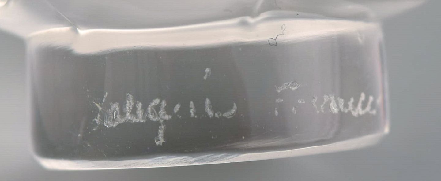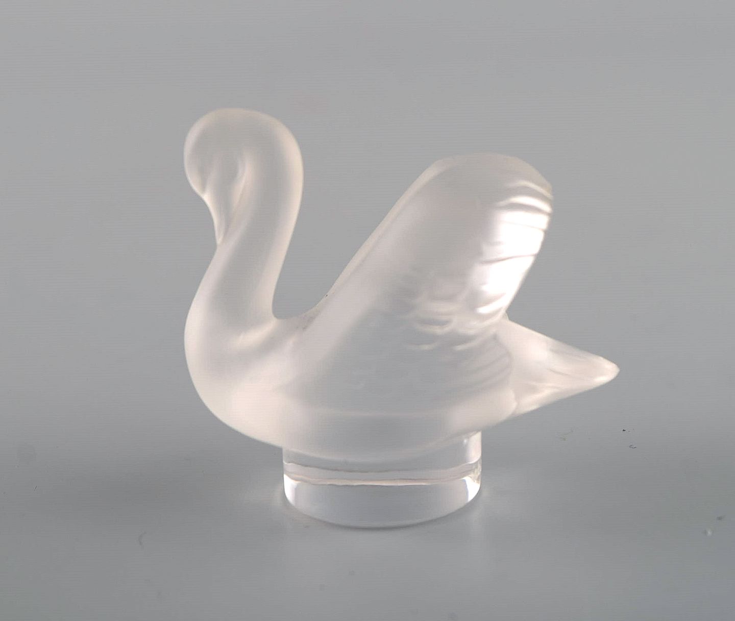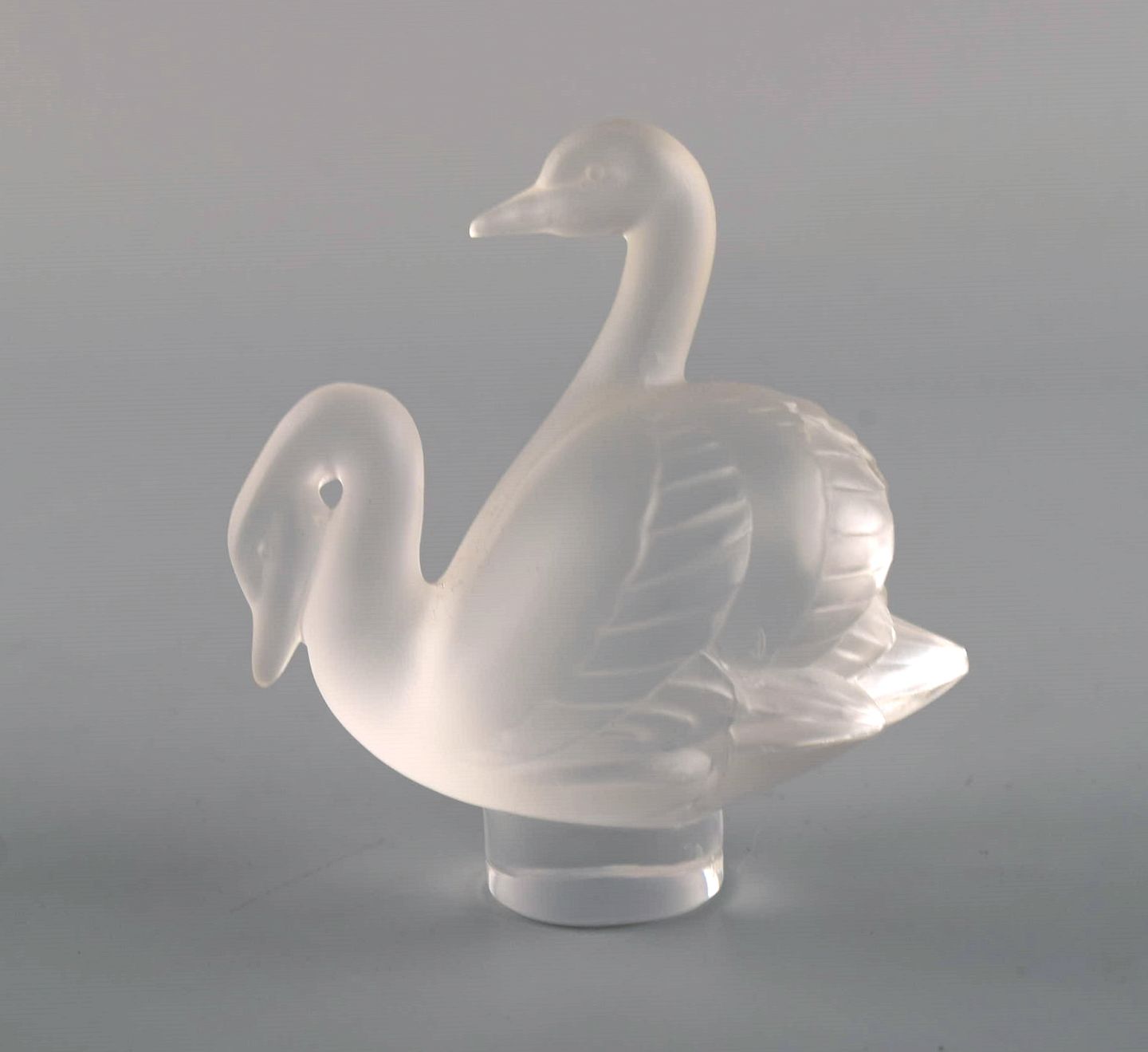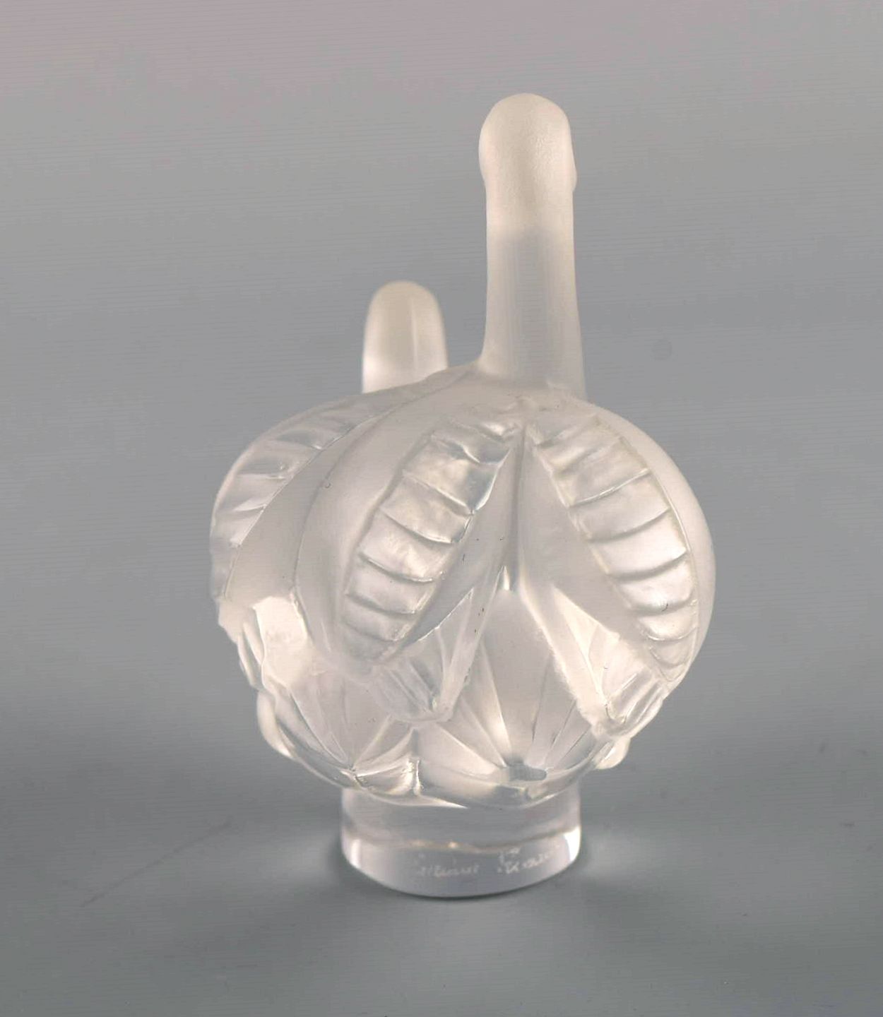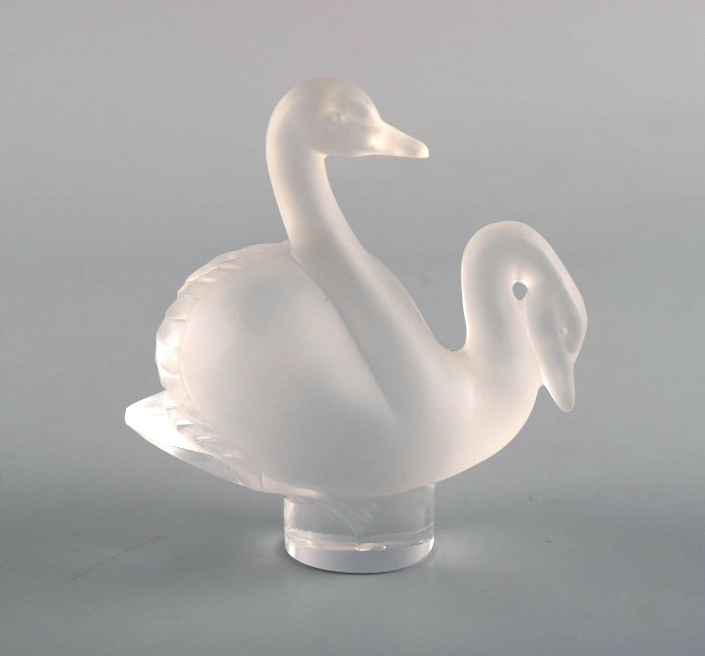 Two Lalique swan figures in clear frosted art glass. 1980s. Largest measures: 8 x 7.5 cm. In excellent condition. Engraved signature.