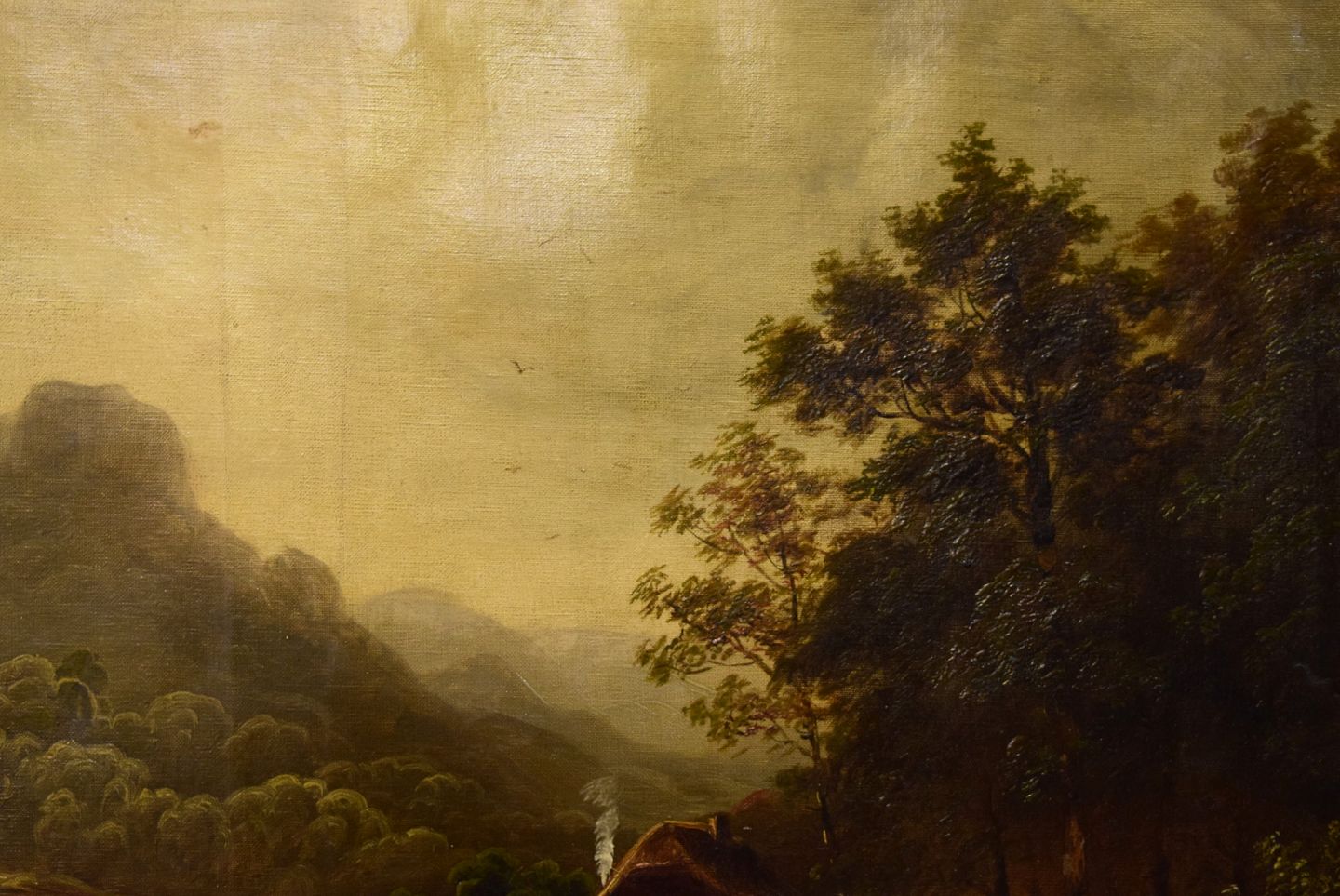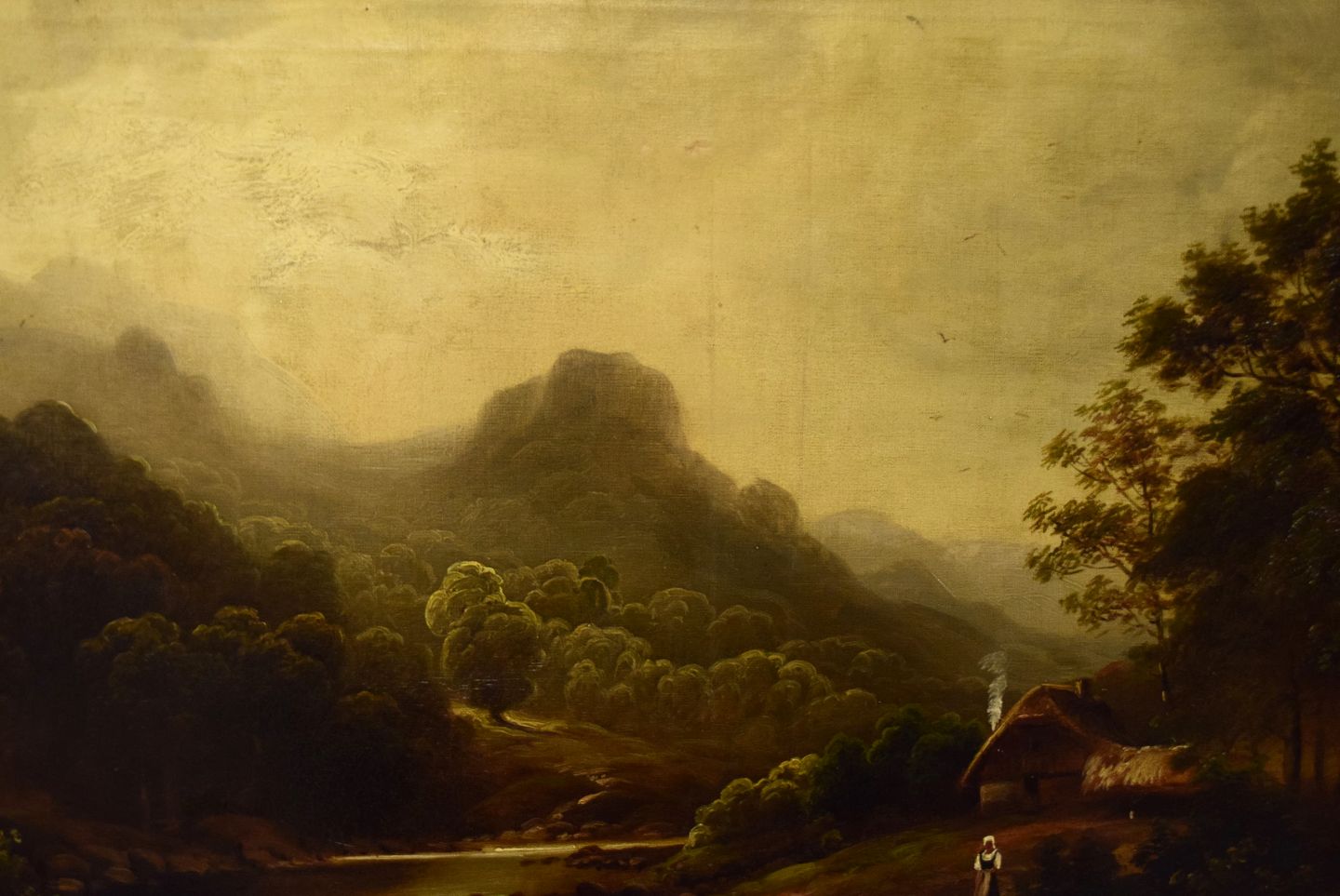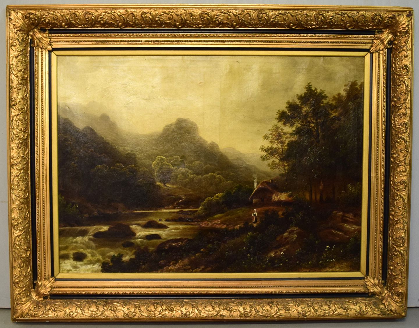 Ubekendt europæisk kunstner. Olie på lærred. Flodlandskab med bjerge i baggrunden og person. 1800-tallet.