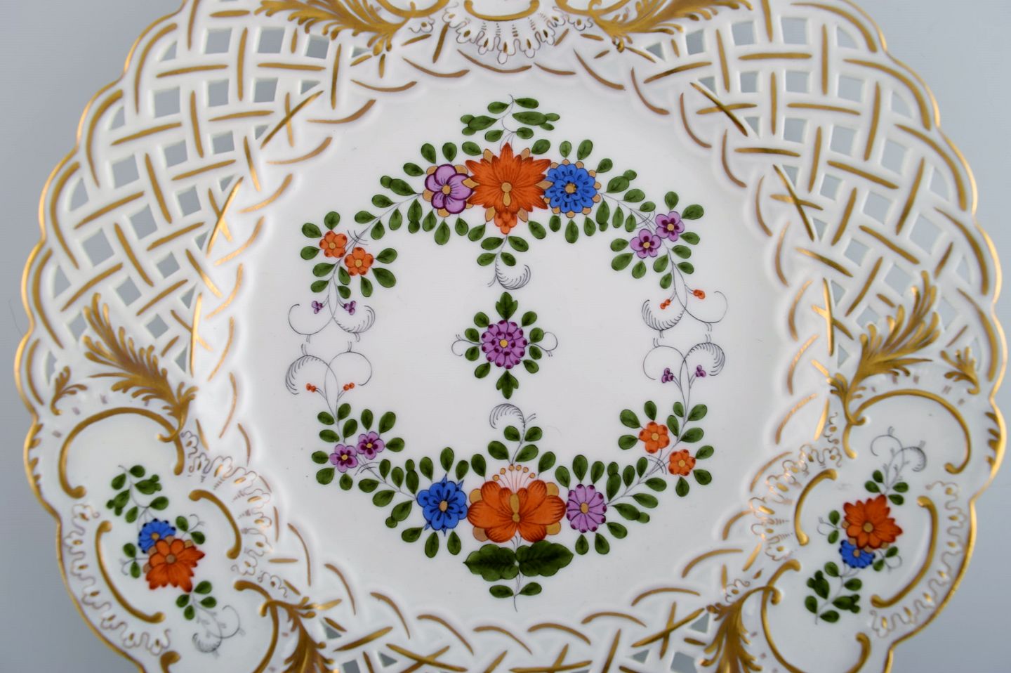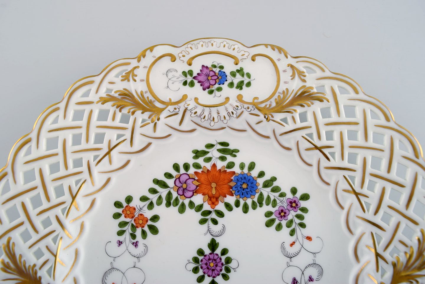 Meissen plate in openwork porcelain with hand-painted flowers and gold decoration. 1920's. Diameter: 21 cm. In excellent condition. Stamped. 2nd factory quality.