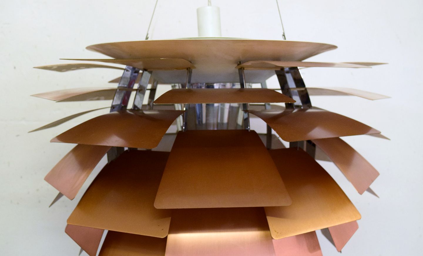 Poul Henningsen for Louis Poulsen. "Koglen" pendel. Overskærm af mathvidt metal, blade af lakeret kobber, ophæng med integreret stålline. Ca. 1970.