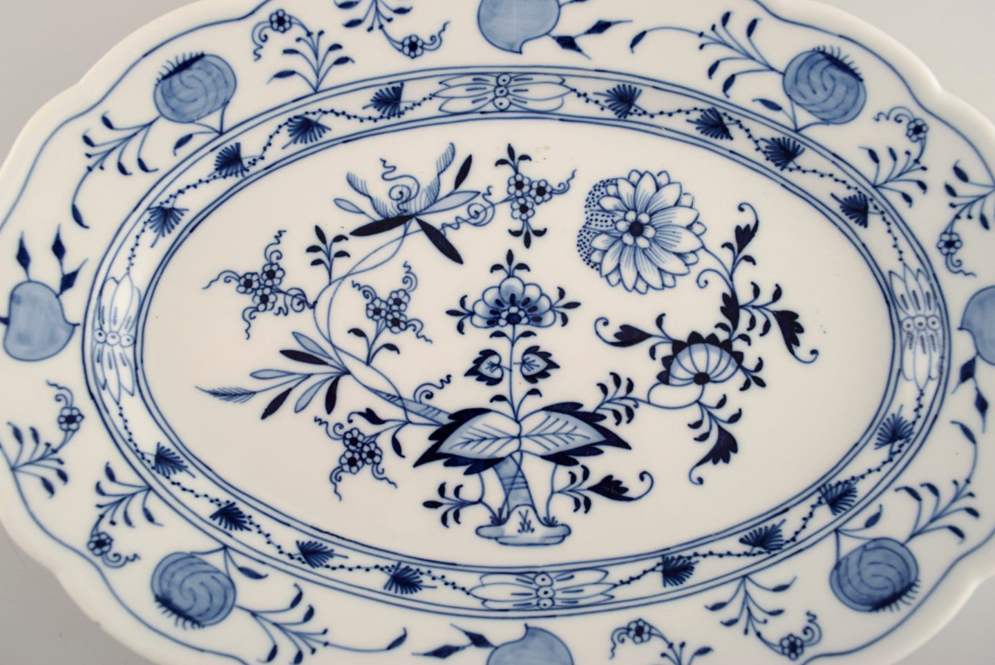 Antikt Meissen "Løgmønstret" serveringsfad i håndmalet porcelæn. Tidligt 1900-tallet.
