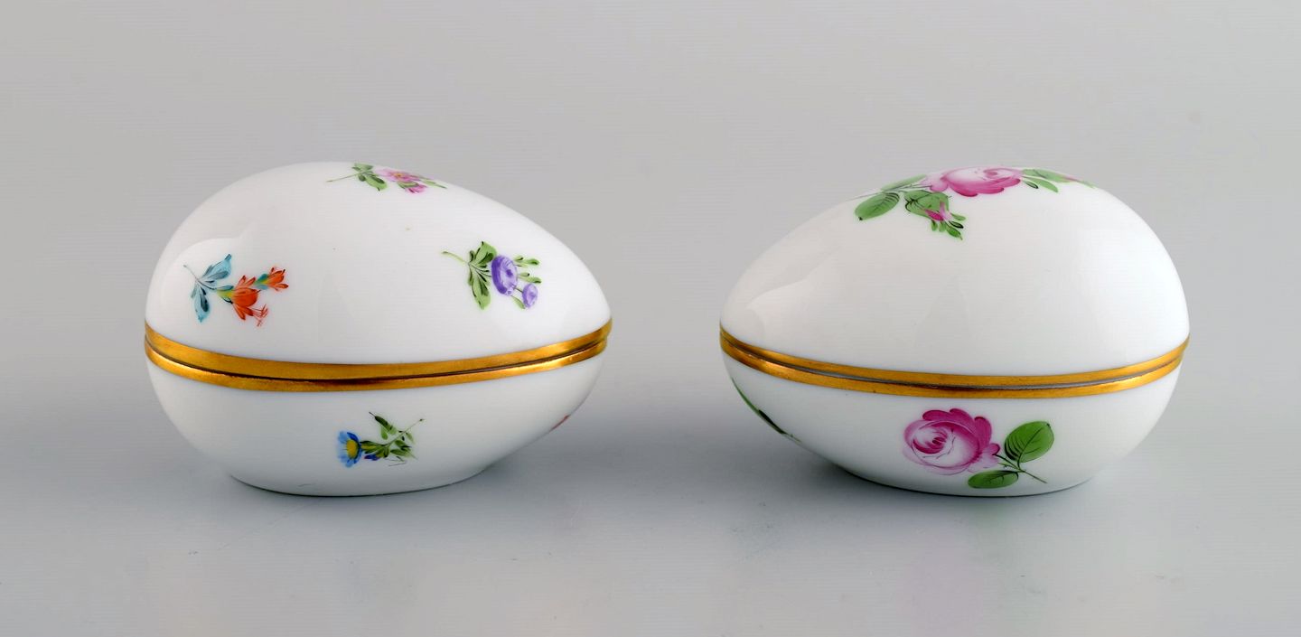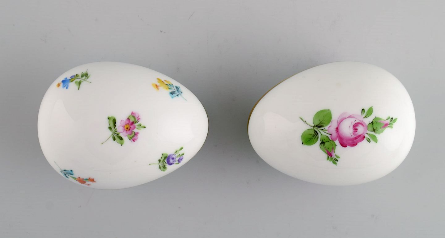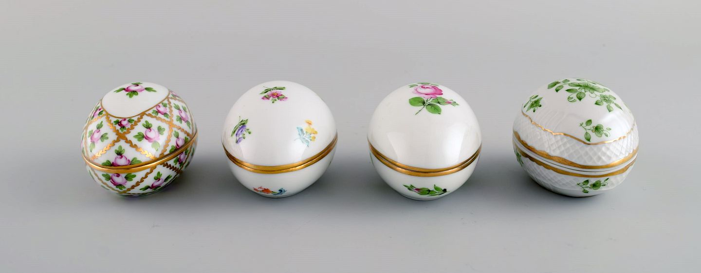 Fire Herend æg i håndmalet porcelæn. 1980'erne. Måler: 7,5 x 5 cm. I flot stand. Stemplet.