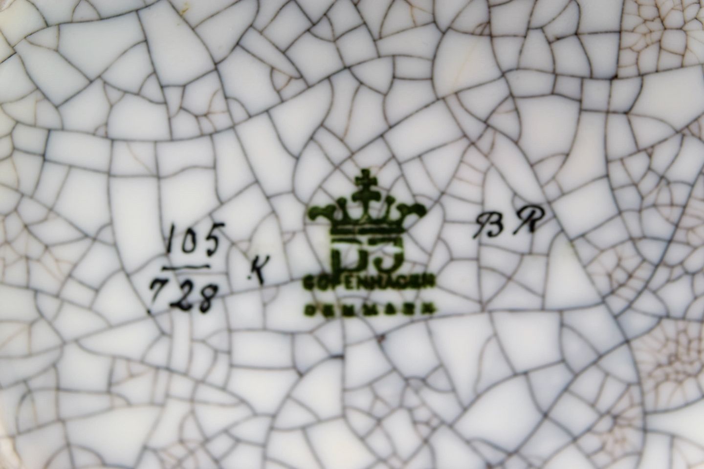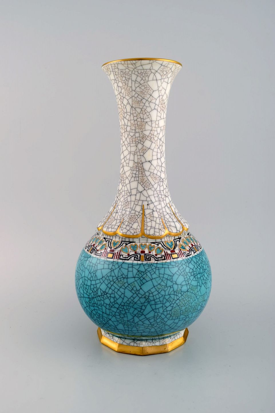 Stor Dahl Jensen vase i krakeleret porcelæn med guld og turkis dekoration. 1930'erne. Måler: 33,5 x 17 cm. I flot stand. Stemplet. 2. Sortering.