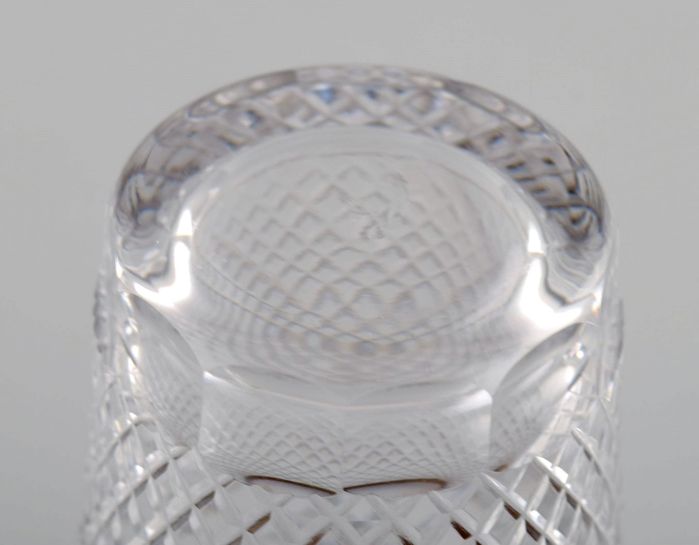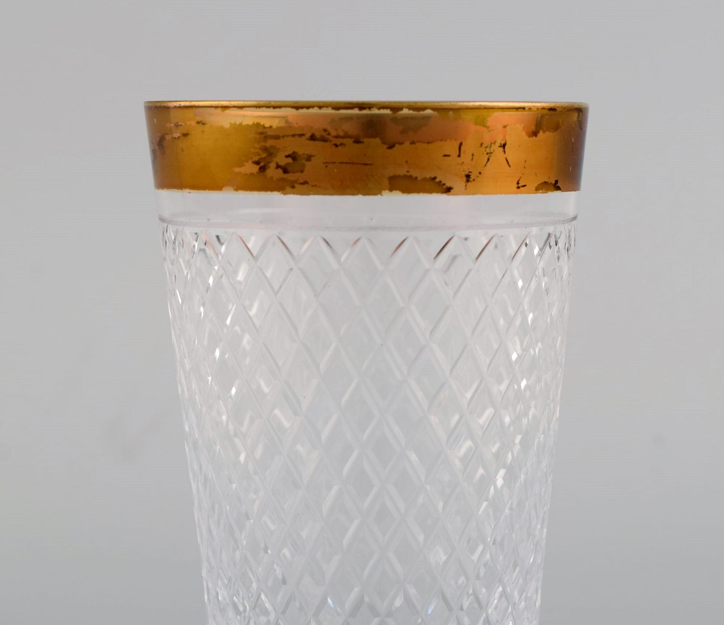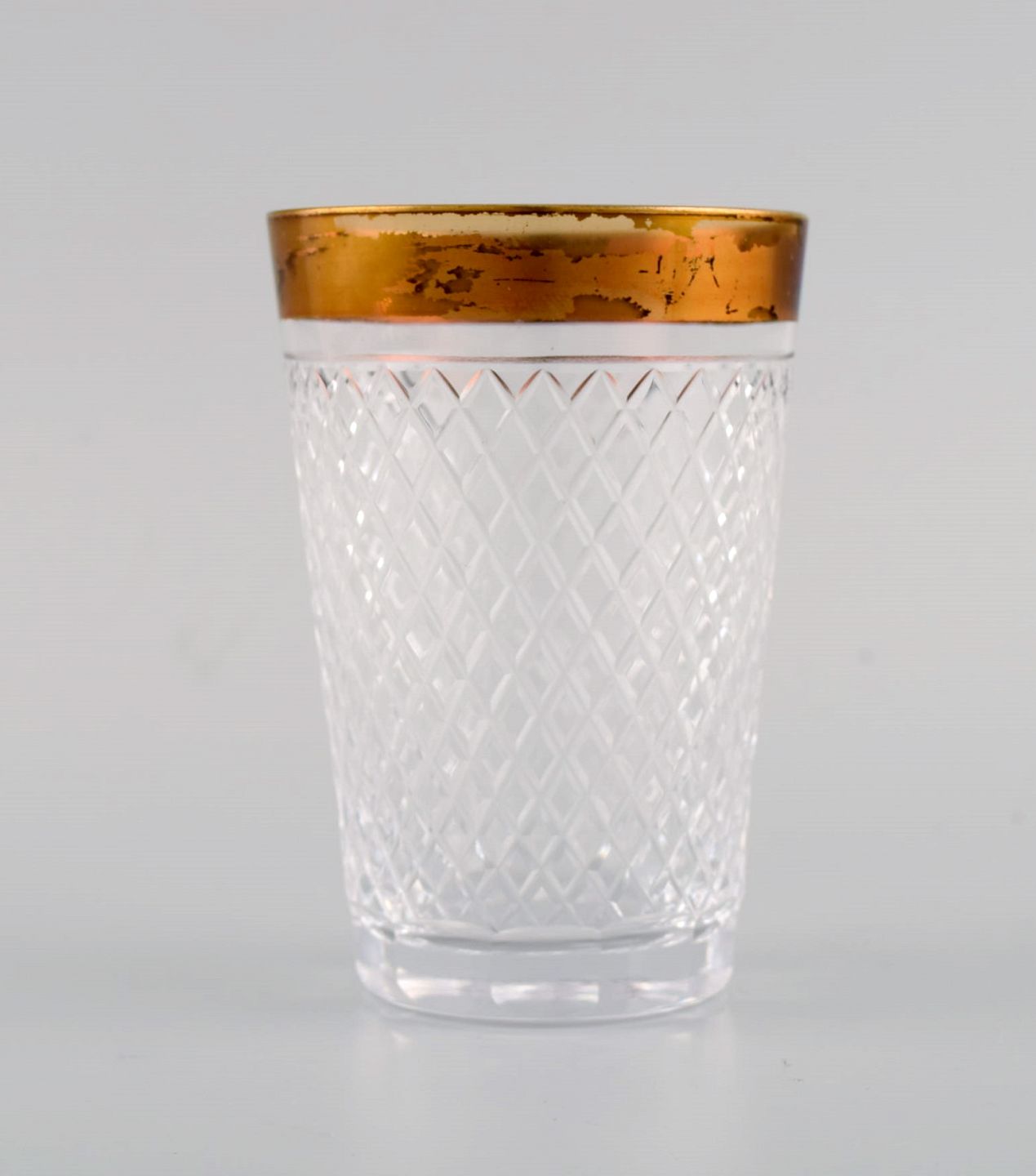 Syv drikkeglas i mundblæst krystalglas med guldkant. Frankrig, 1930'erne. Mindste måler: 9 x 8 cm. Største måler: 10,7 x 7,5 cm. I flot stand med slid på guldkanten.