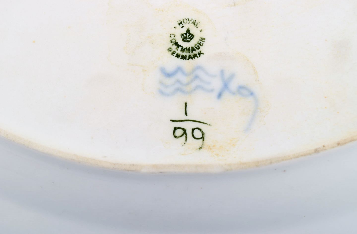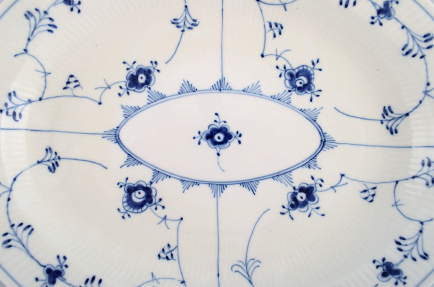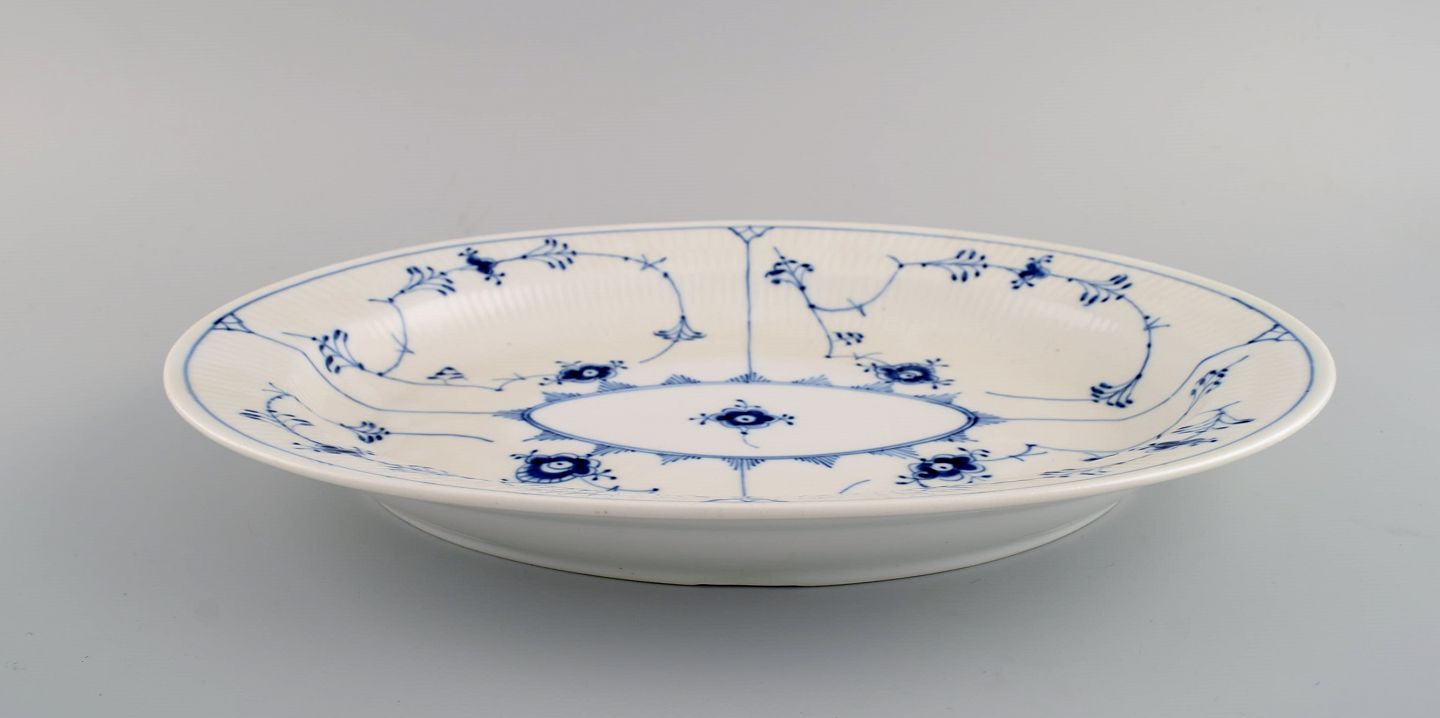 Royal Copenhagen Musselmalet riflet serveringsfad. Modelnummer 1/99. Dateret 1950.