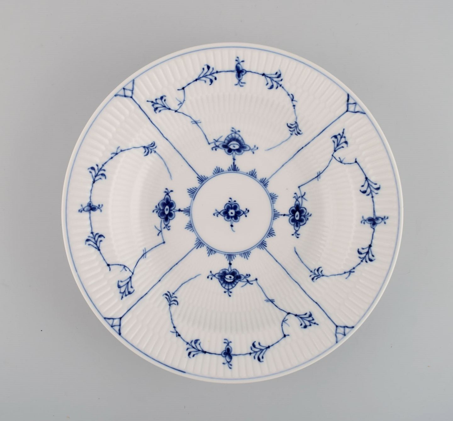 11 Royal Copenhagen Musselmalet riflet dybe tallerkener. Modelnummer 1/165. Dateret 1949. Måler: 24,5 x 4,6 cm. Stemplet. 2. sortering.