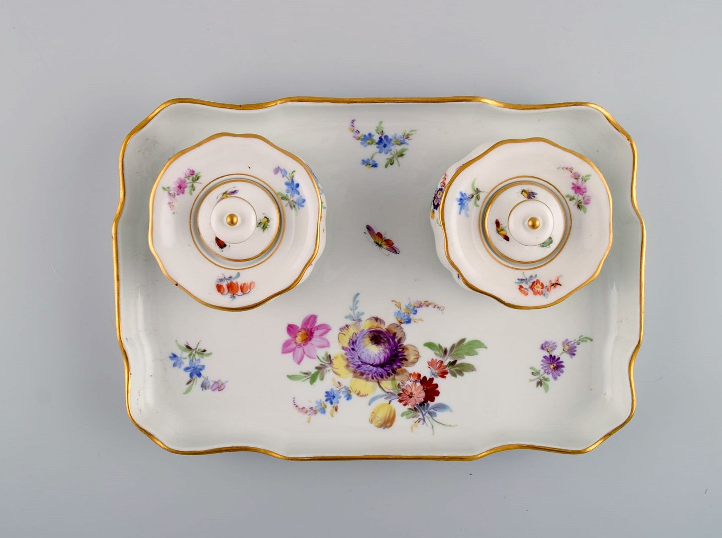 Antikt Meissen blækhus i håndmalet porcelæn med blomstermotiver og gulddekoration. 1800-tallet. Bakken måler: 22 x 15 cm. Blækhusene måler: 7,5 x 5,5 cm. I flot stand. Stemplet. 1. Sortering.