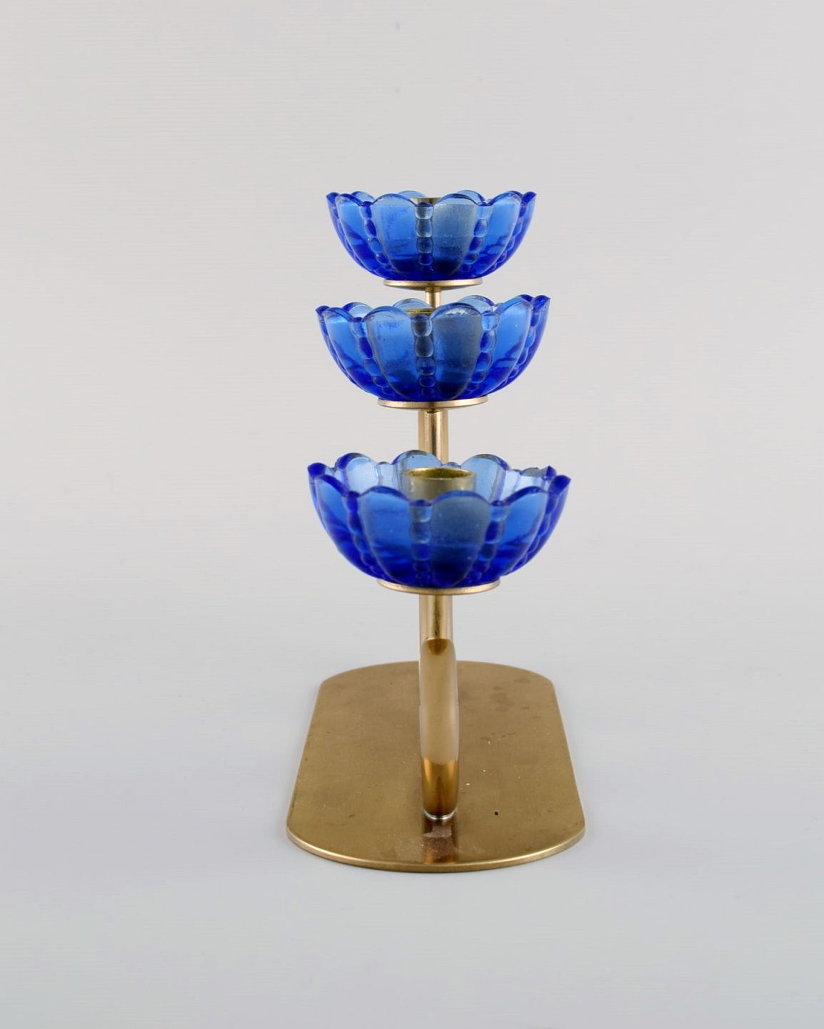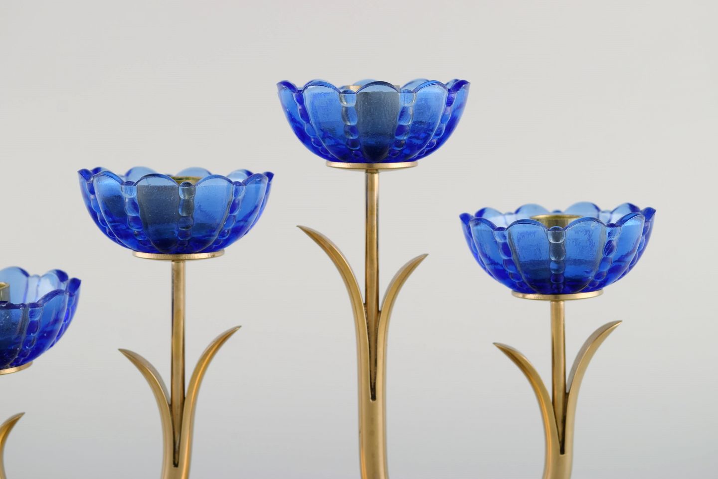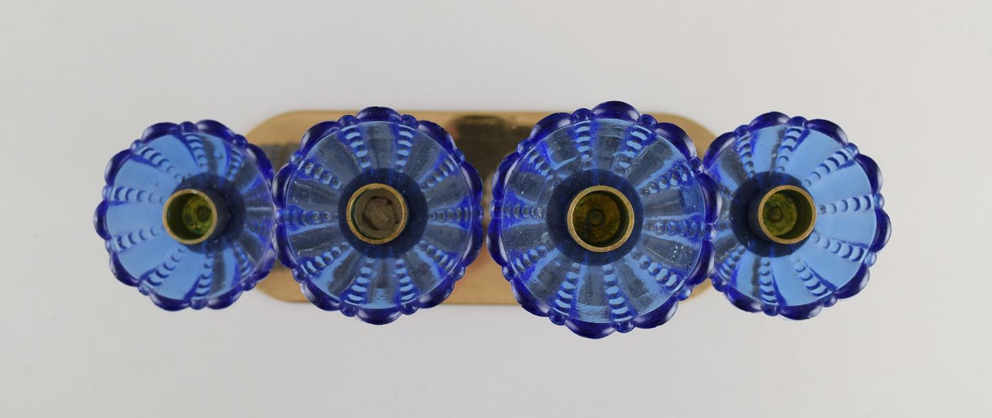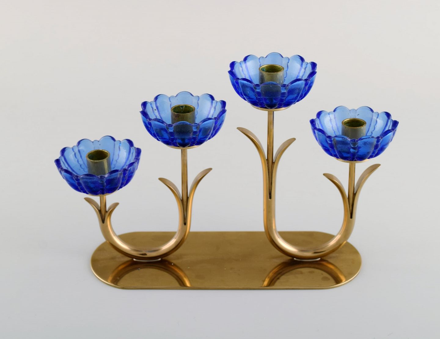 Gunnar Ander for Ystad Metall. Candlestick in brass and mouth-blown art glass shaped like flowers. 1950s. Measures: 20.5 x 13.5 cm. In excellent condition. Stamped.