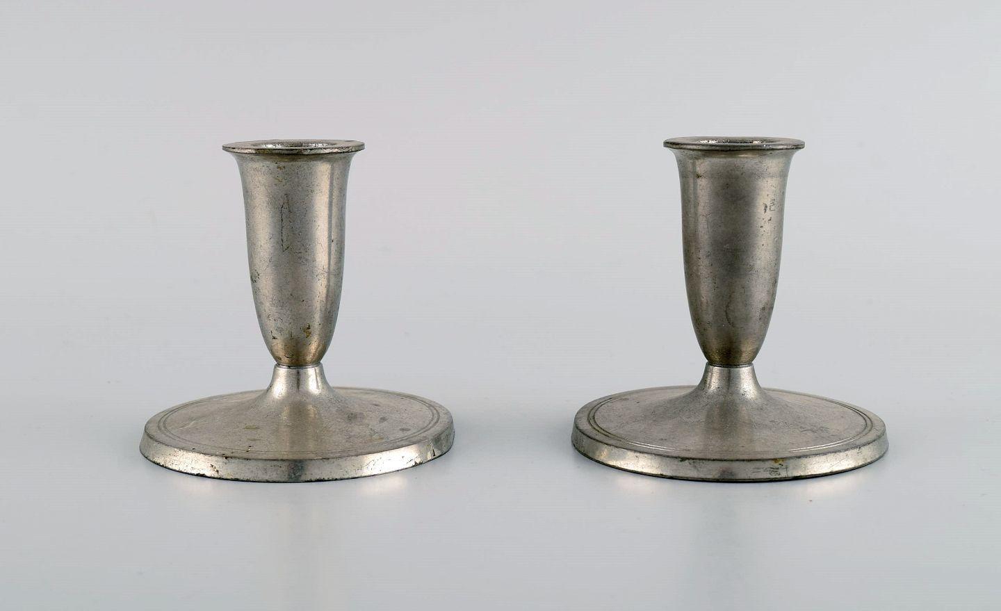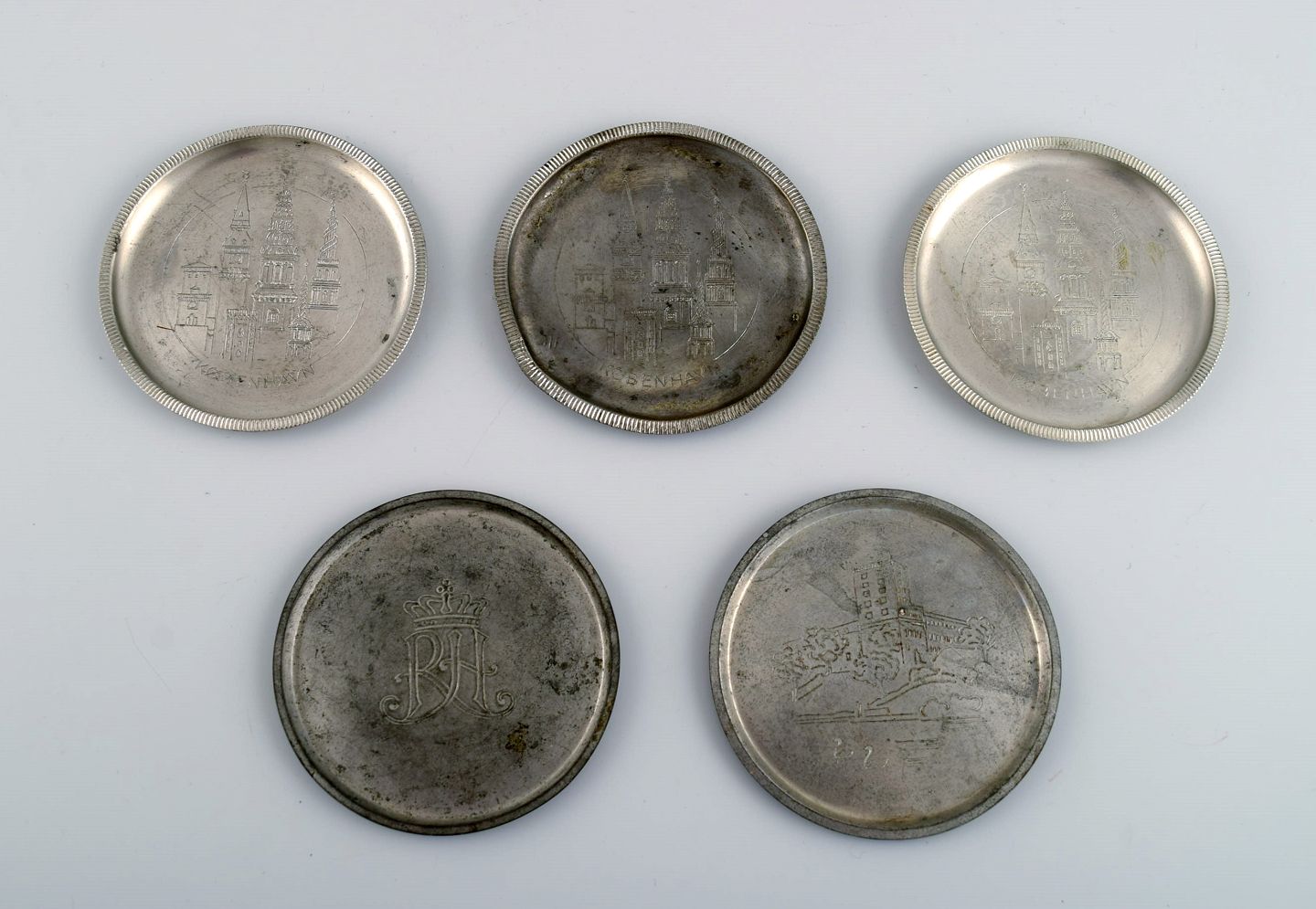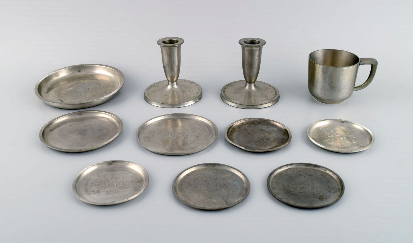 Just Andersen. Two candlesticks, eight bottle trays and a mug in pewter. 1930 / 40's.