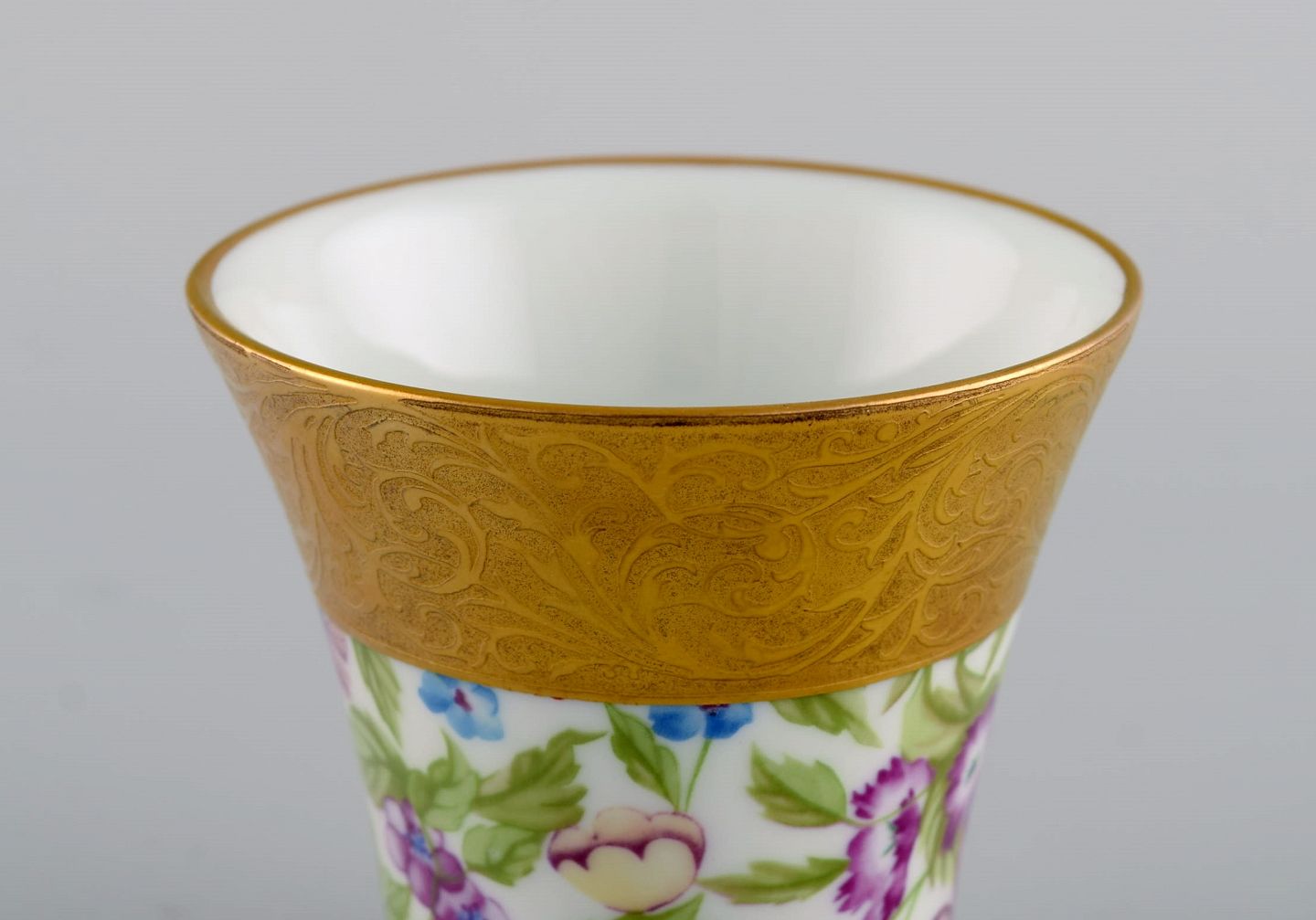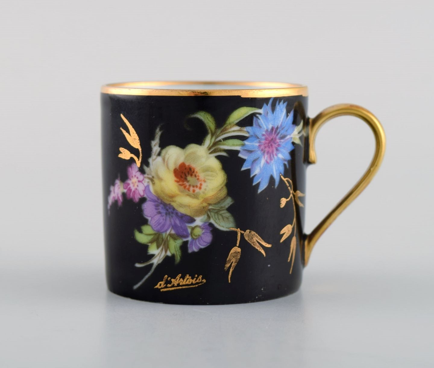 Limoges, Frankrig. Tre mokkakopper, fad/skål og vase i håndmalet porcelæn med blomster og gulddekoration. 1900-tallet.
