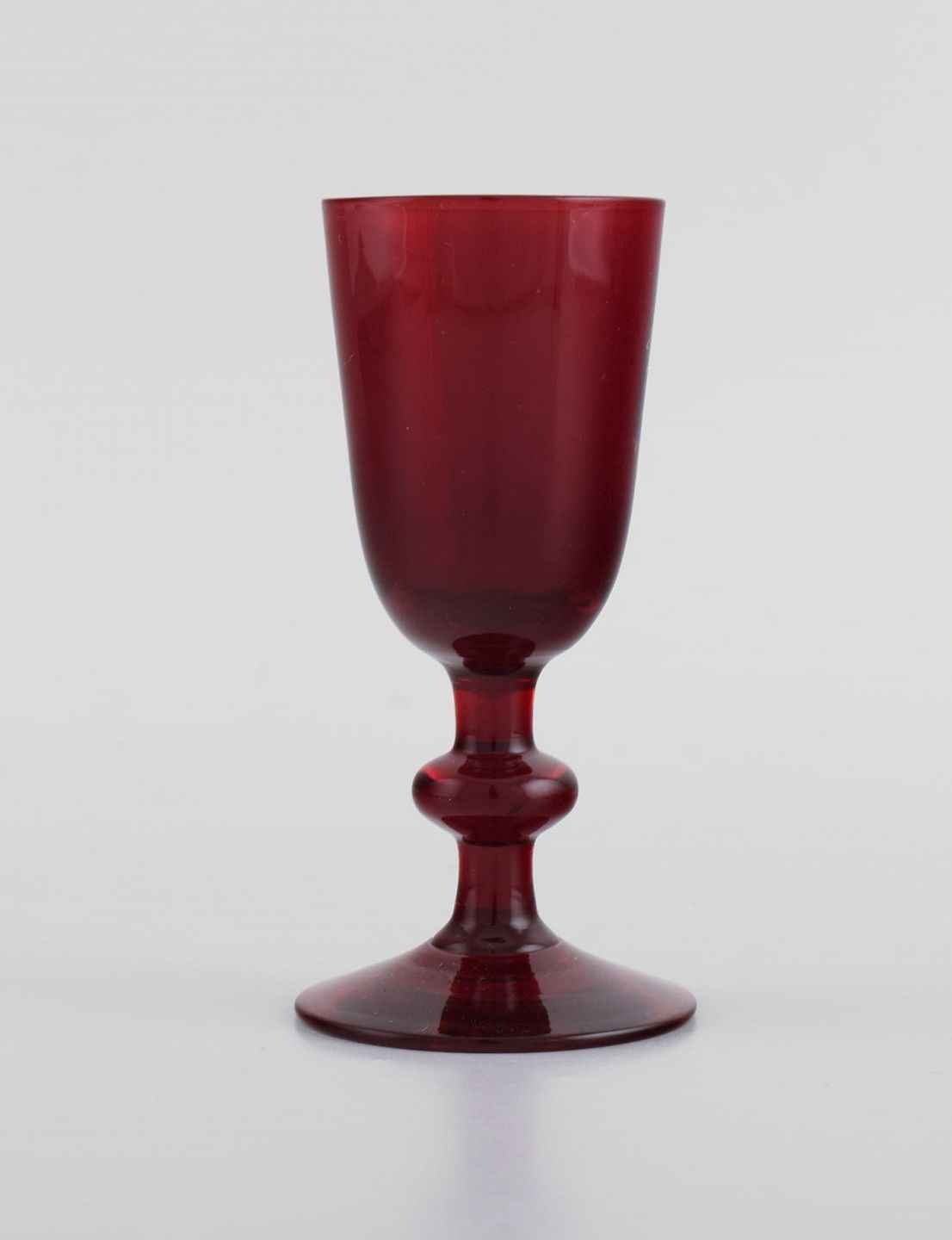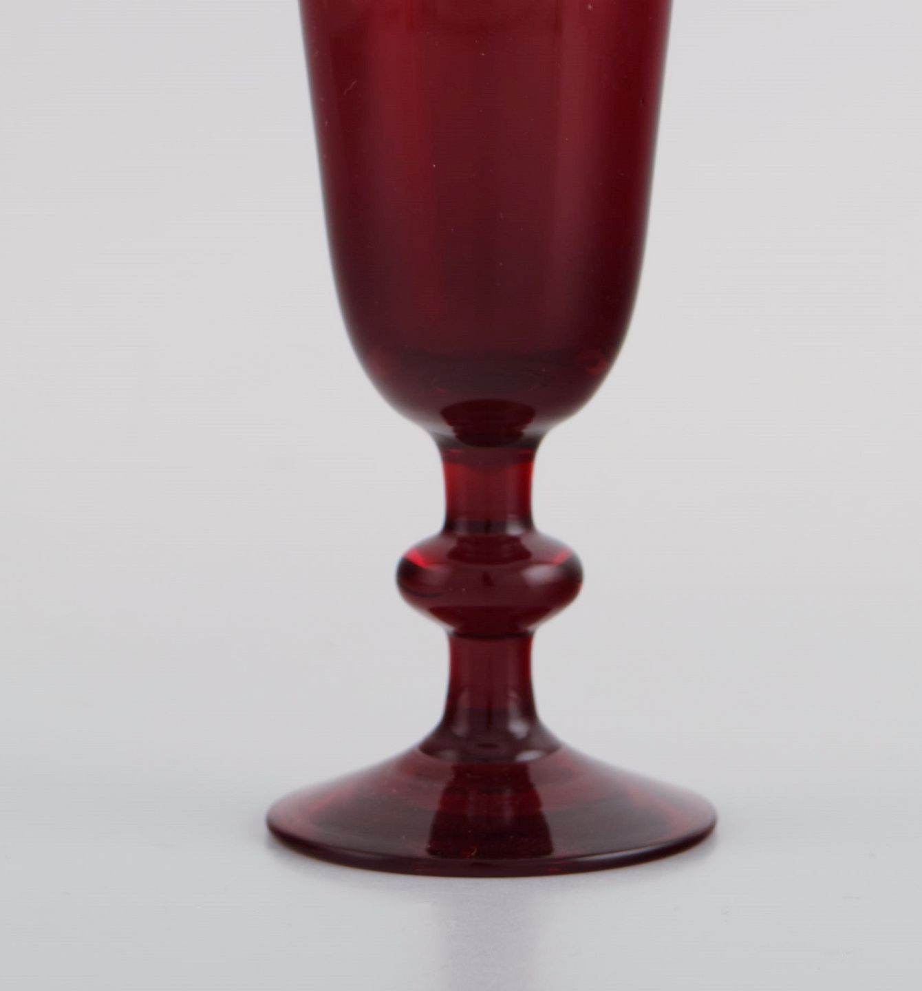 Monica Bratt for Reijmyre. Tolv hedvinsglas i rødt mundblæst kunstglas. 1950'erne.