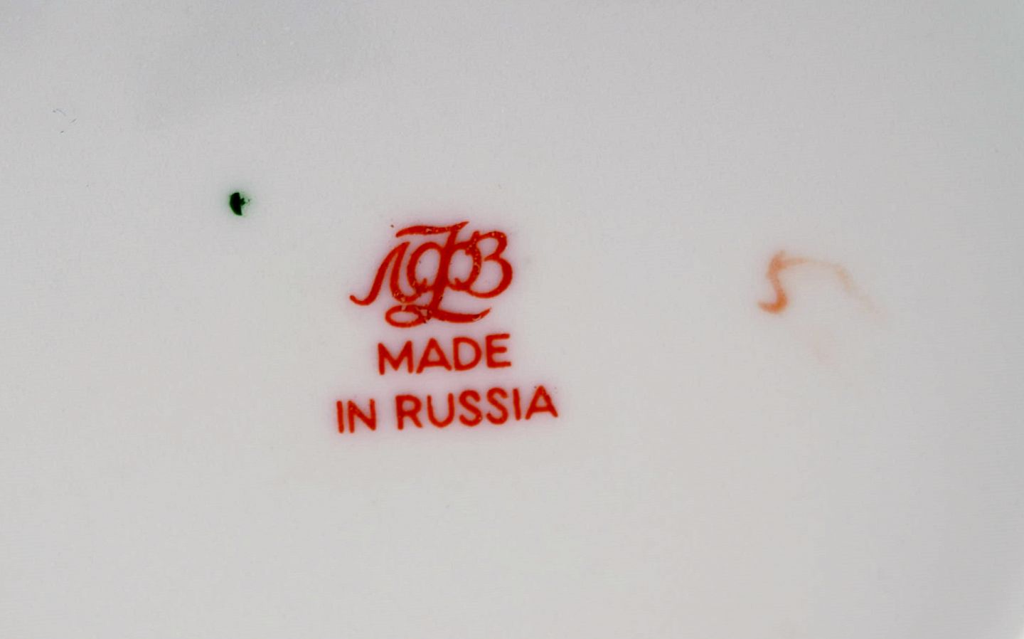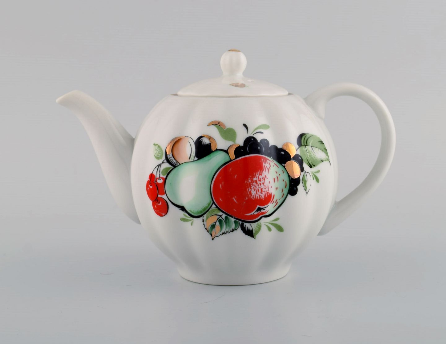 Den kejserlige Lomonosov porcelænsfabrik, Sovjetunionen. Stort teservice i håndmalet porcelæn til seks personer. Midt 1900-tallet.