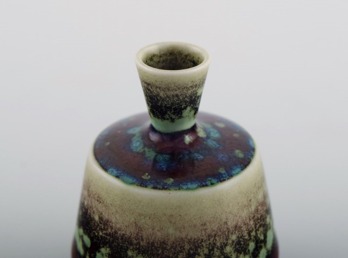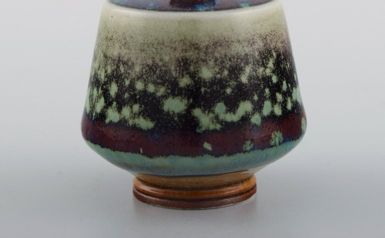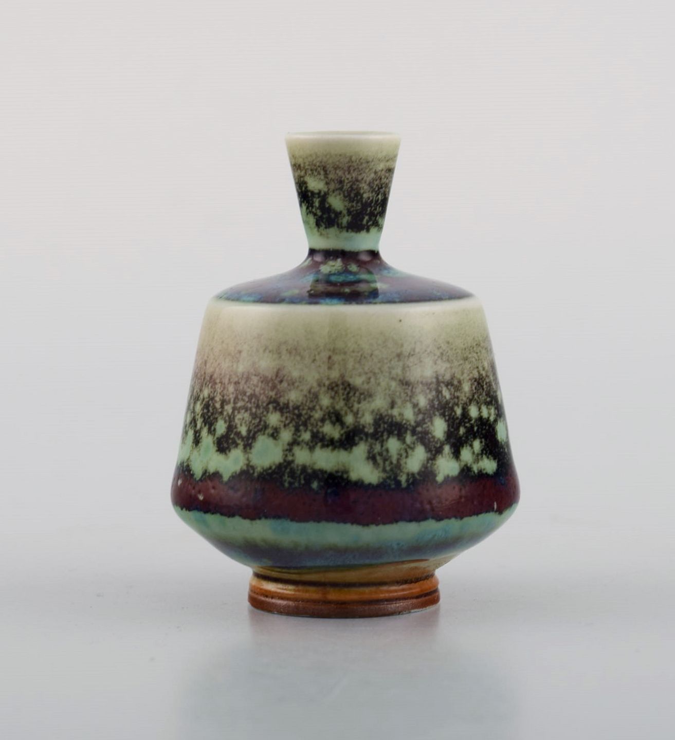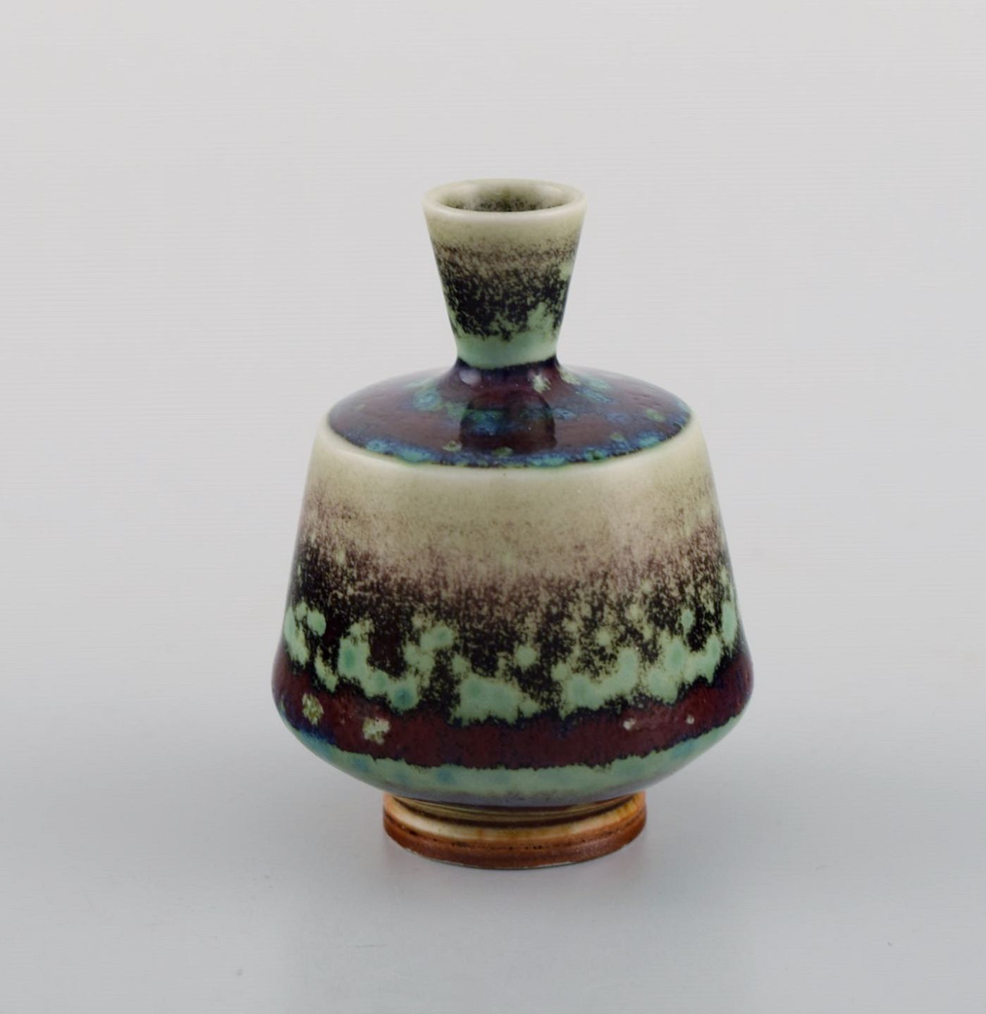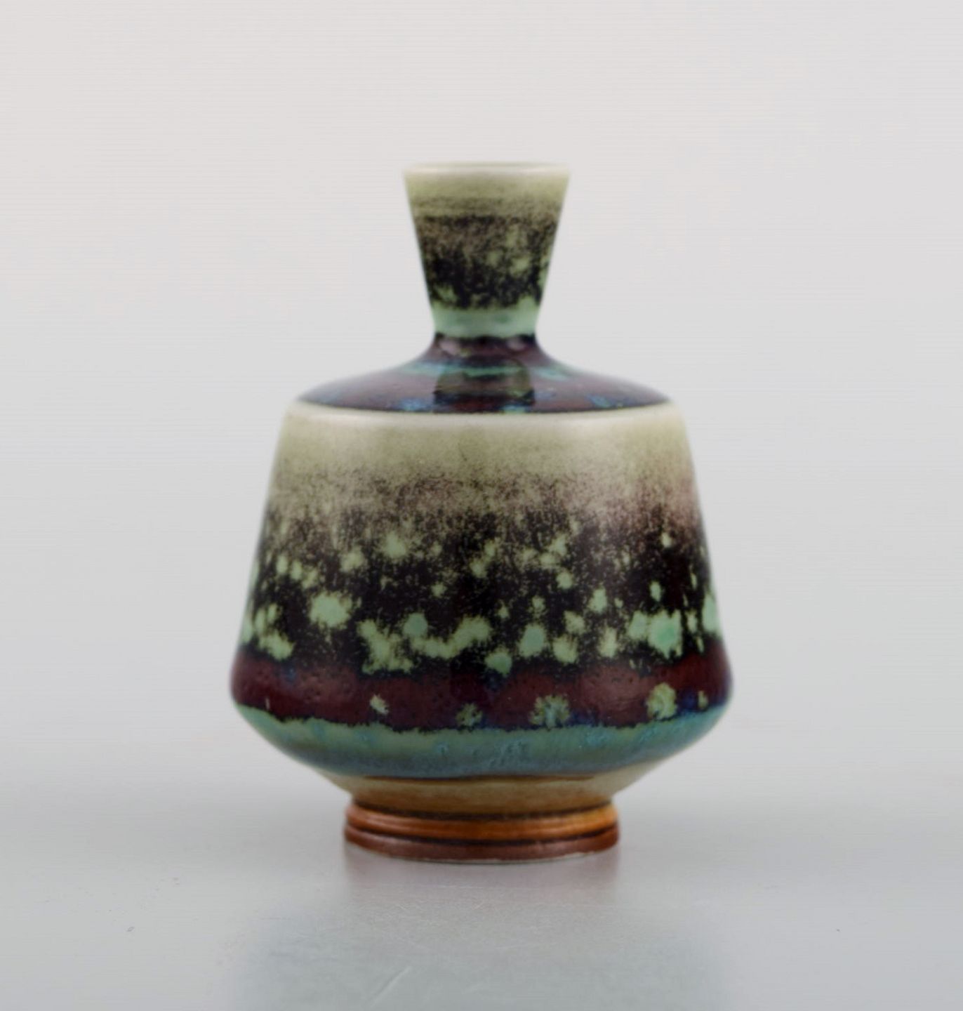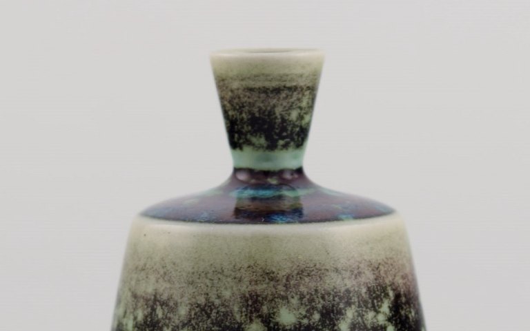 Berndt Friberg (1899-1981) for Gustavsberg Studiohand. Miniature vase i glaseret stentøj. Smuk Aniara glasur. Ca. 1970. Måler: 5,5 x 4,2 cm. I flot stand. Signeret.
