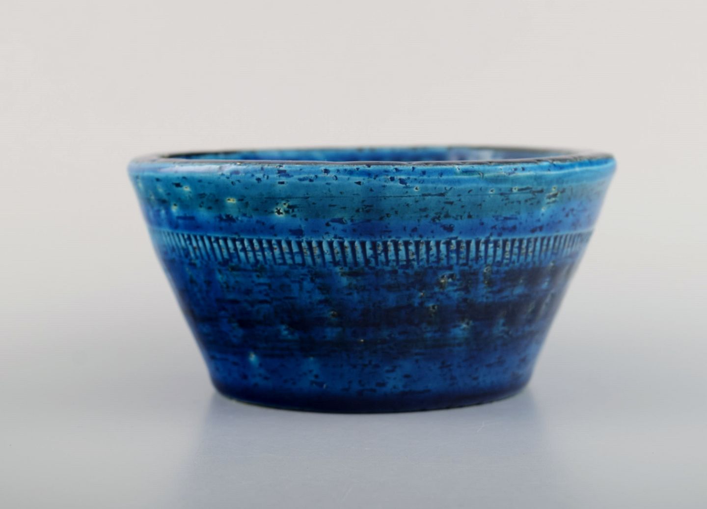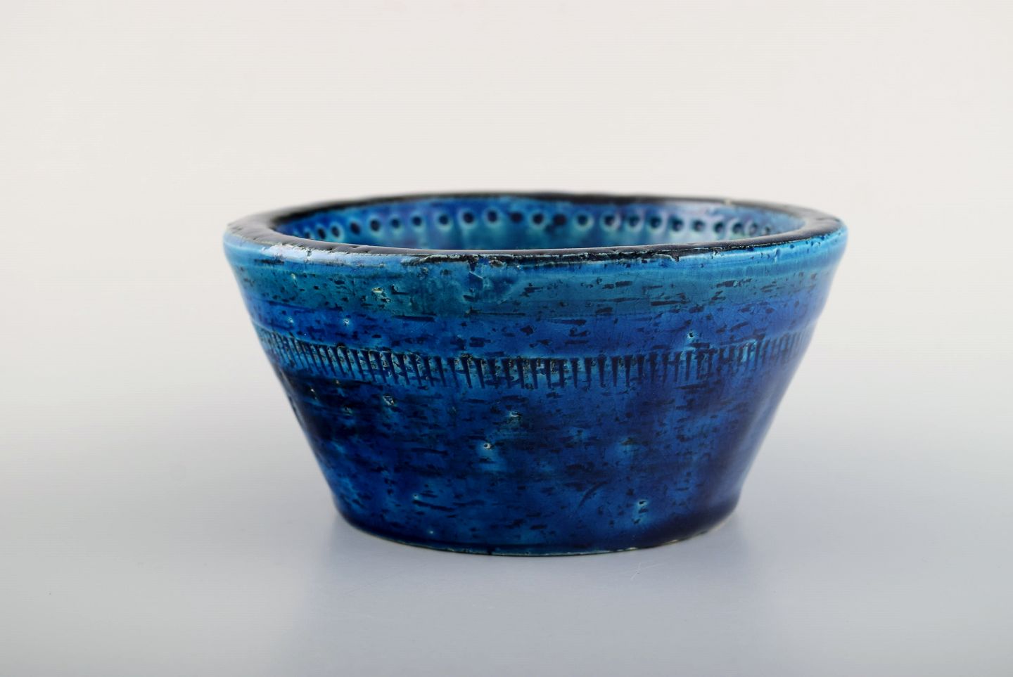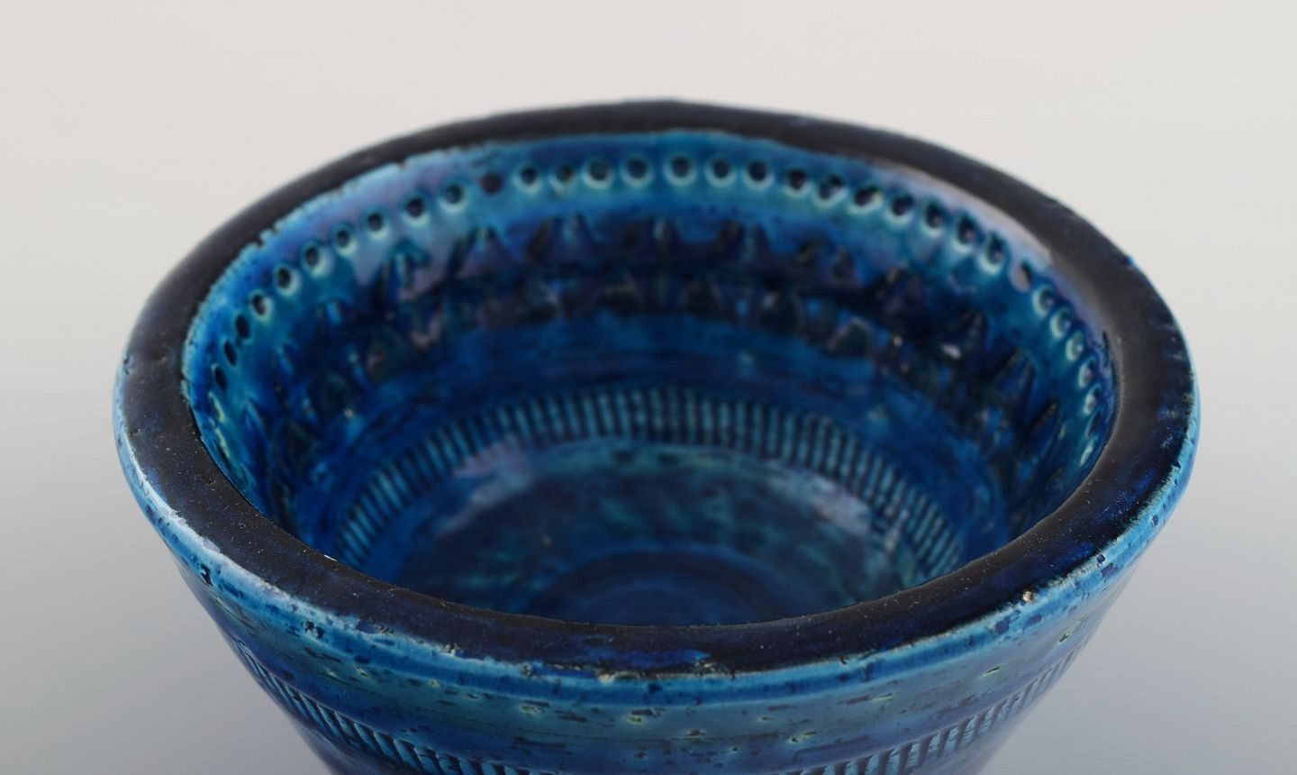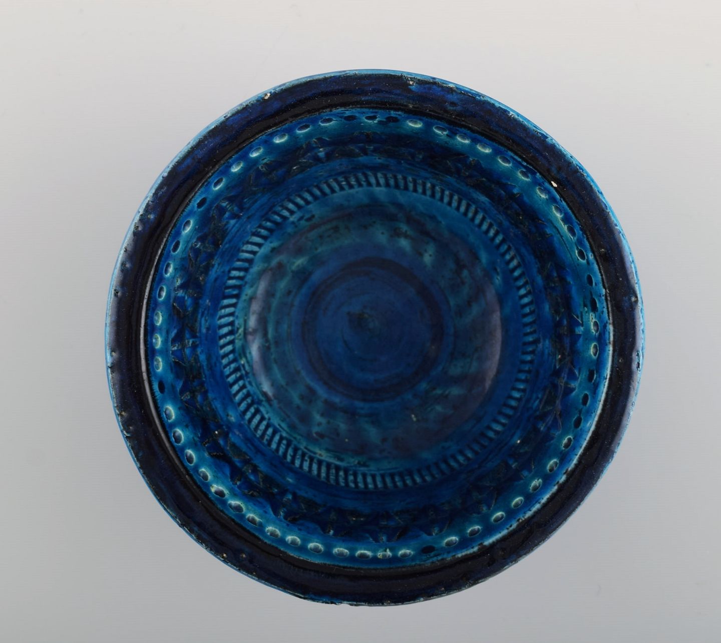 Aldo Londi for Bitossi. Skål i Rimini-blå glaseret keramik med geometriske mønstre. 1960'erne. Måler: 13 x 6,3 cm. I flot stand. Stemplet.