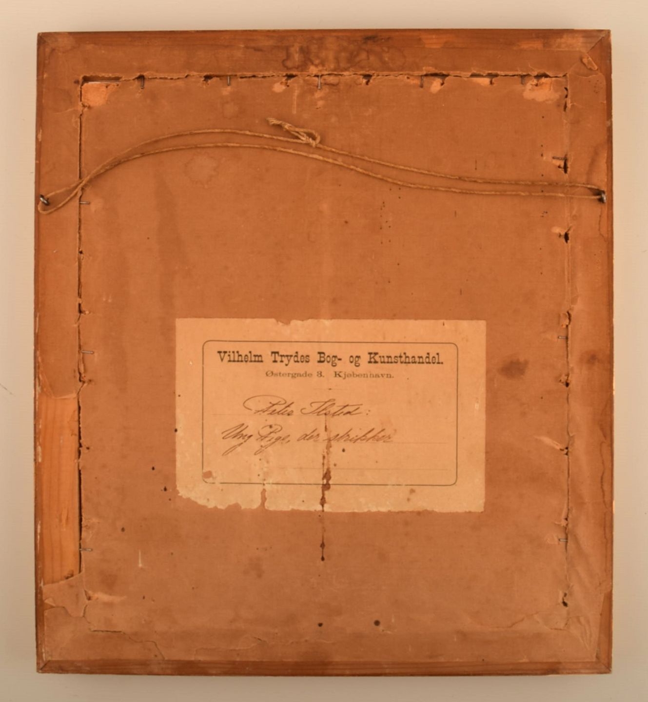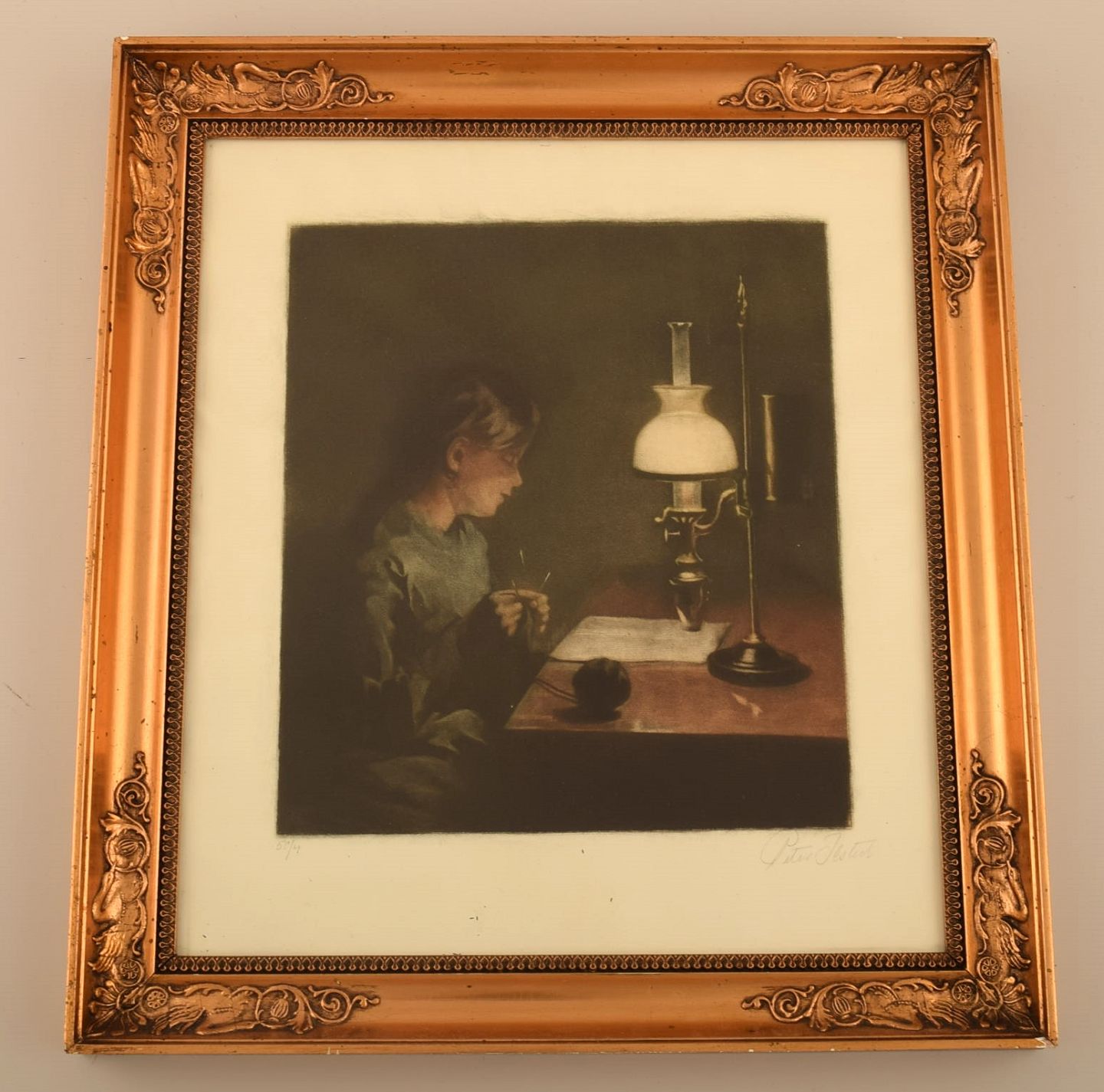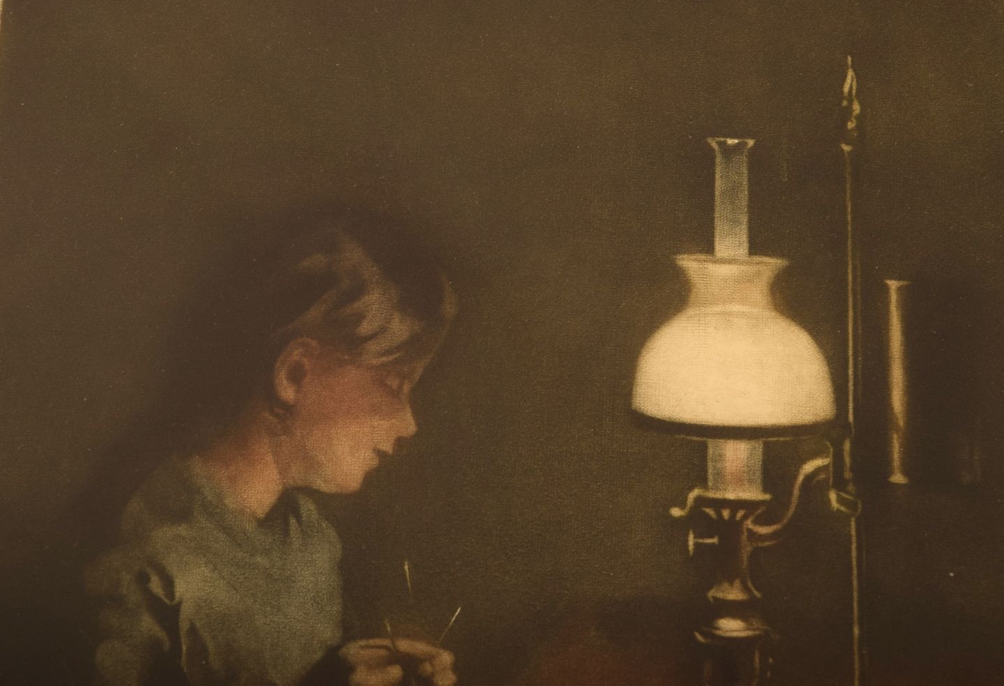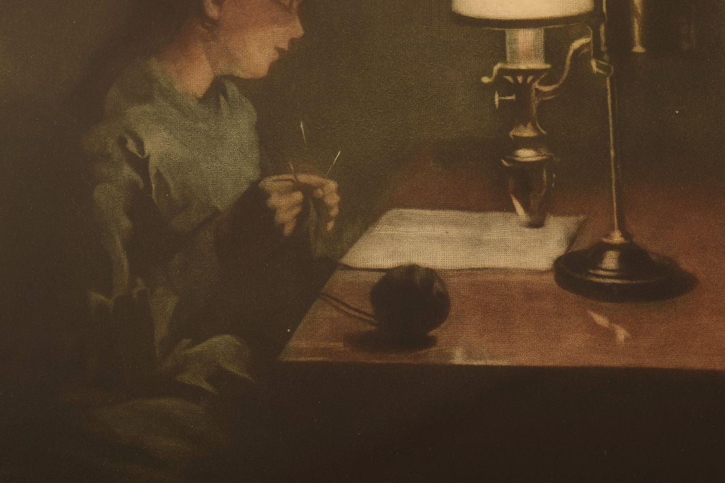 Peter Ilsted (1861-1933). Mezzotint in colors. Interior with young knitting woman. Approx. 1900.