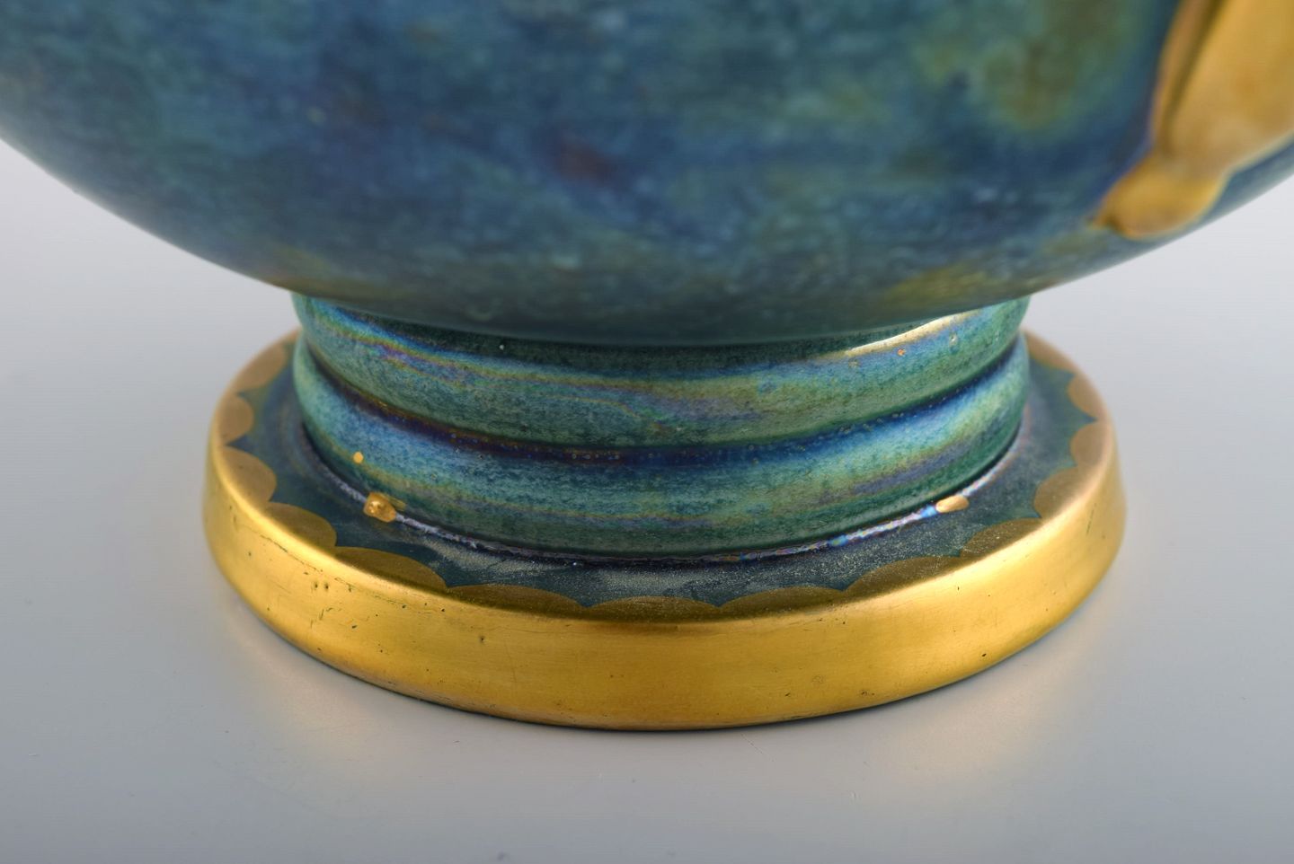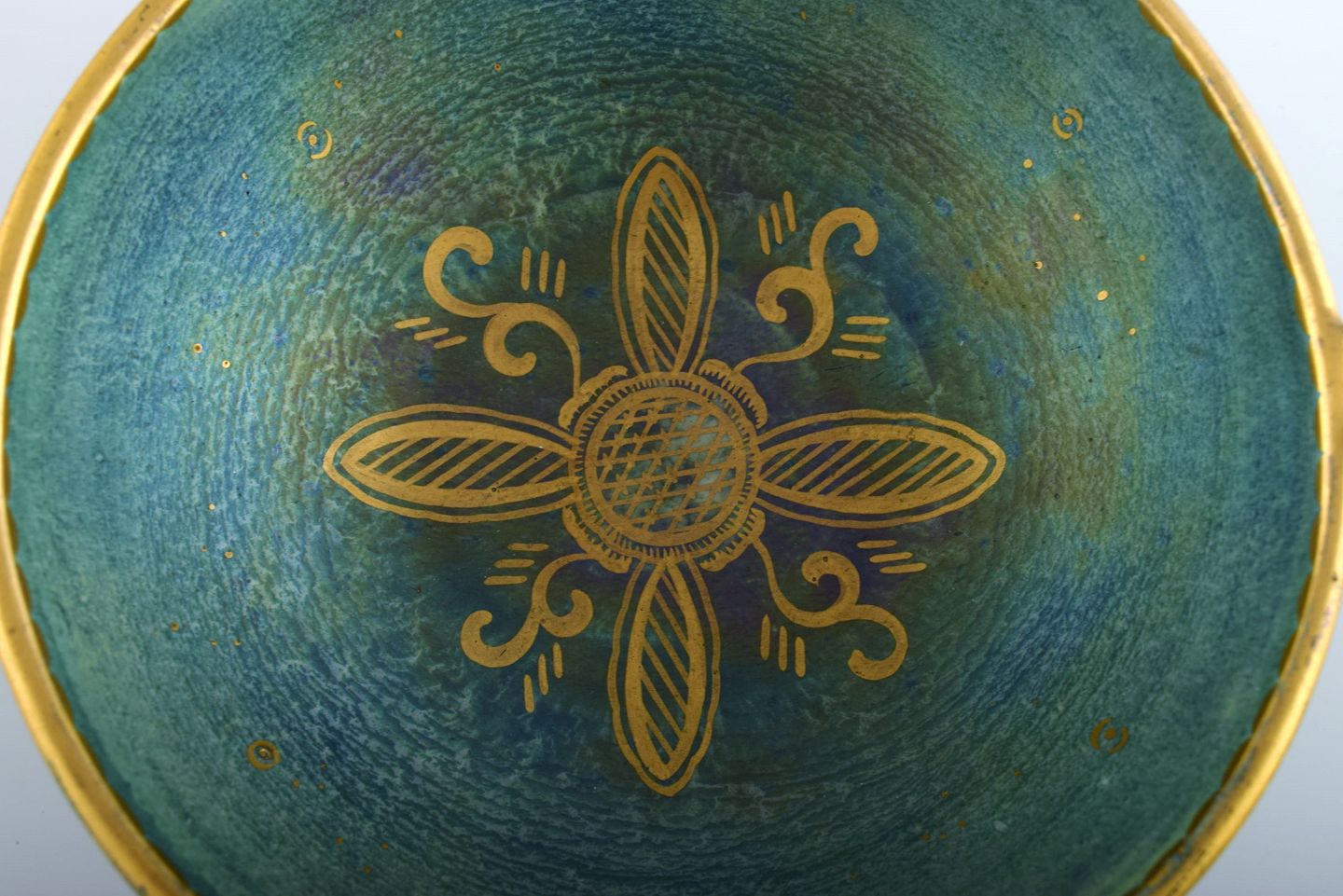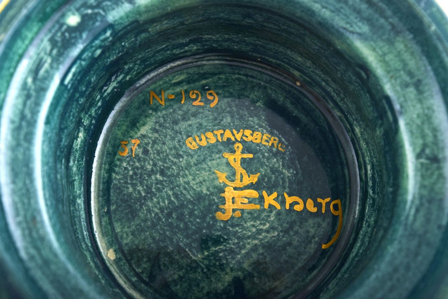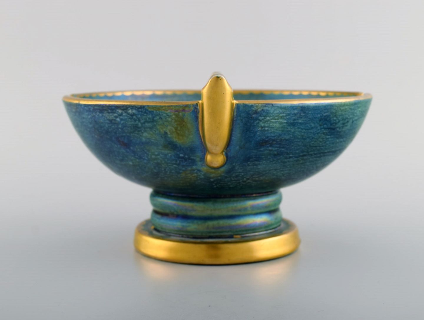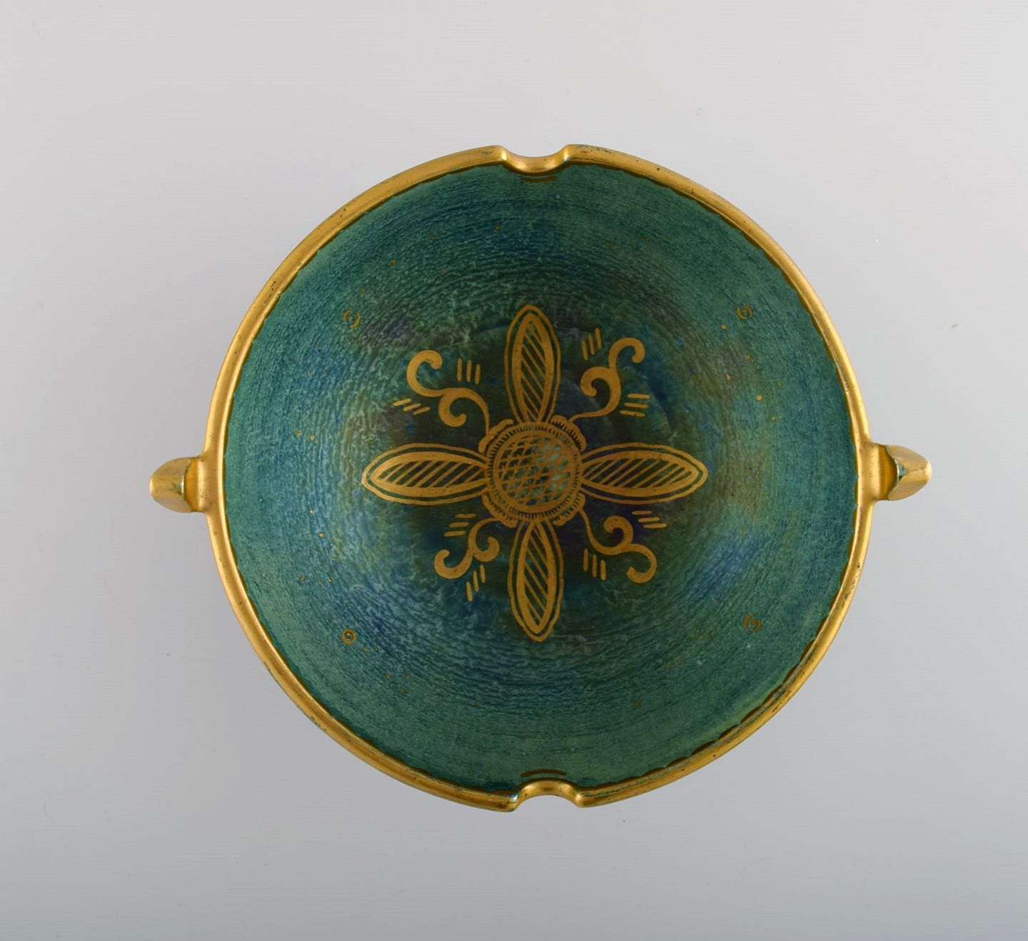 Josef Ekberg for Gustavsberg. Art deco skål i glaseret keramik. Smuk blågrøn glasur og gulddekoration. 1930'erne. Måler: 21,5 x 11 cm. I flot stand. Stemplet.