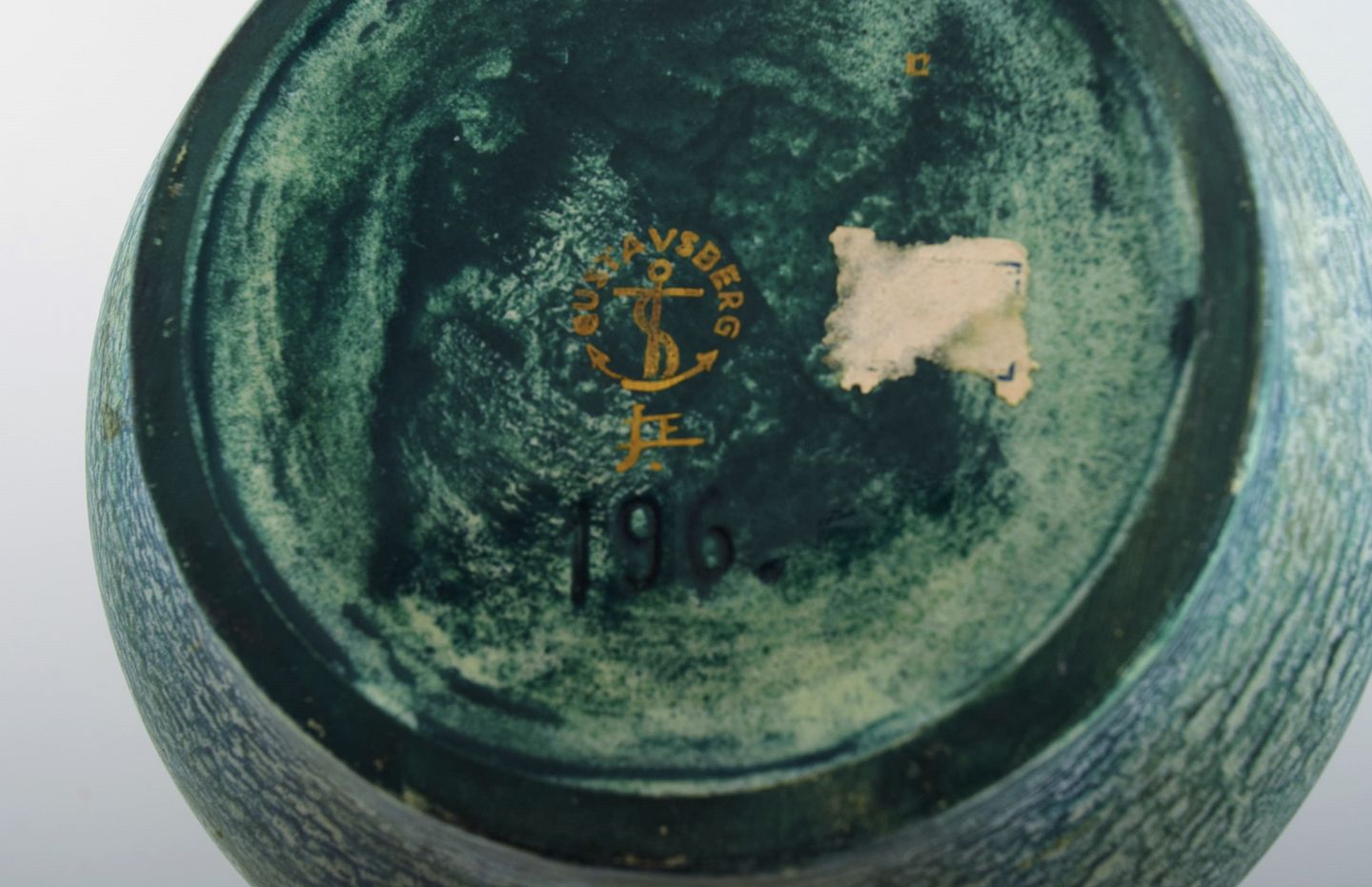 Josef Ekberg for Gustavsberg. Art deco vase med hanke i glaseret keramik. Smuk blågrøn glasur og gulddekoration. 1930'erne. Måler: 21 x 17 cm. I flot stand. Stemplet.