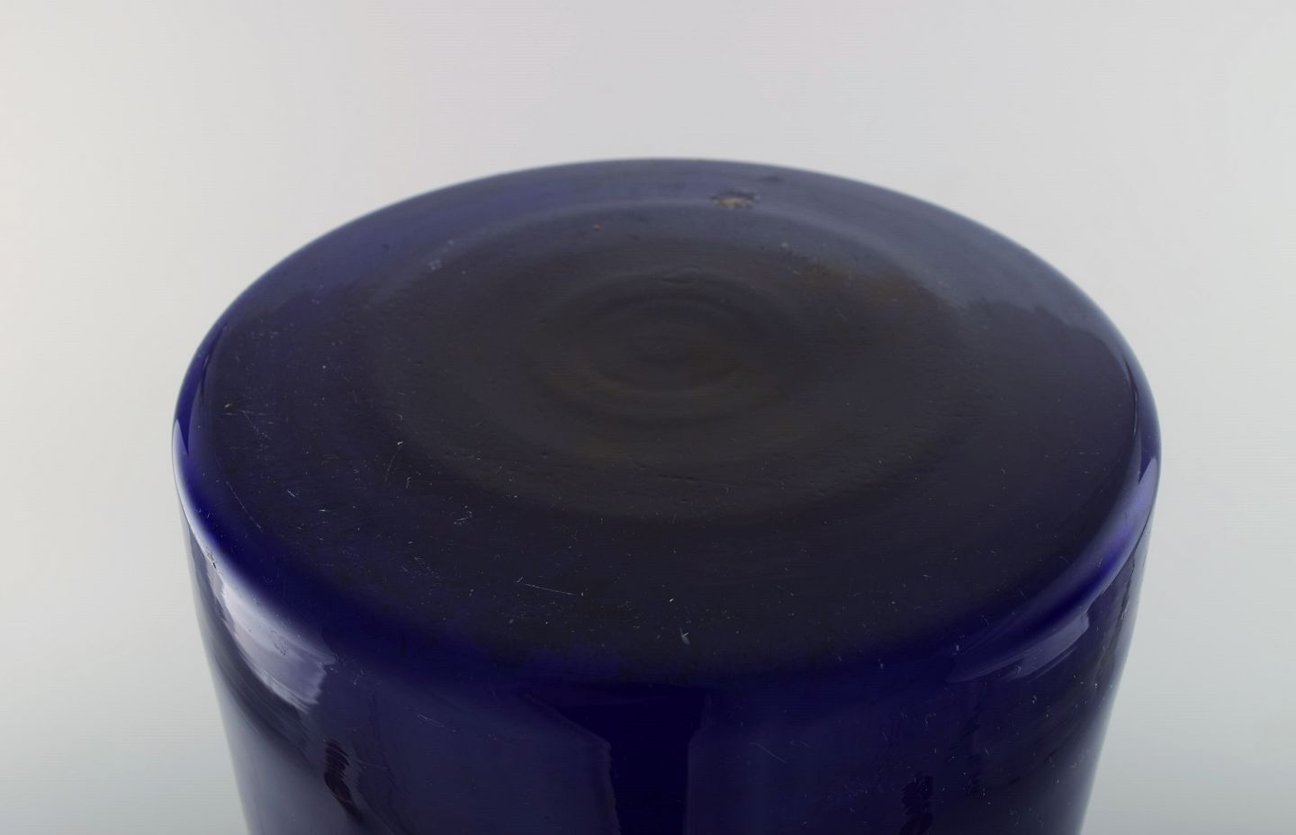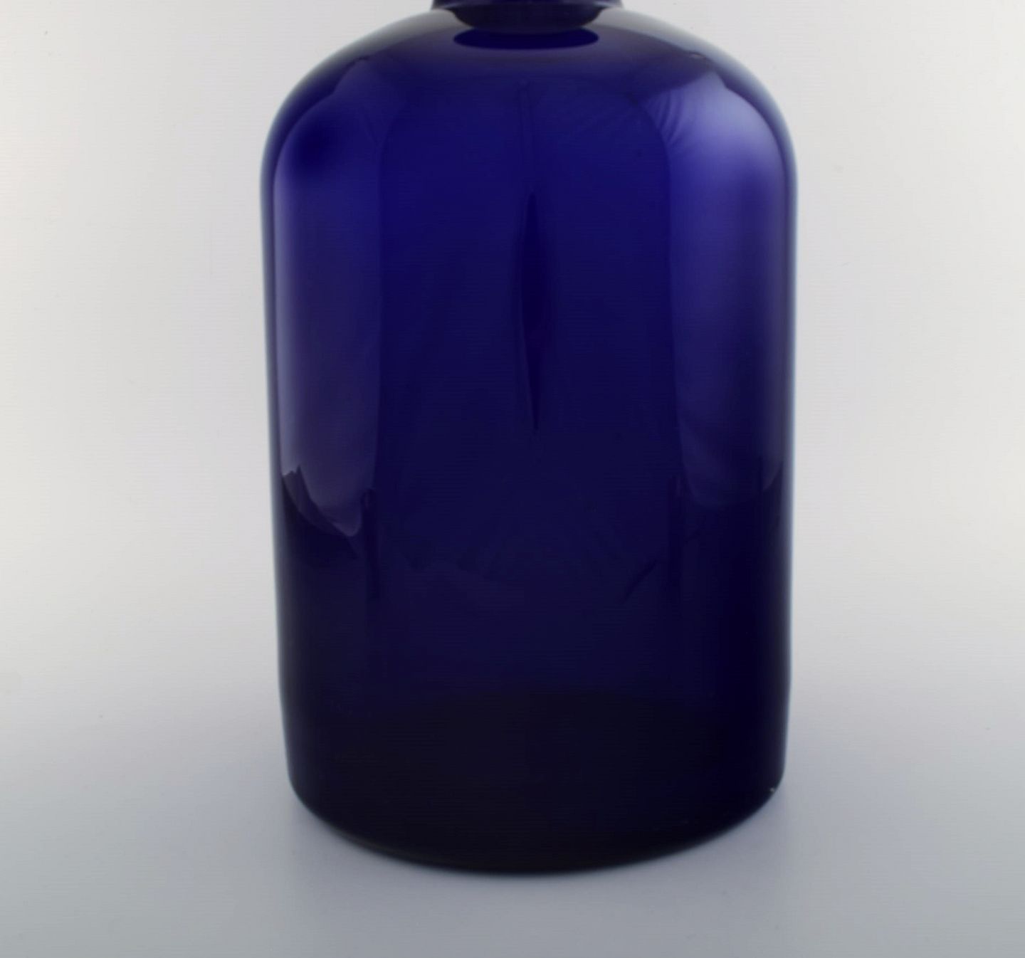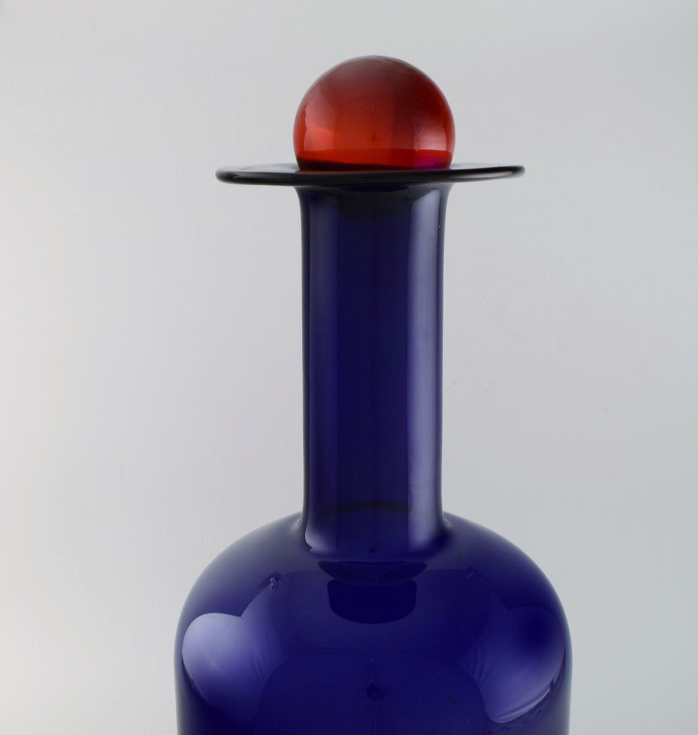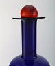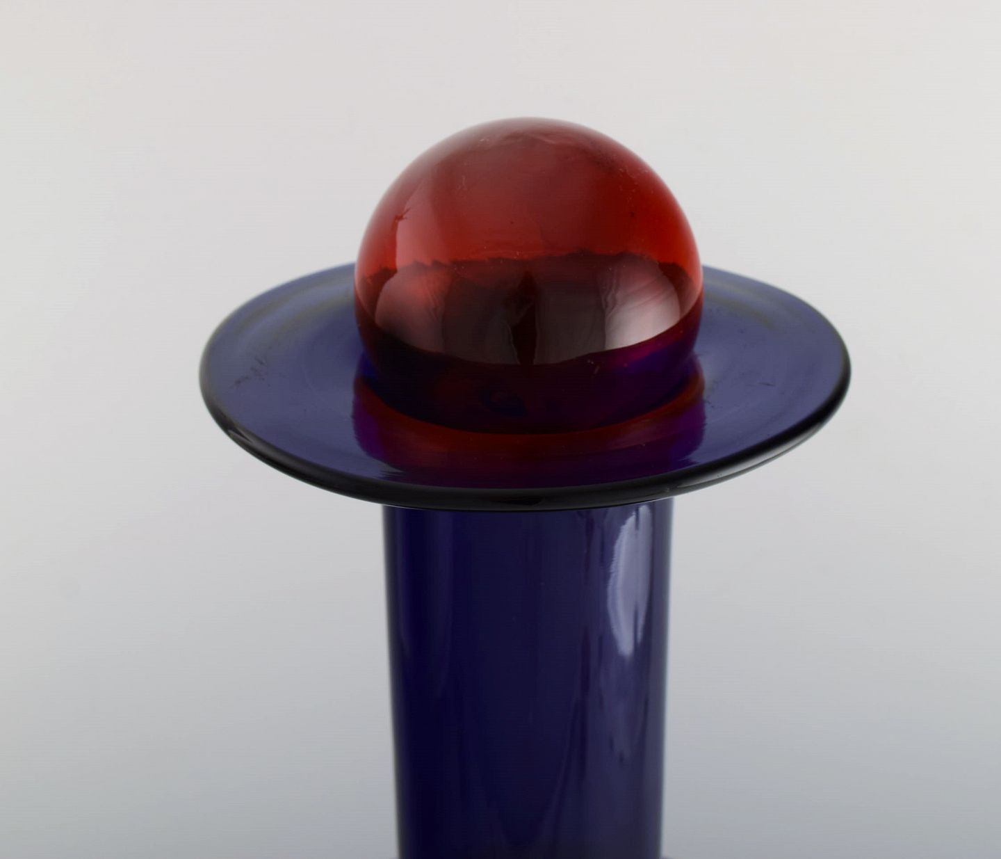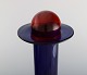 Otto Brauer for Holmegaard. Stor vase/flaske i blåt kunstglas med rød kugle. 1960'erne.