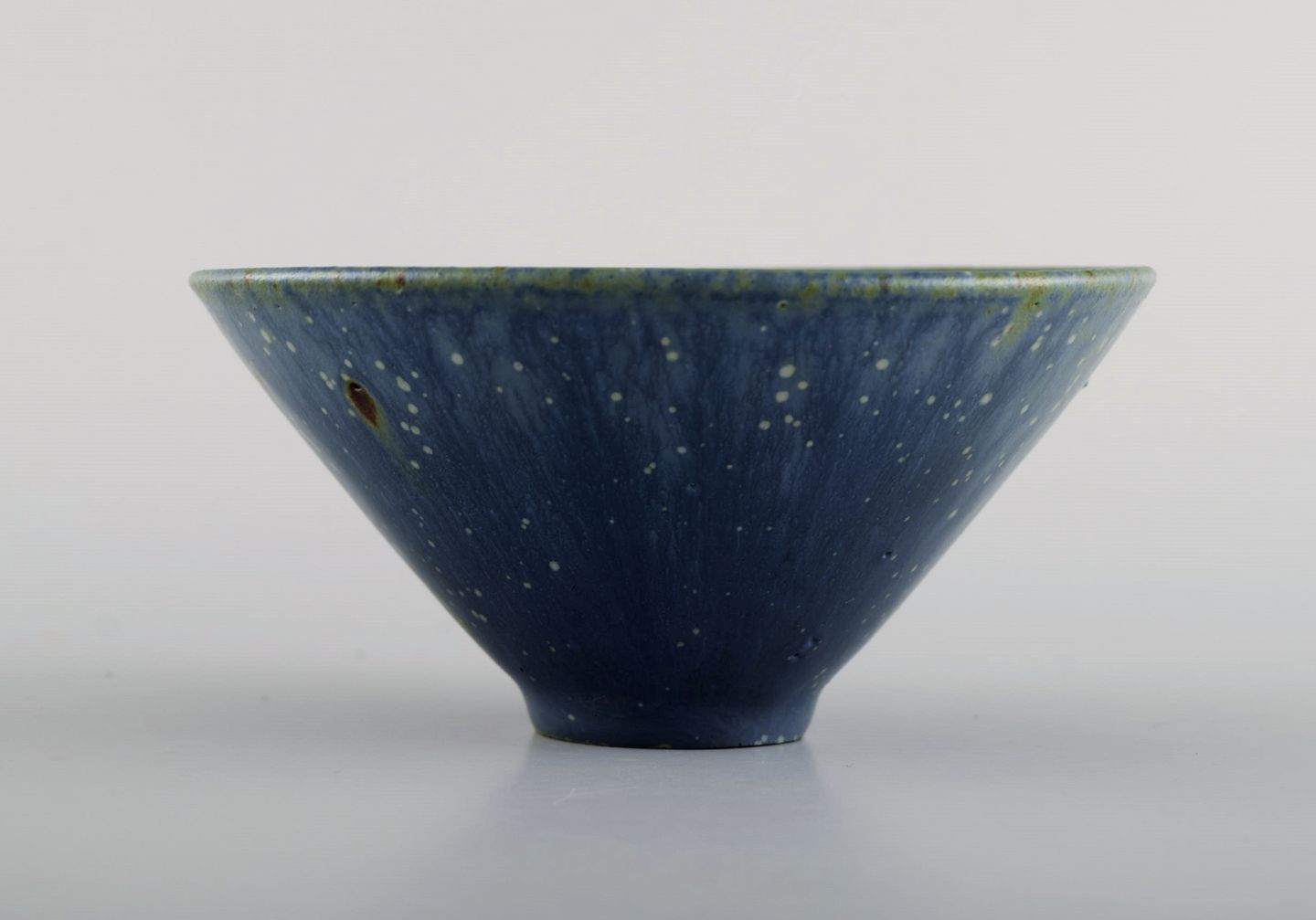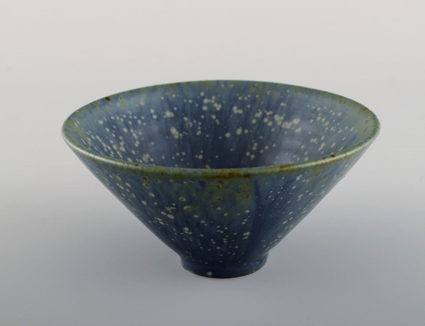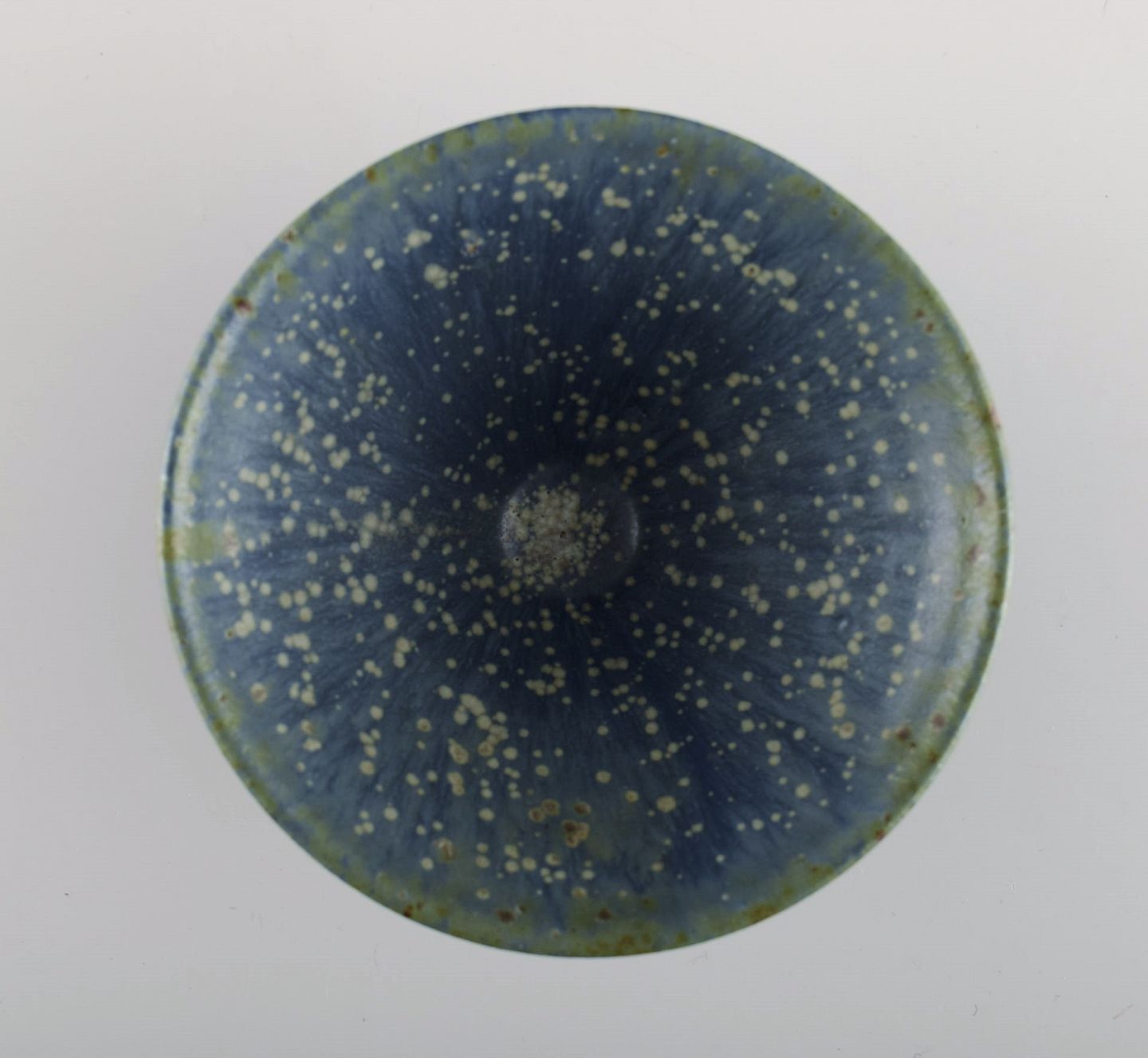 Arne Bang (1901-1983), Danmark. Skål i glaseret keramik. Modelnummer 146. Smuk spættet glasur i blå og grå nuancer. 1940/50'erne.