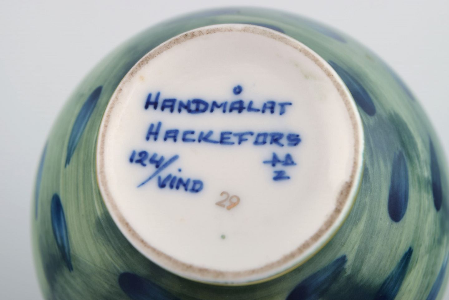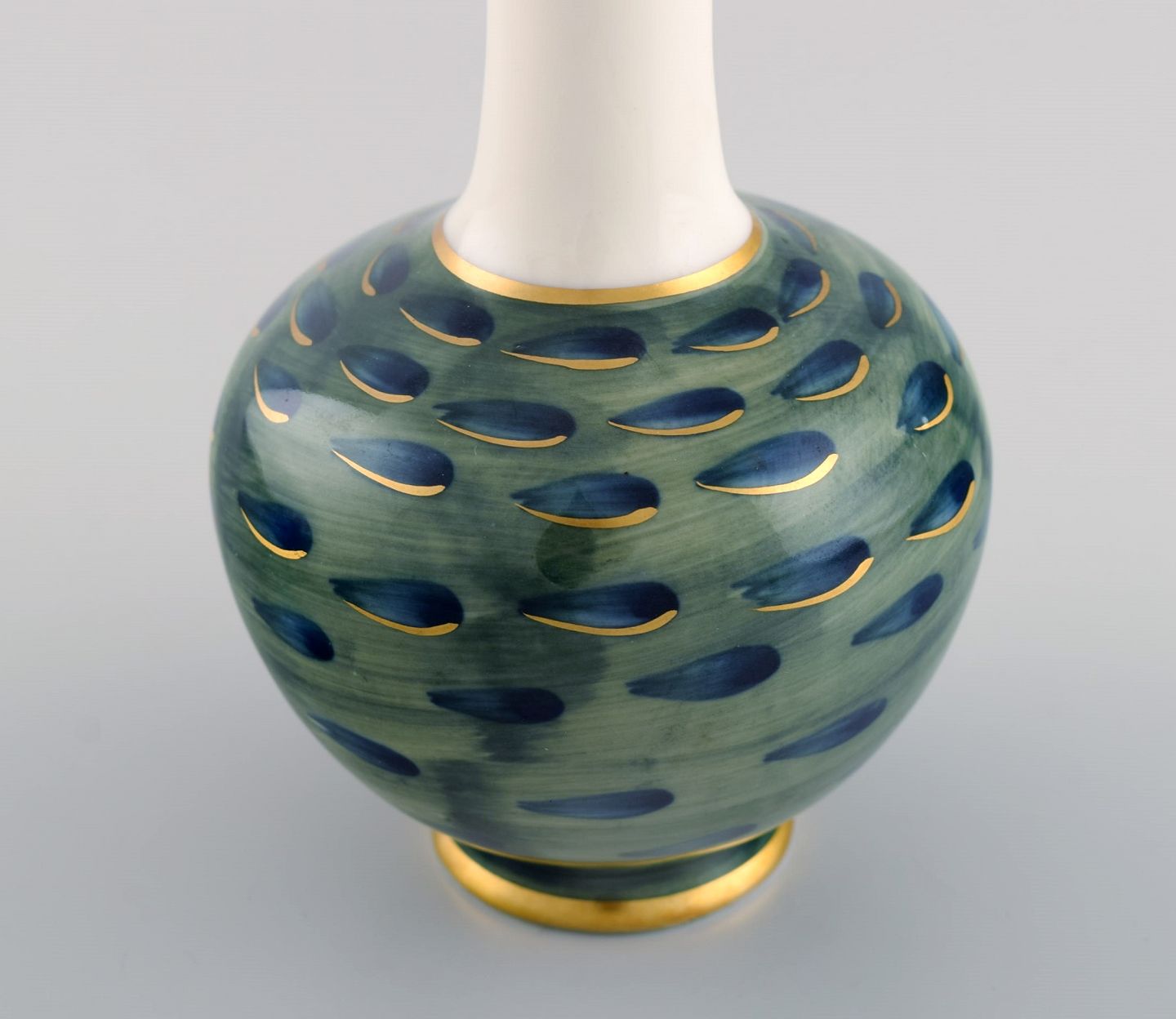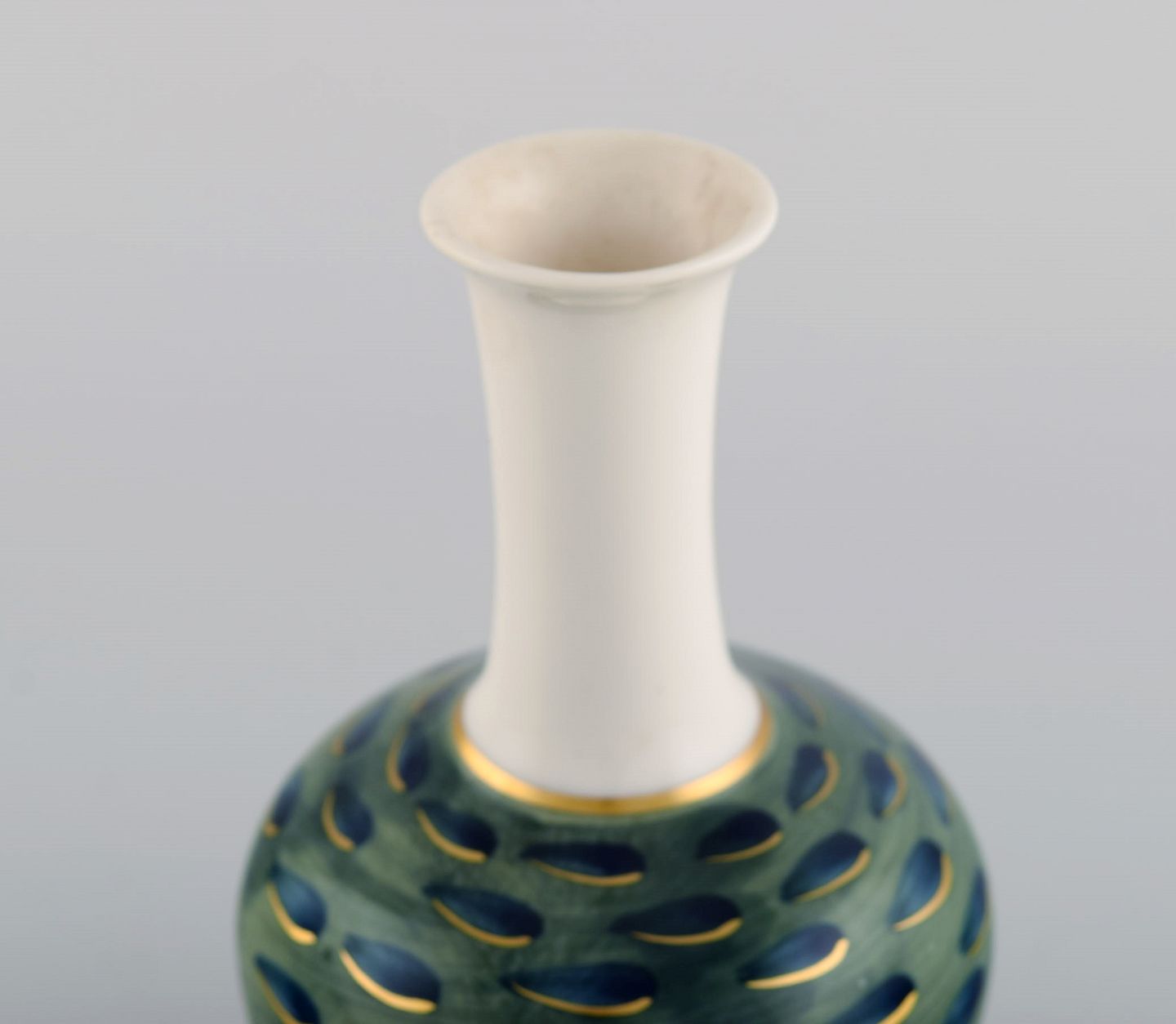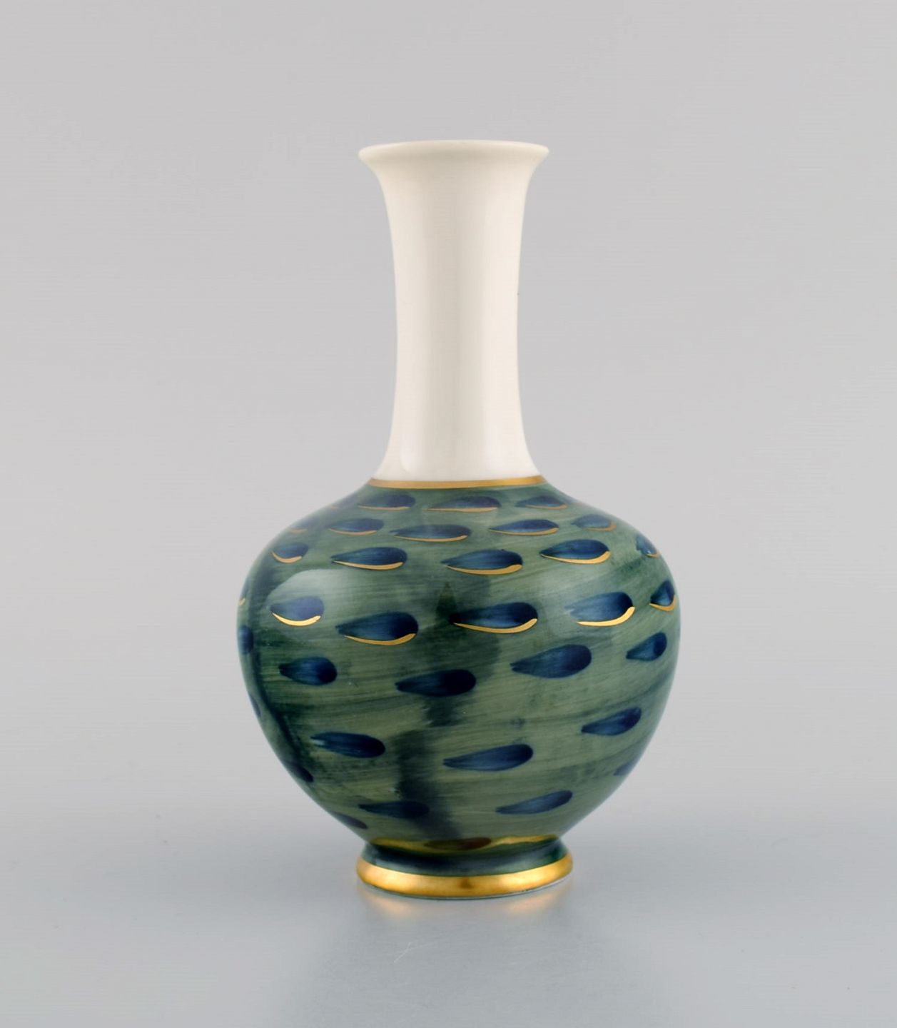 Hackefors, Sverige. Vase i håndmalet porcelæn. Grønne og blå nuancer med gulddekoration. Midt 1900-tallet.