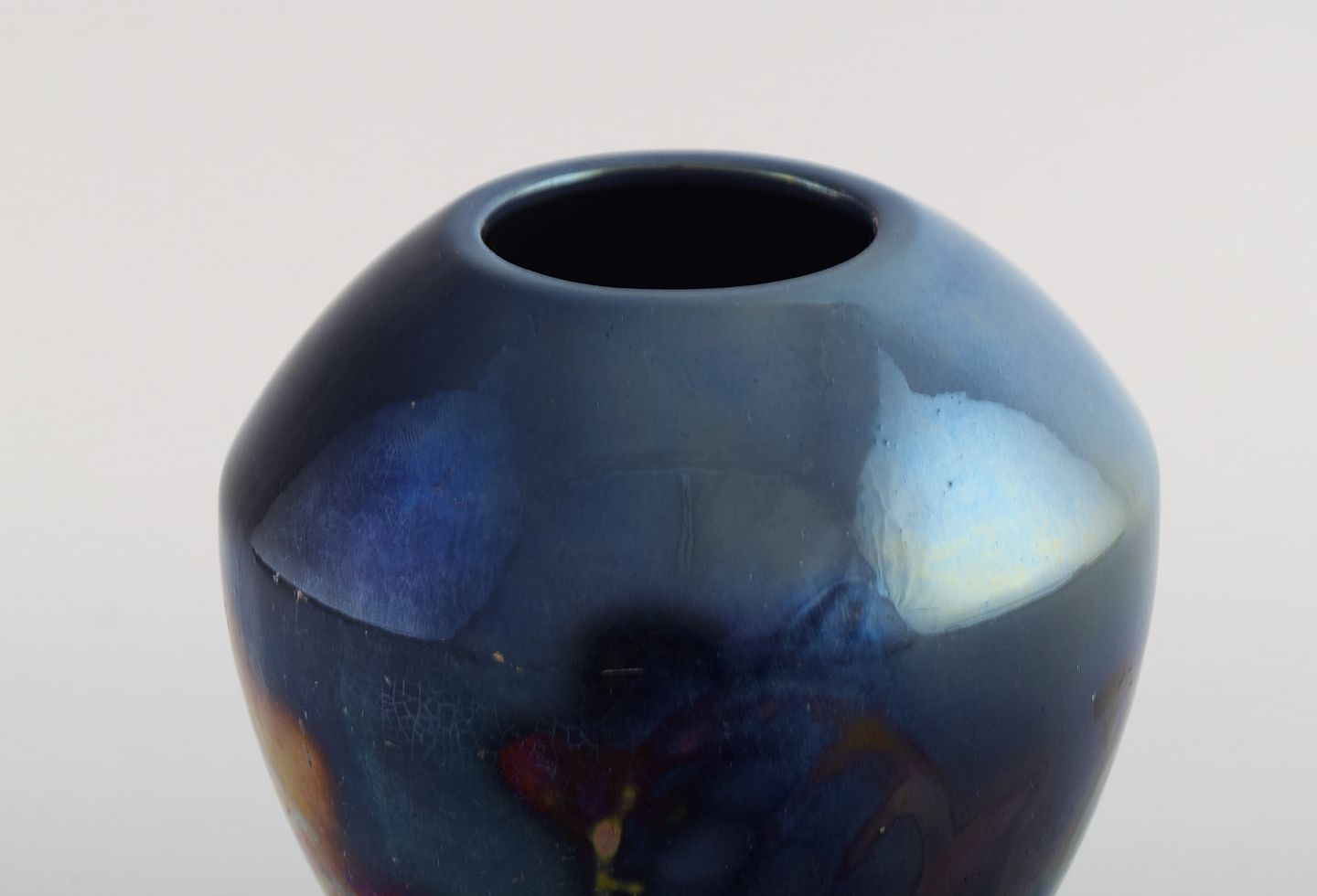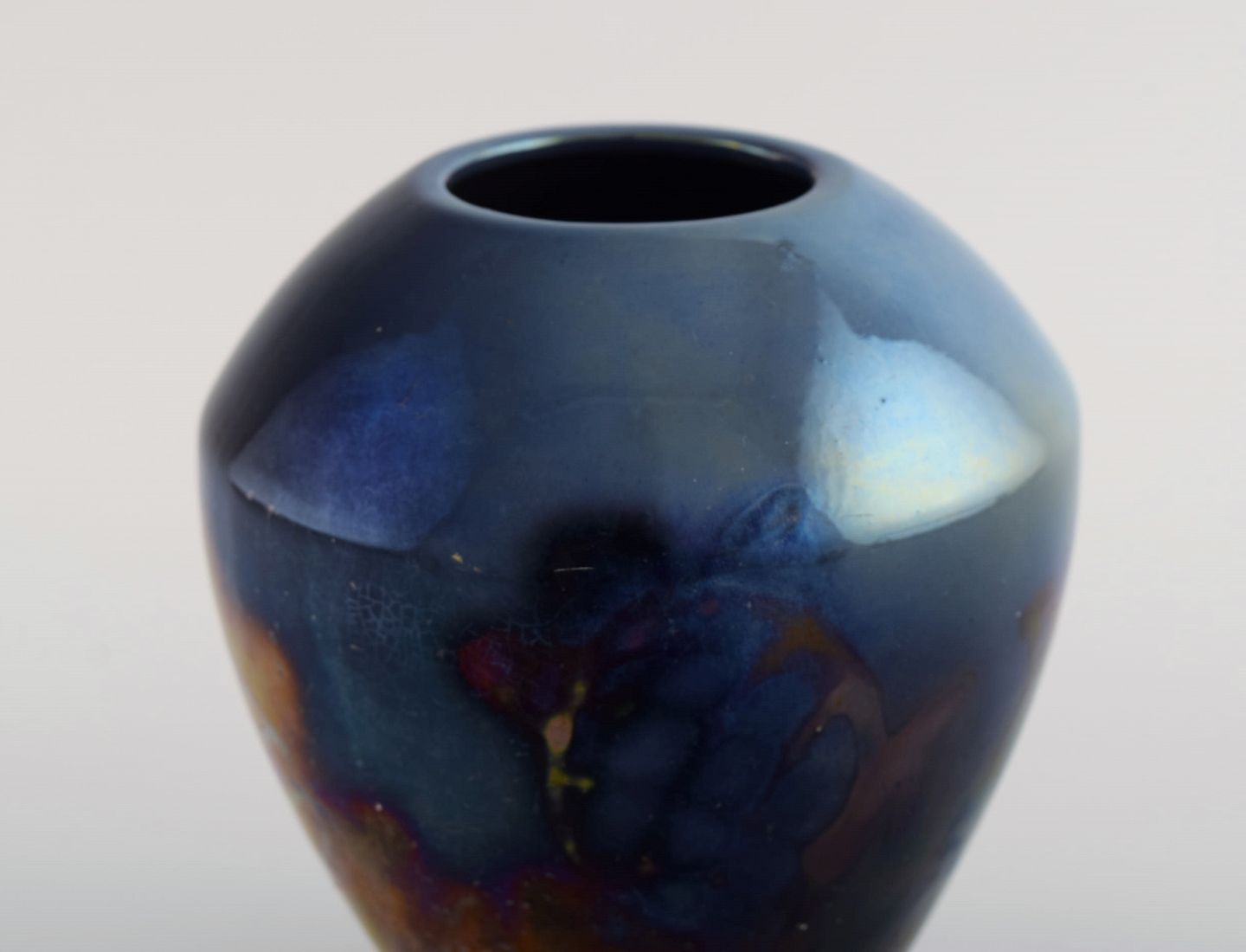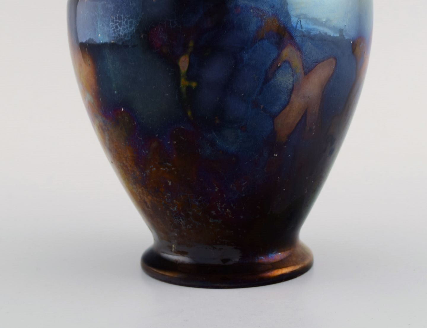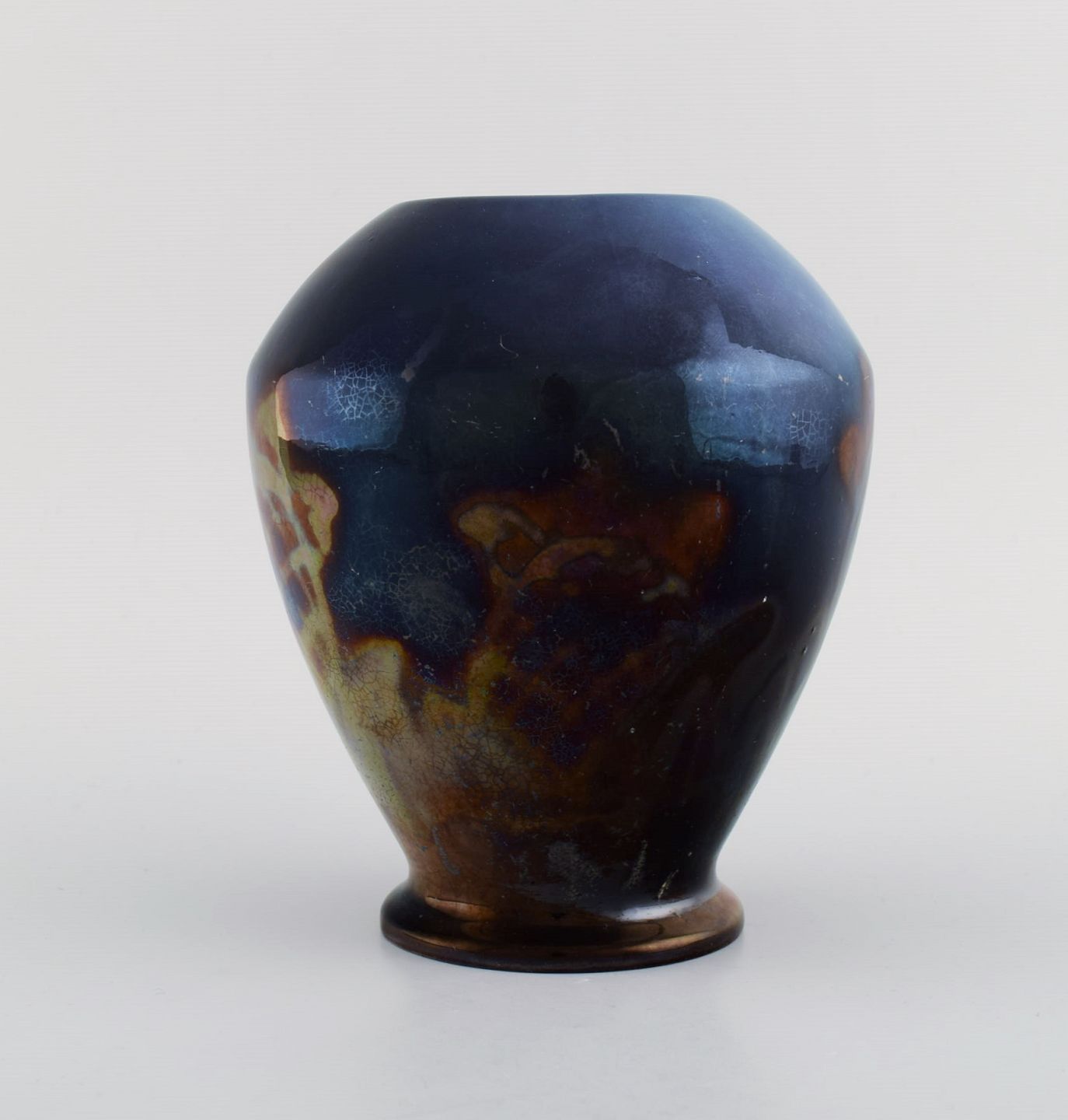 Edgar Böckman (1890-1981) for Höganäs. Vase i glaseret keramik. Smuk lustre glasur og håndmalede blomster. 1930'erne. Måler: 16,5 x 14,5 cm. I flot stand.