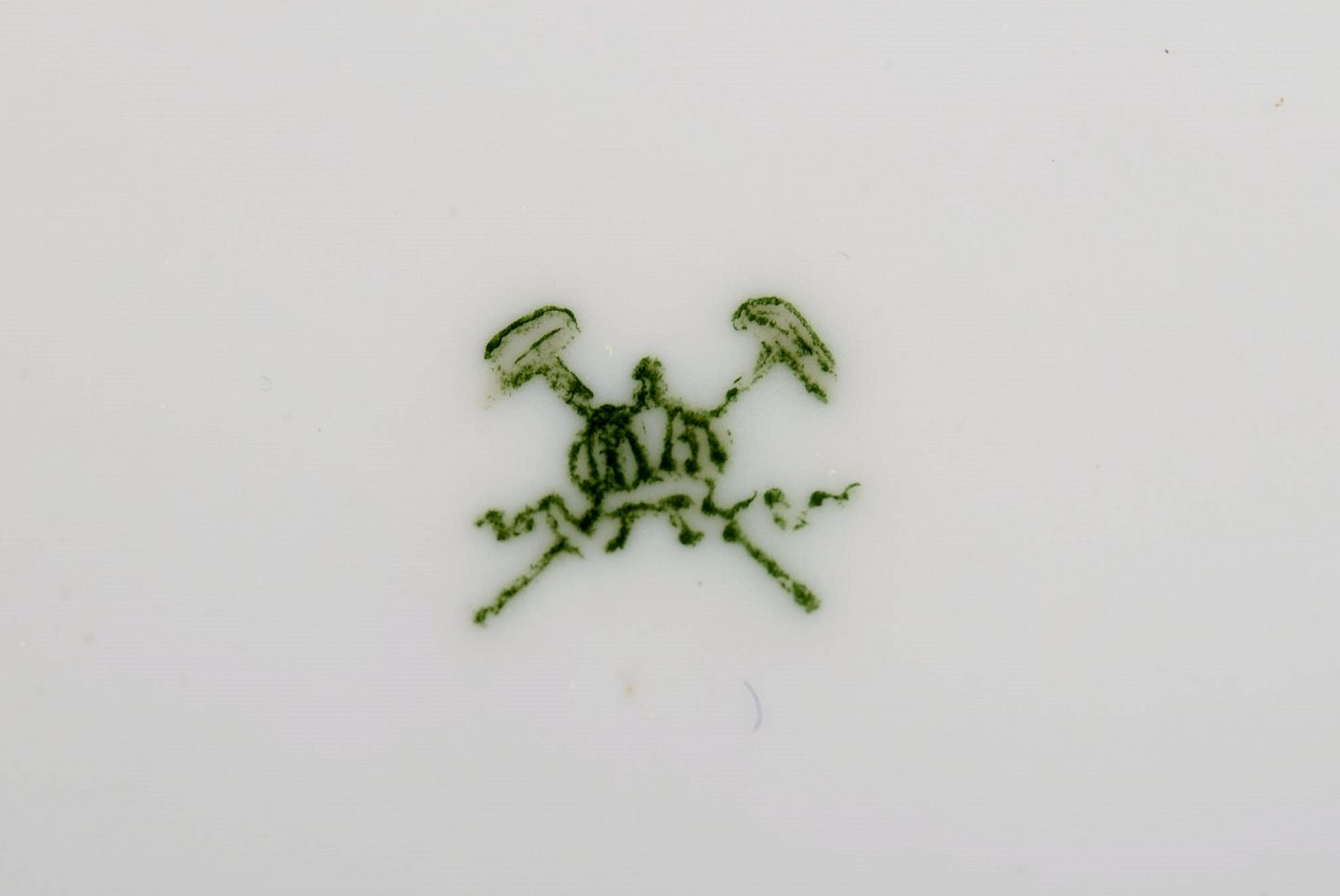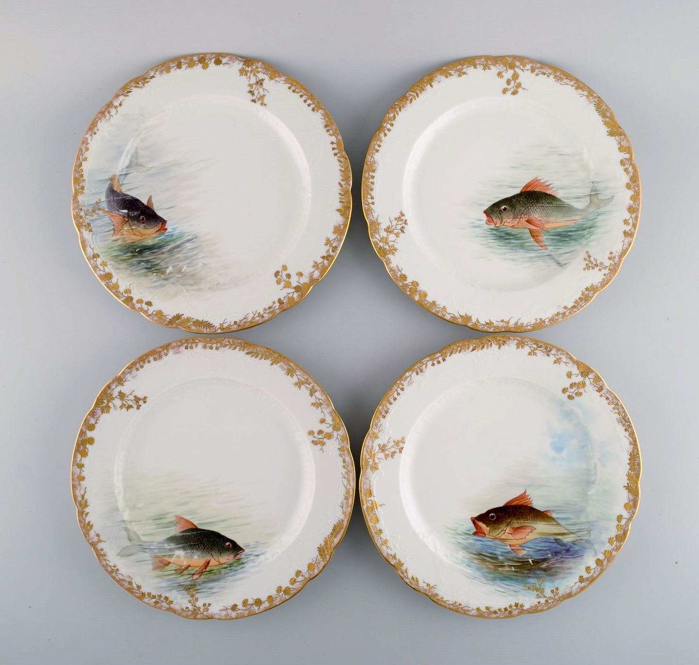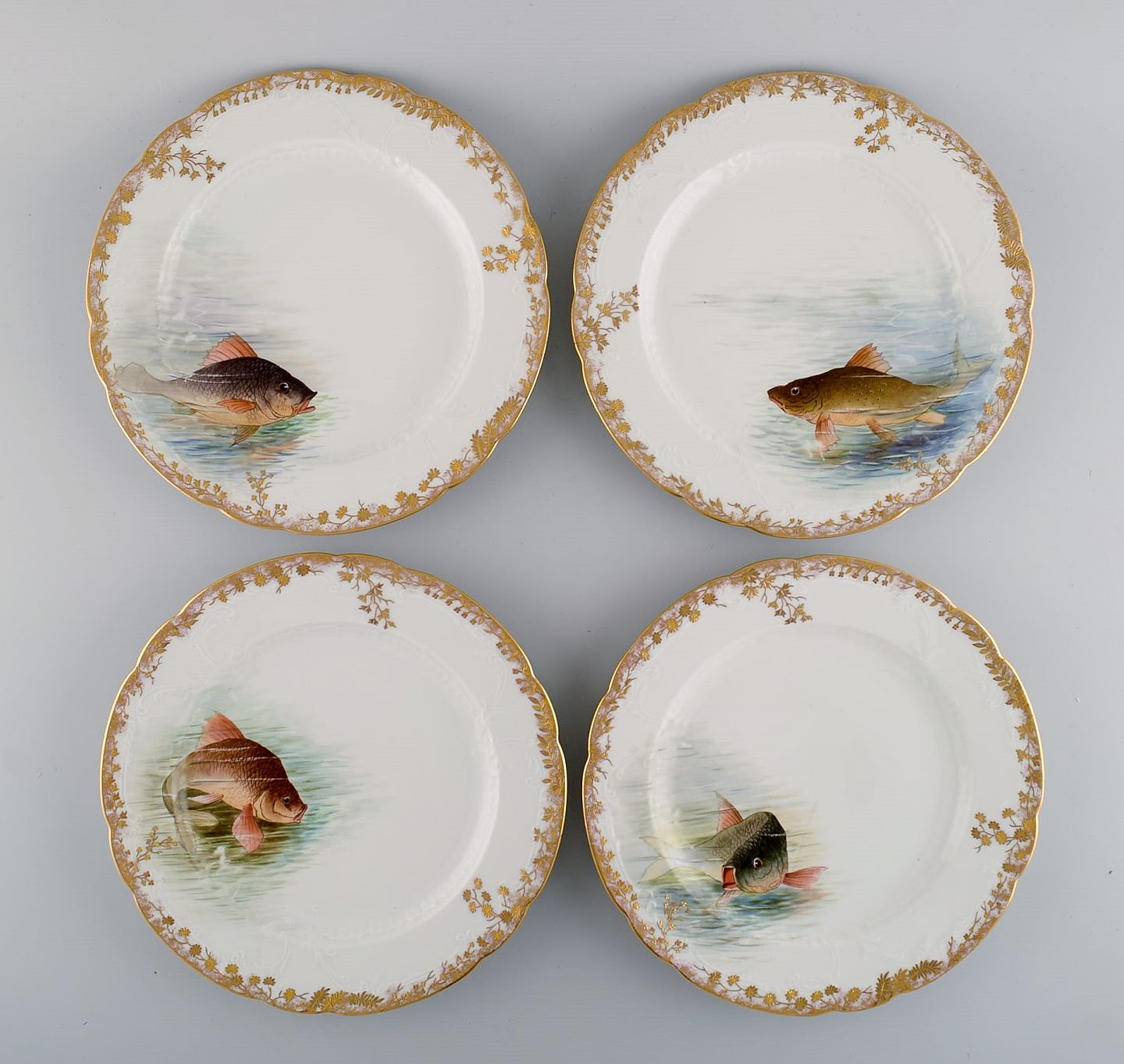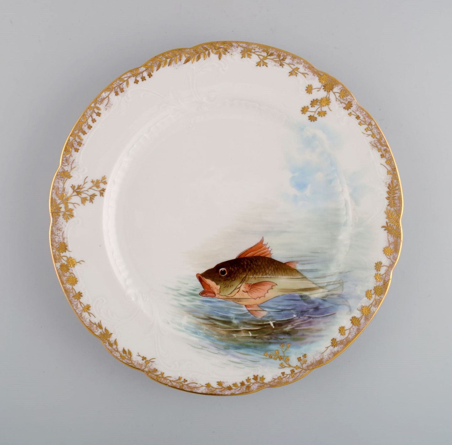 Tolv antikke Pirkenhammer middagstallerkener i porcelæn med håndmalede fisk og gulddekoration. Høj kvalitet, tidligt 1900-tallet.