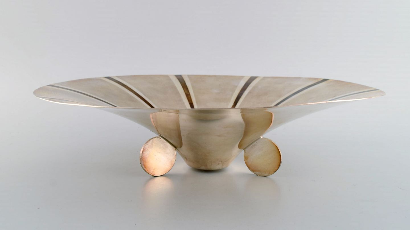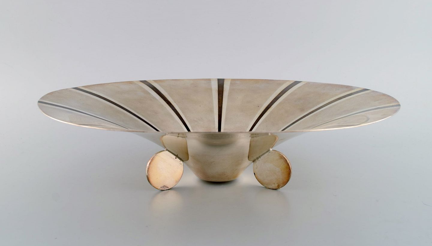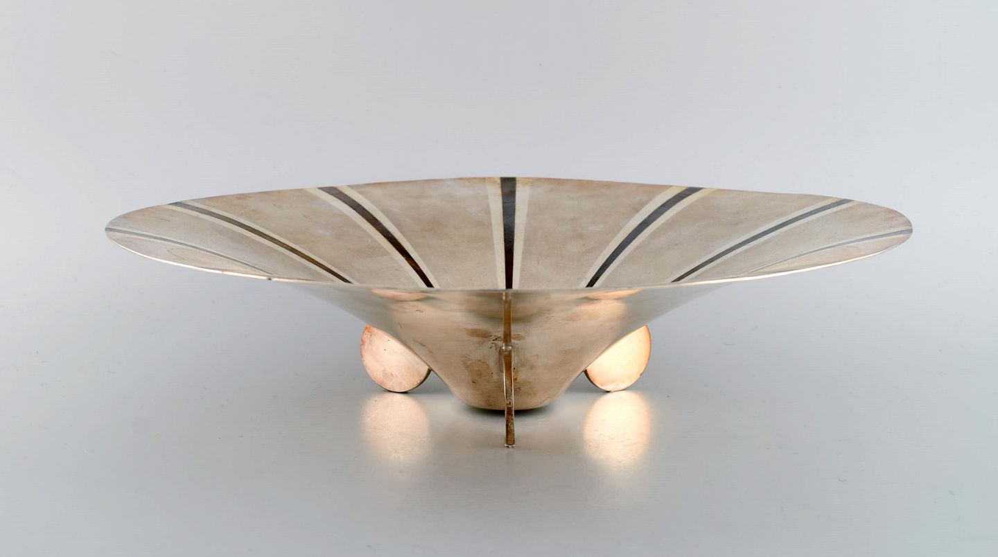 WMF, Tyskland. Stor art deco Ikora skål på trefod i nysølv indlagt med messing. 1940'erne.