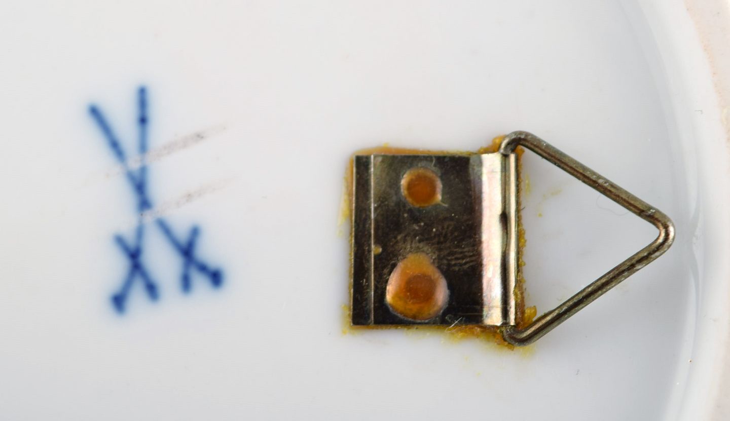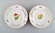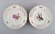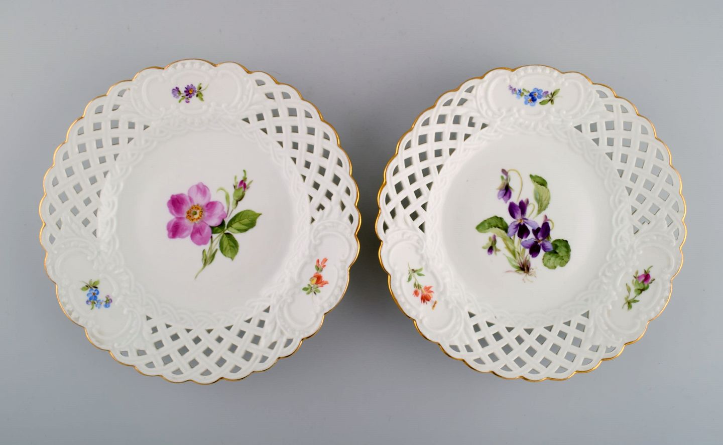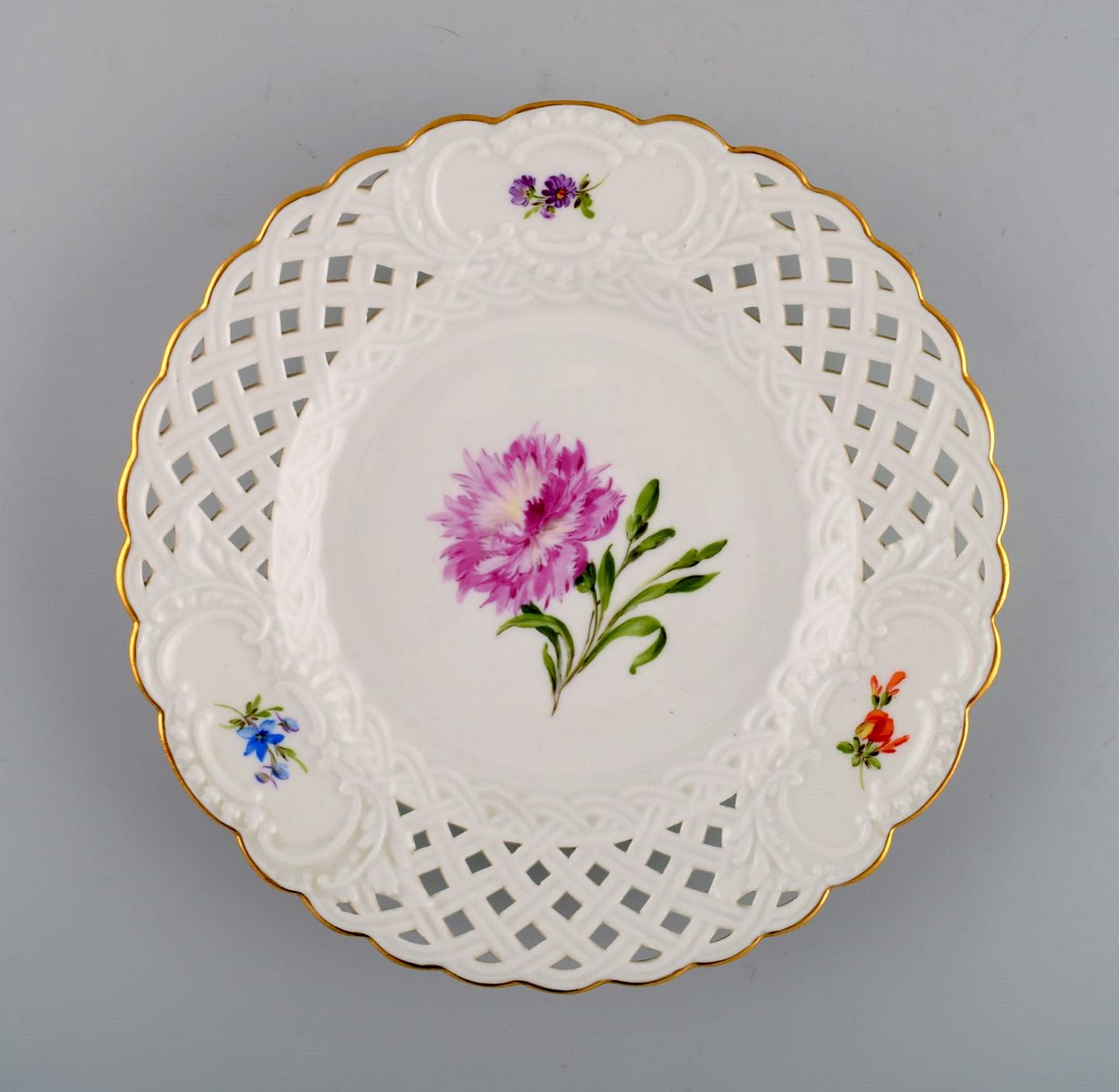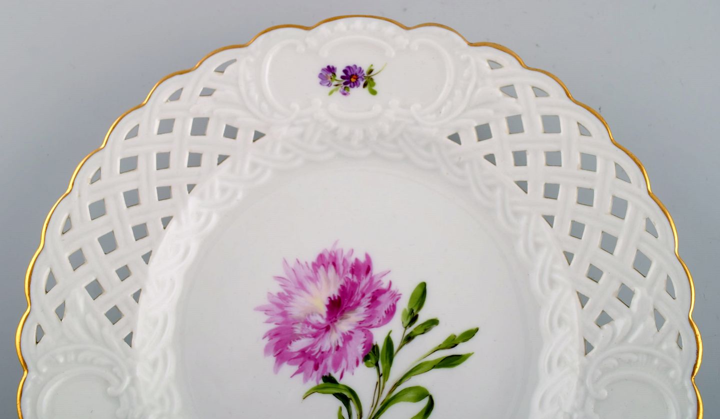 Fem antikke Meissen tallerkener i gennembrudt porcelæn med håndmalede blomster og guldkant. Tidligt 1900-tallet. Diameter: 20,5 cm. I flot stand. Stemplet. 1. Sortering.