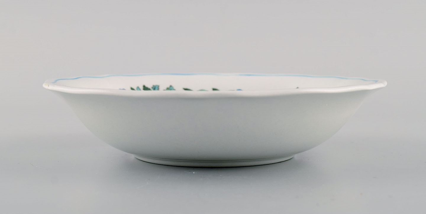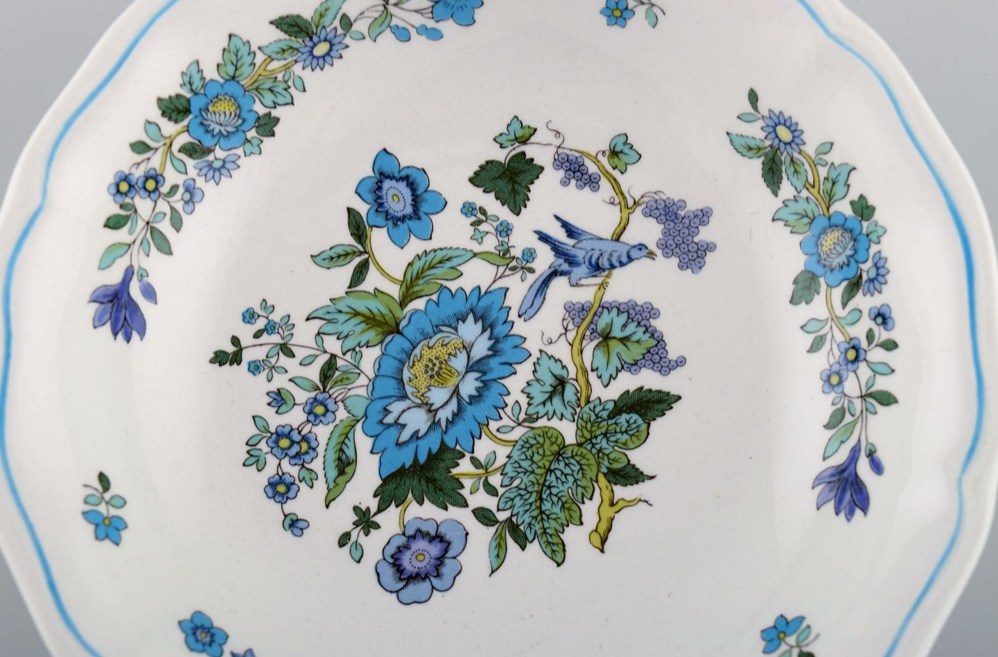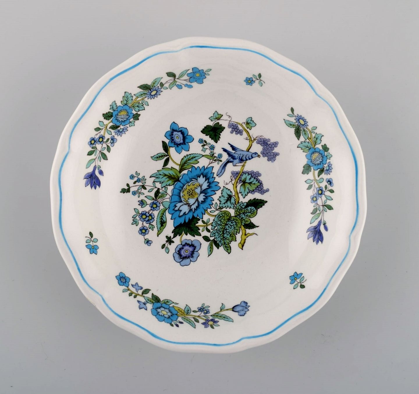 Spode, England. Tolv små dybe tallerkener i håndmalet porcelæn med blomster- og fuglemotiver. 1960/70'erne.