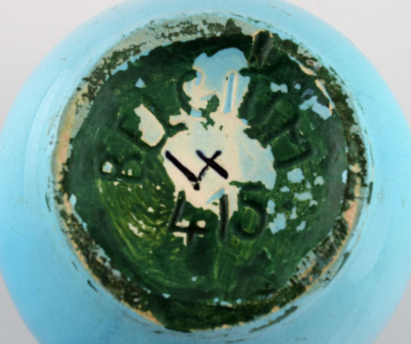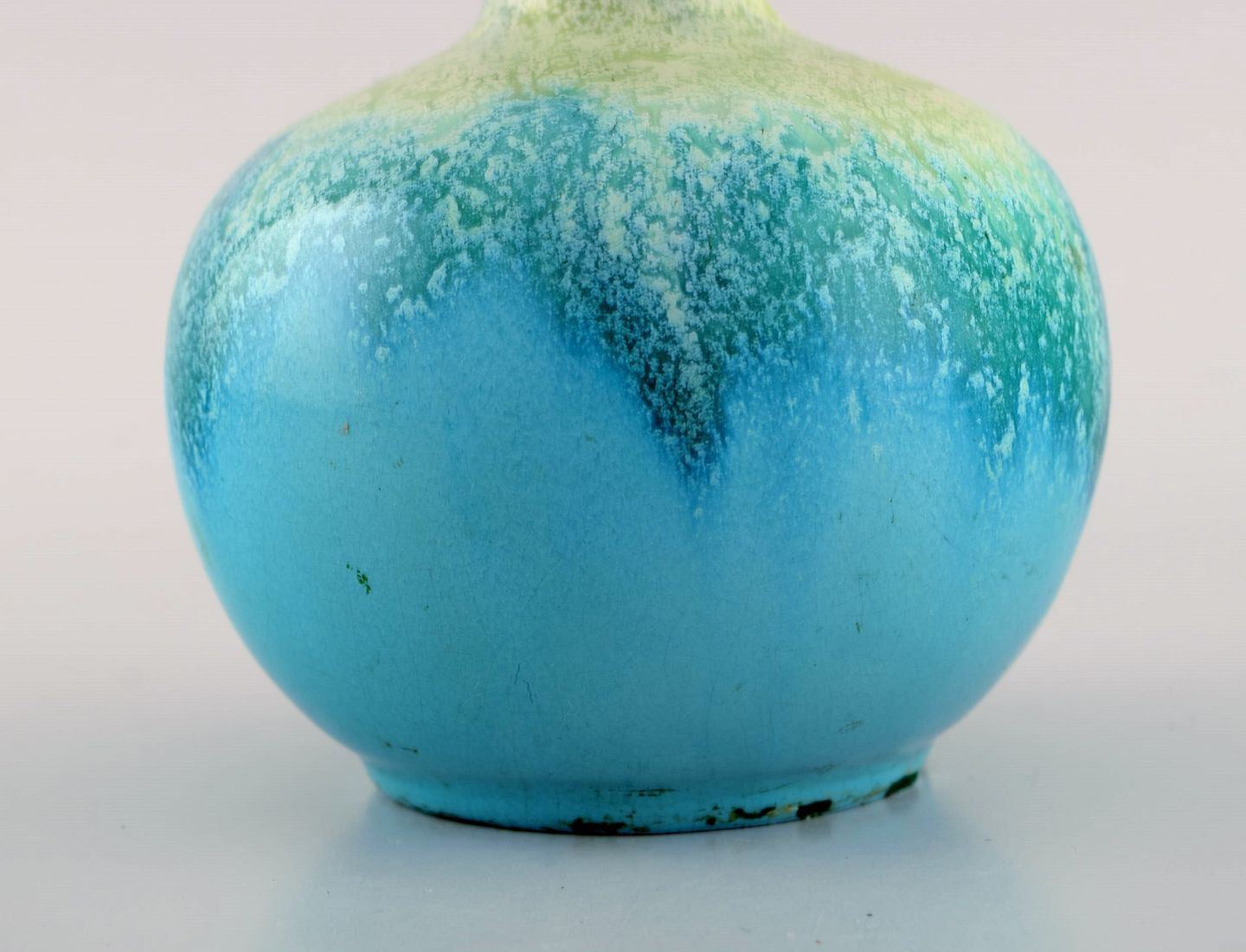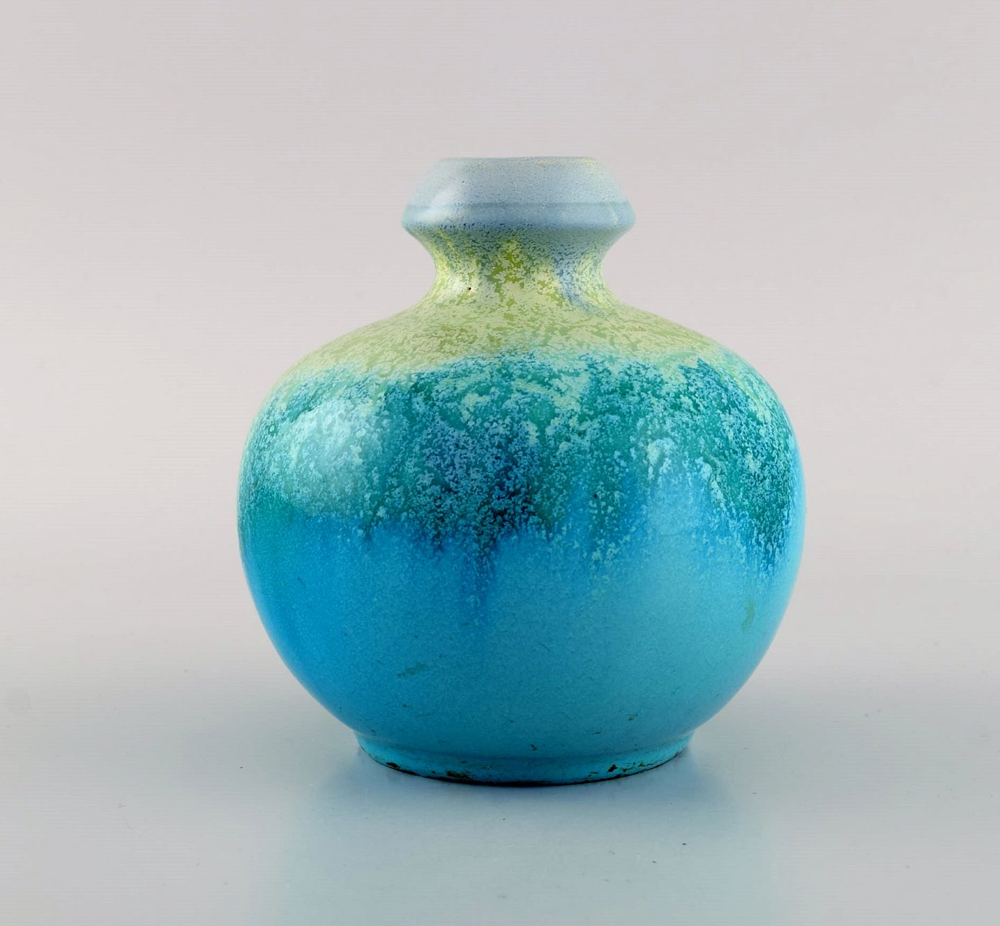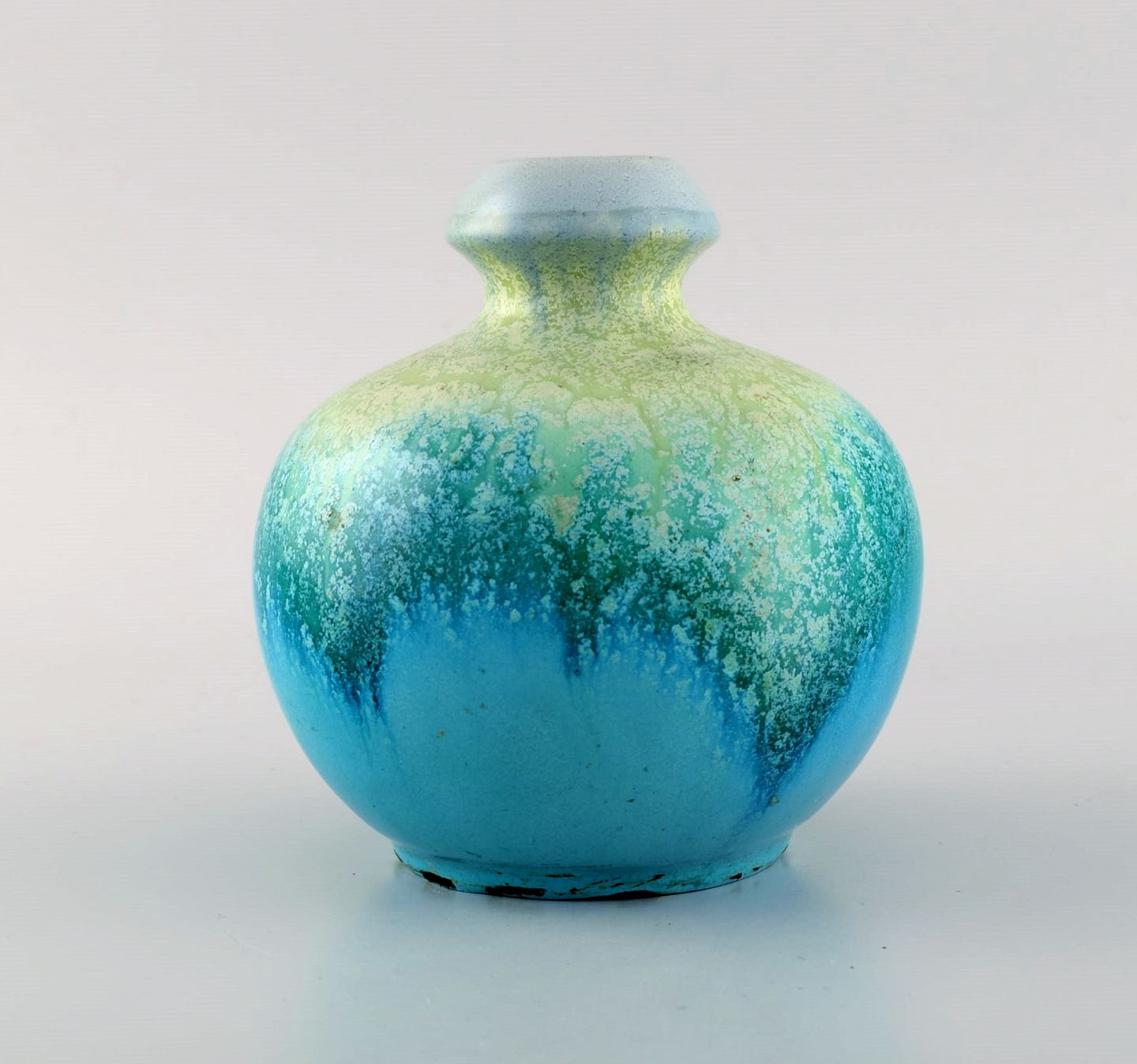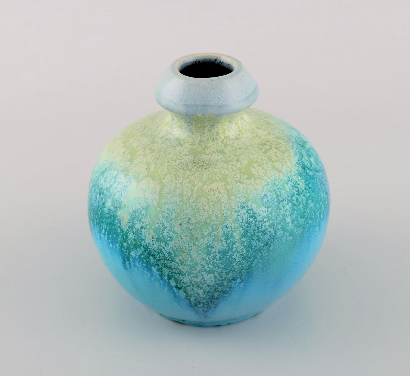 Belgisk studio keramiker. Rund vase i glaseret keramik. Smuk krystalglasur turkis nuancer. 1960/70'erne. Måler: 13 x 12,5 cm. I flot stand. Stemplet.