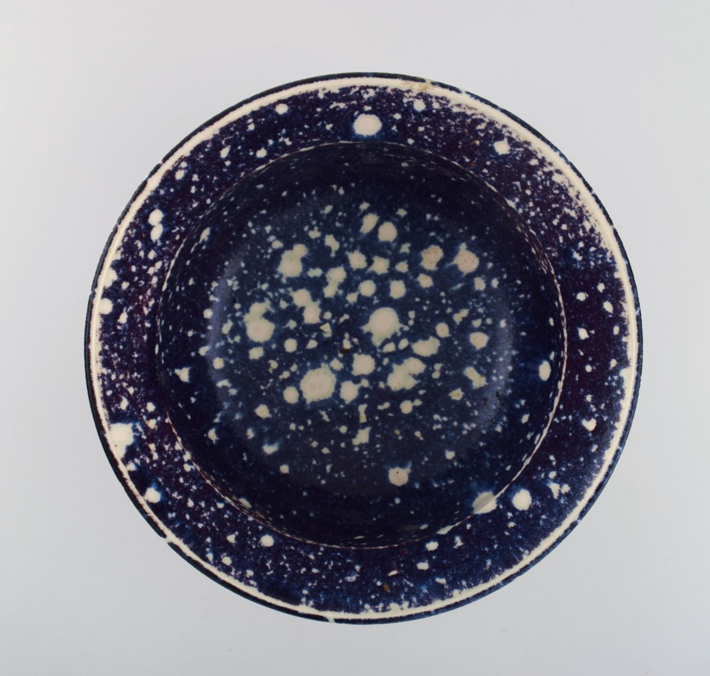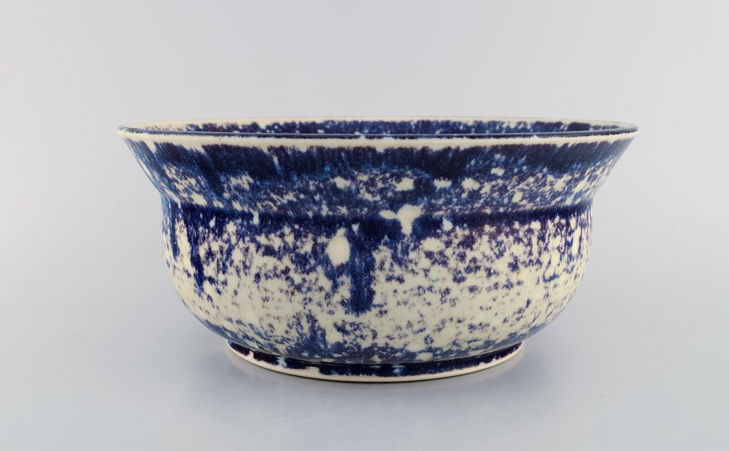 Europæisk studiokeramiker. Stor unika skål i glaseret keramik. Smuk spættet glasur i sand og lilla nuancer. Sent 1900-tallet. Måler: 27 x 12 cm. I flot stand. Signeret.