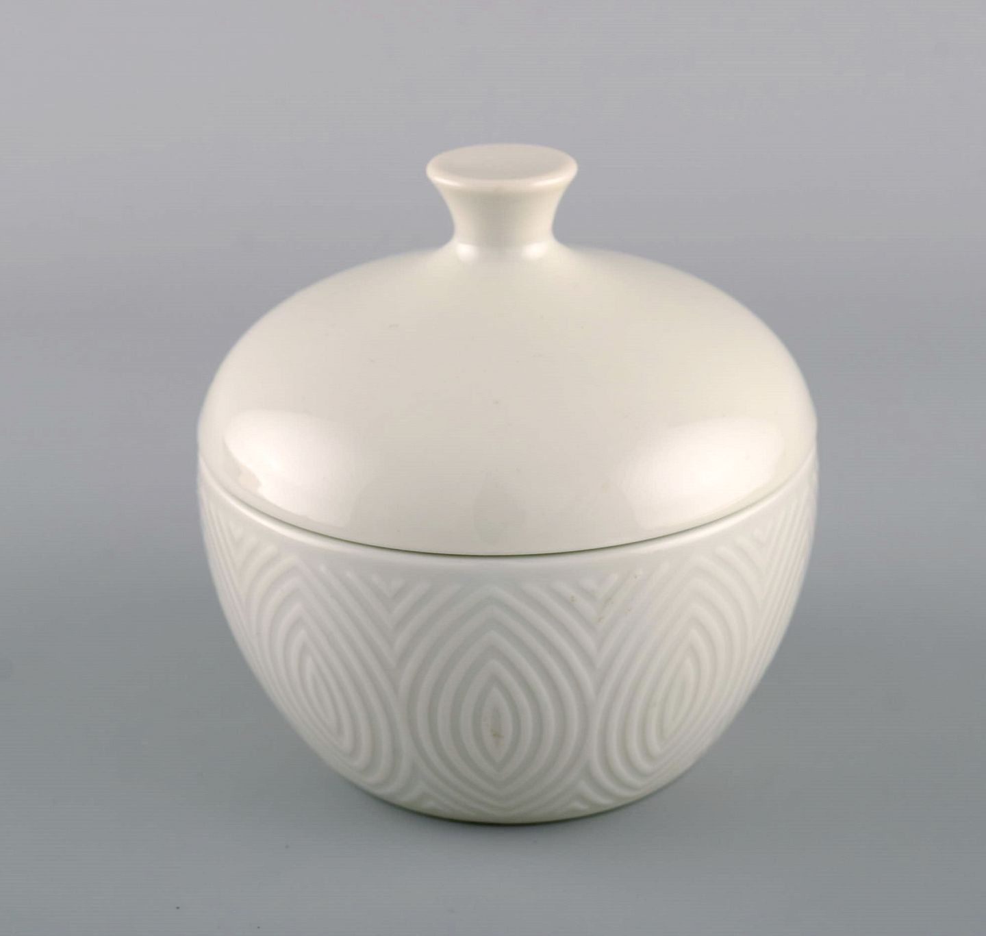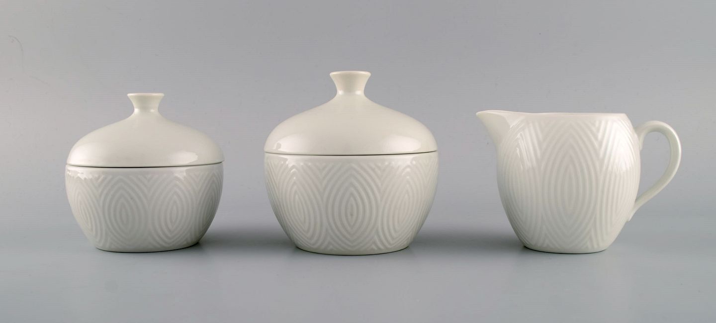 Royal Copenhagen. Salto Stel, Hvidt. To sukkerskåle og flødekande. 1960'erne. Stor sukkerskål måler: 10,8 x 10,5 cm. Flødekanden måler: 12,2 x 8,5 cm. I flot stand. 1. sortering. Tegnet af Axel Salto i 1956.