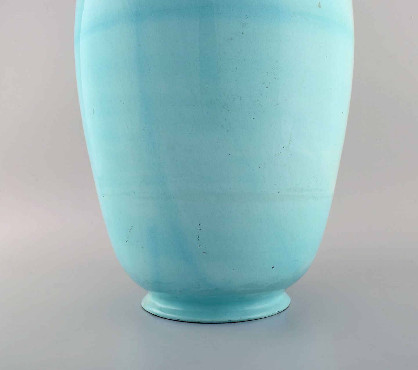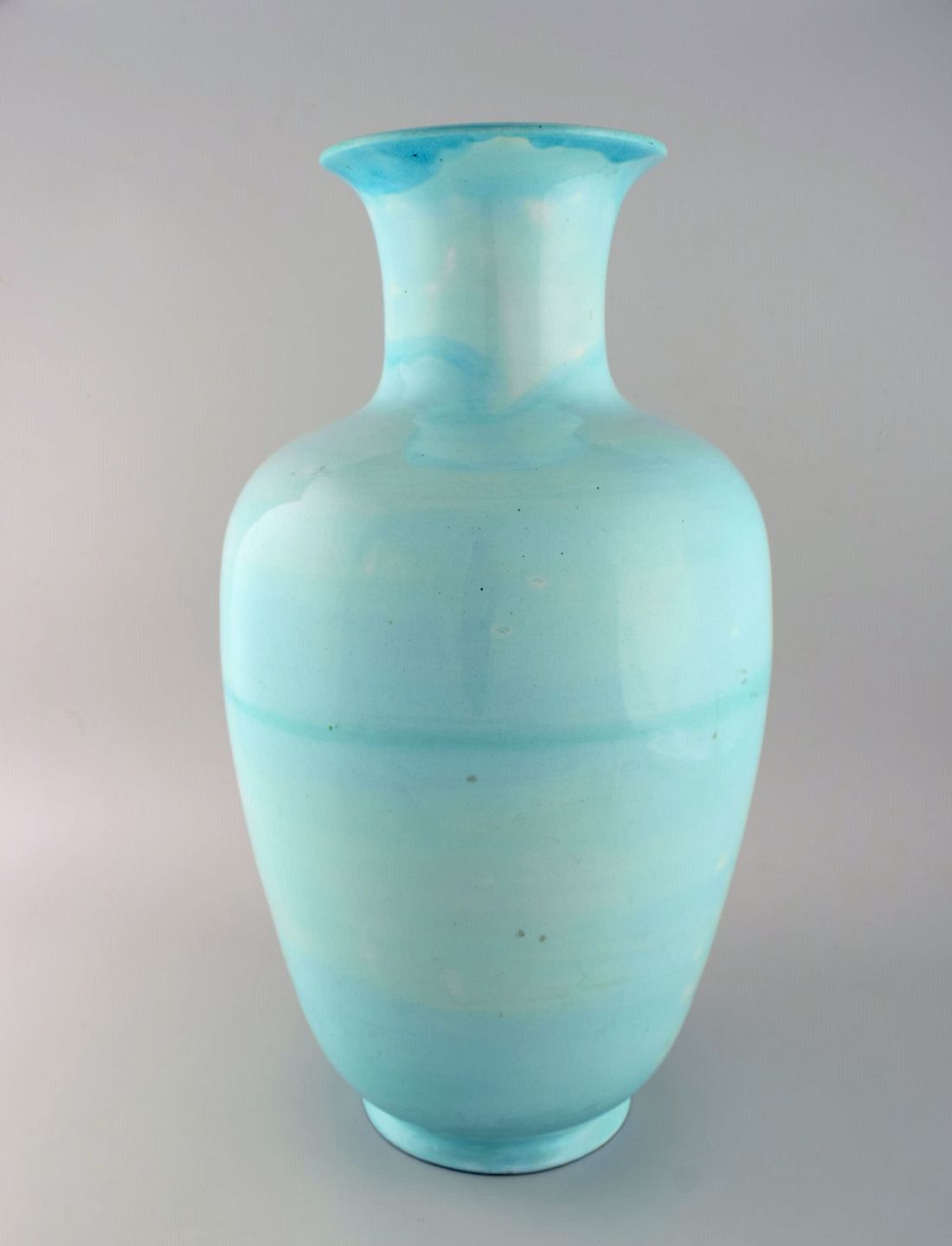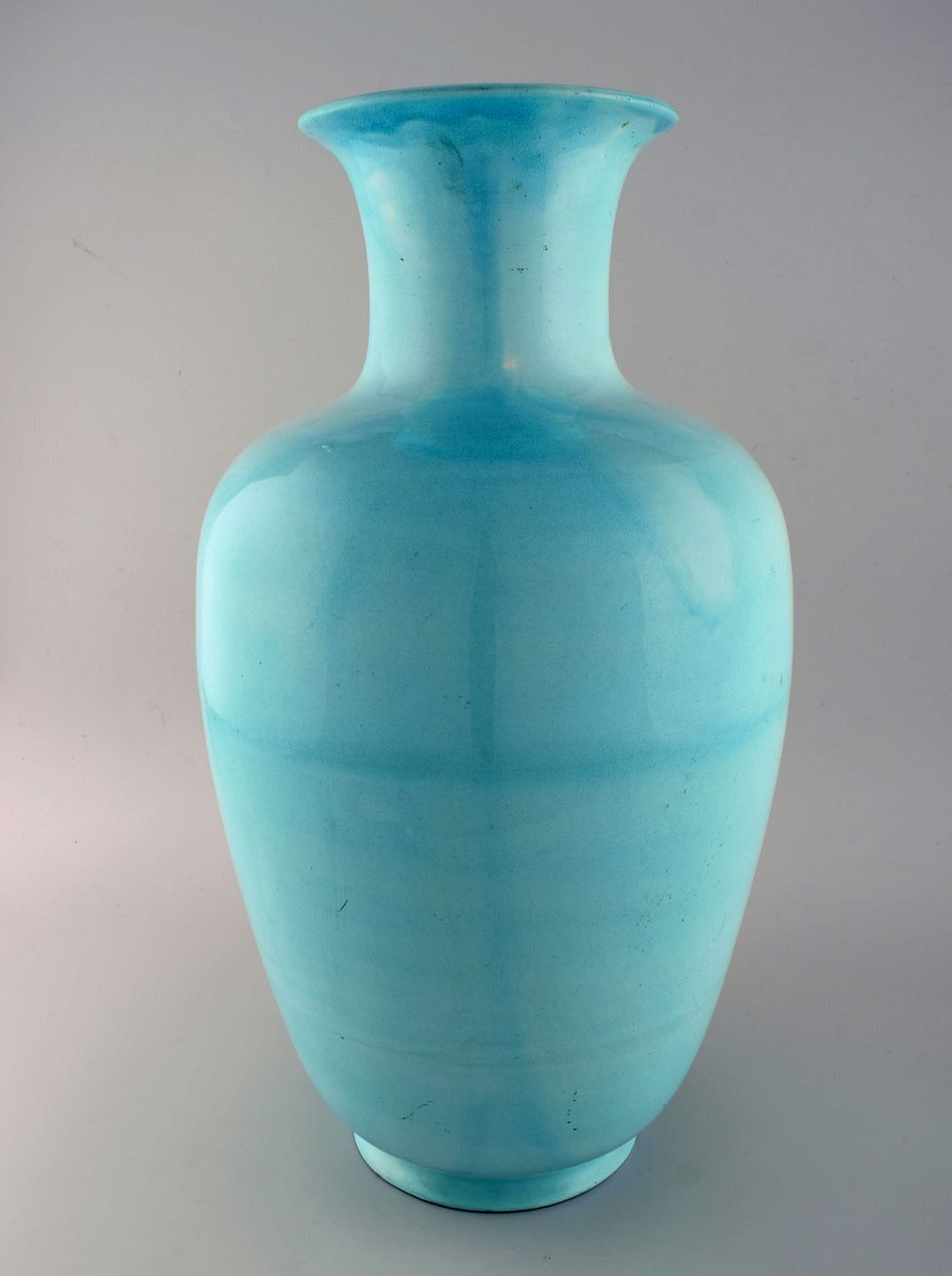 Gigantisk antik Zsolnay gulvvase i glaseret keramik. Smuk glasur i turkis nuancer. Dateret 1891-1895. Måler: 50 x 27 cm. I flot stand. Lille revne i glasuren fra produktionen. Stemplet.